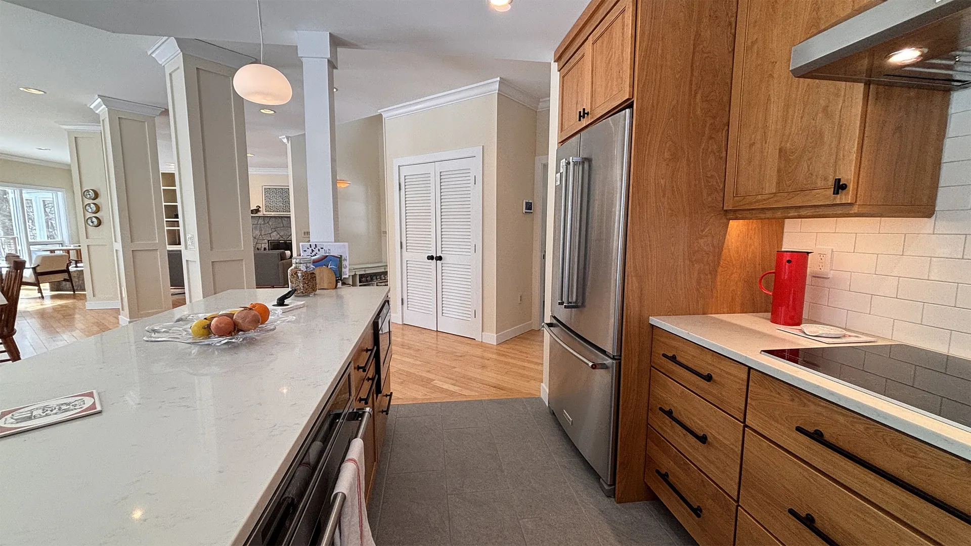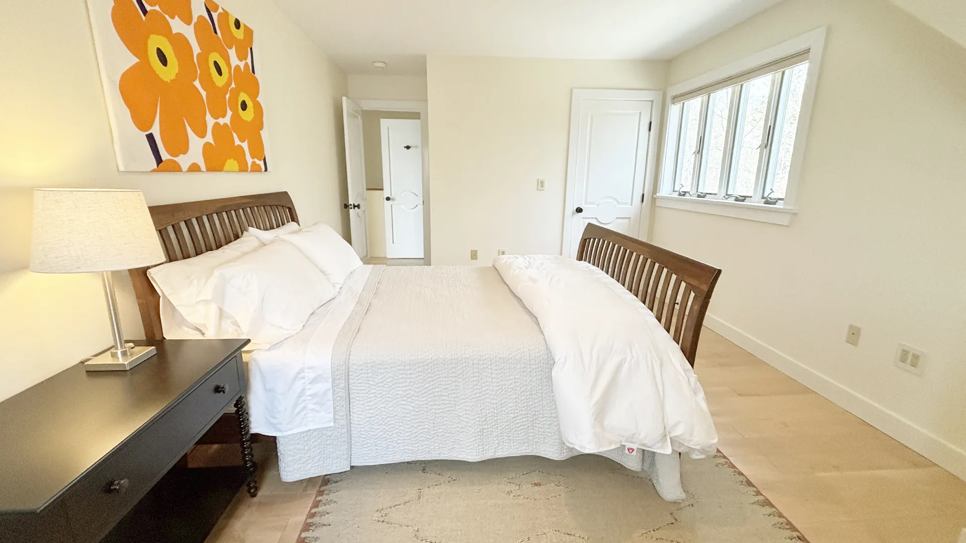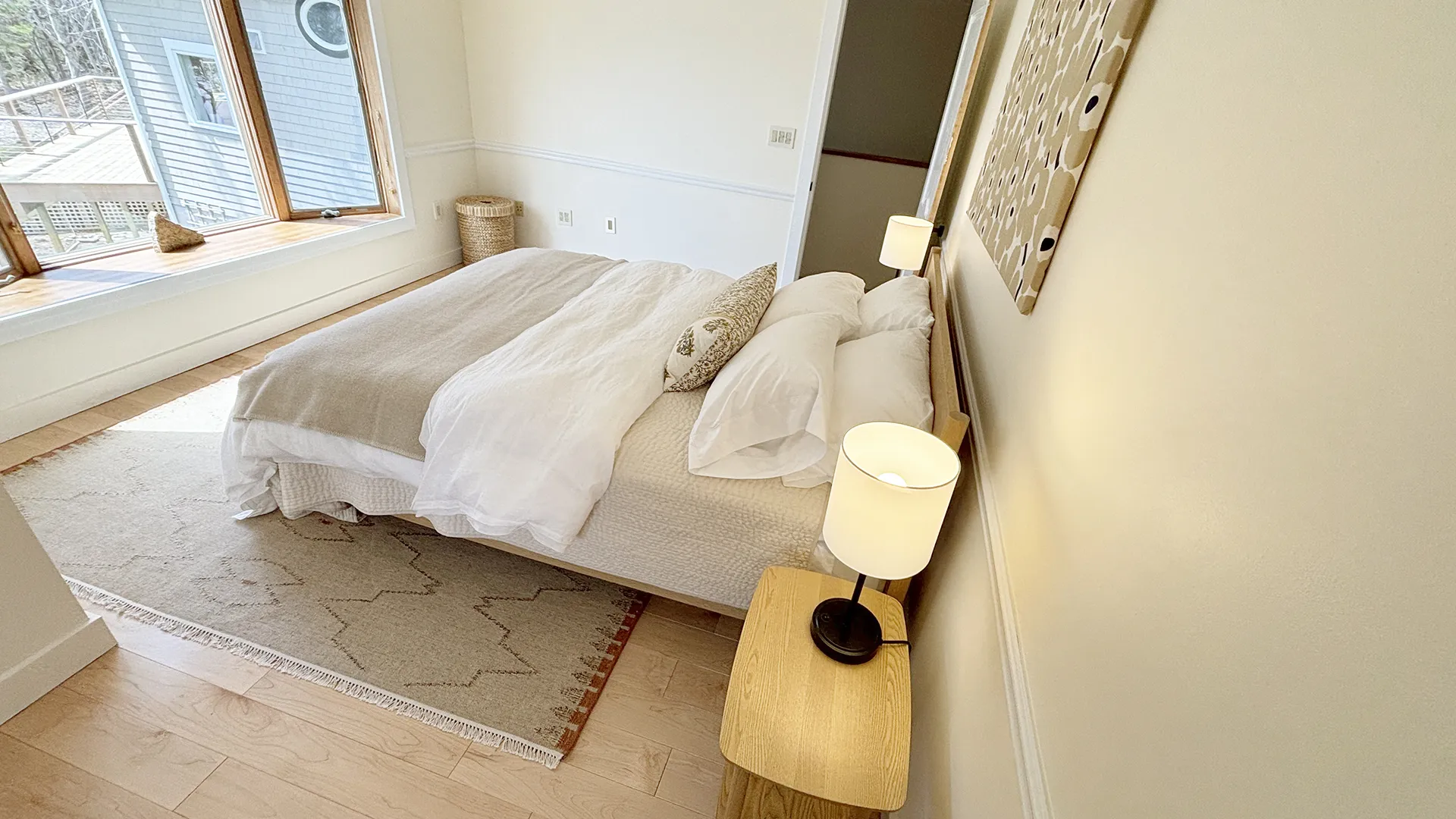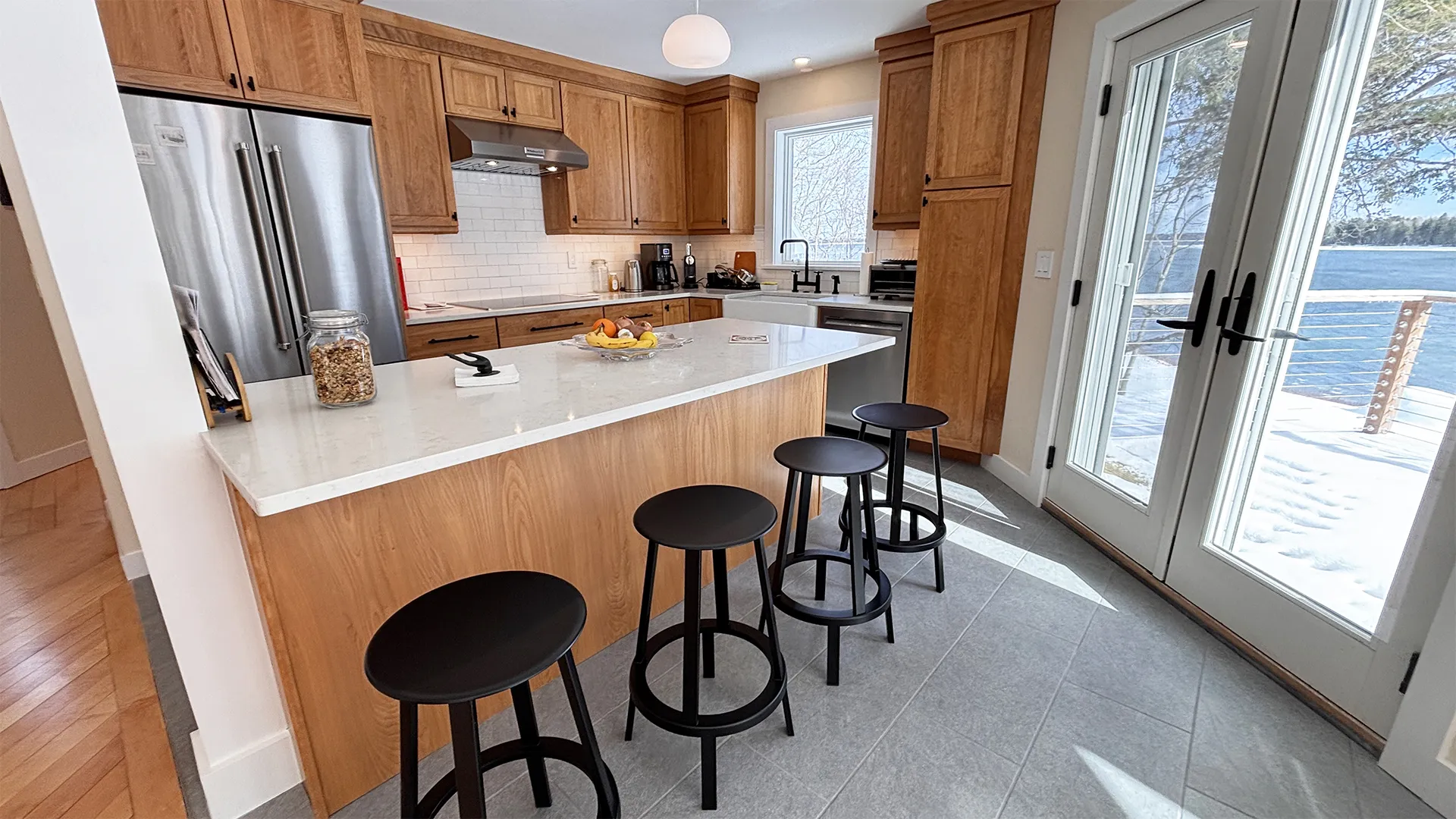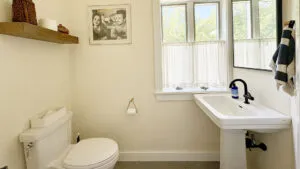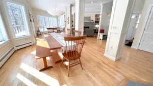 FIRST FLOOR: Entry opens onto a beautiful open space with sweeping views and a continuous Living, Dining, and newly renovated Kitchen area. Living Room features a fireplace, stereo unit, an eclectic library, lots of access to the deck, and plenty of comfortable seating overlooking the water. Dining area has a 7.5’ table to seat six comfortably (eight or more with 18” leaf extension). Kitchen enjoys a center island for cooking prep and is stocked with quality cookware, a sous-vide unit, panini press, rice cooker, yogurt maker, coffee and Nespresso makers. Island counter seats four. Half Bath and Laundry Room/Pantry are off the hall adjacent to the Kitchen.