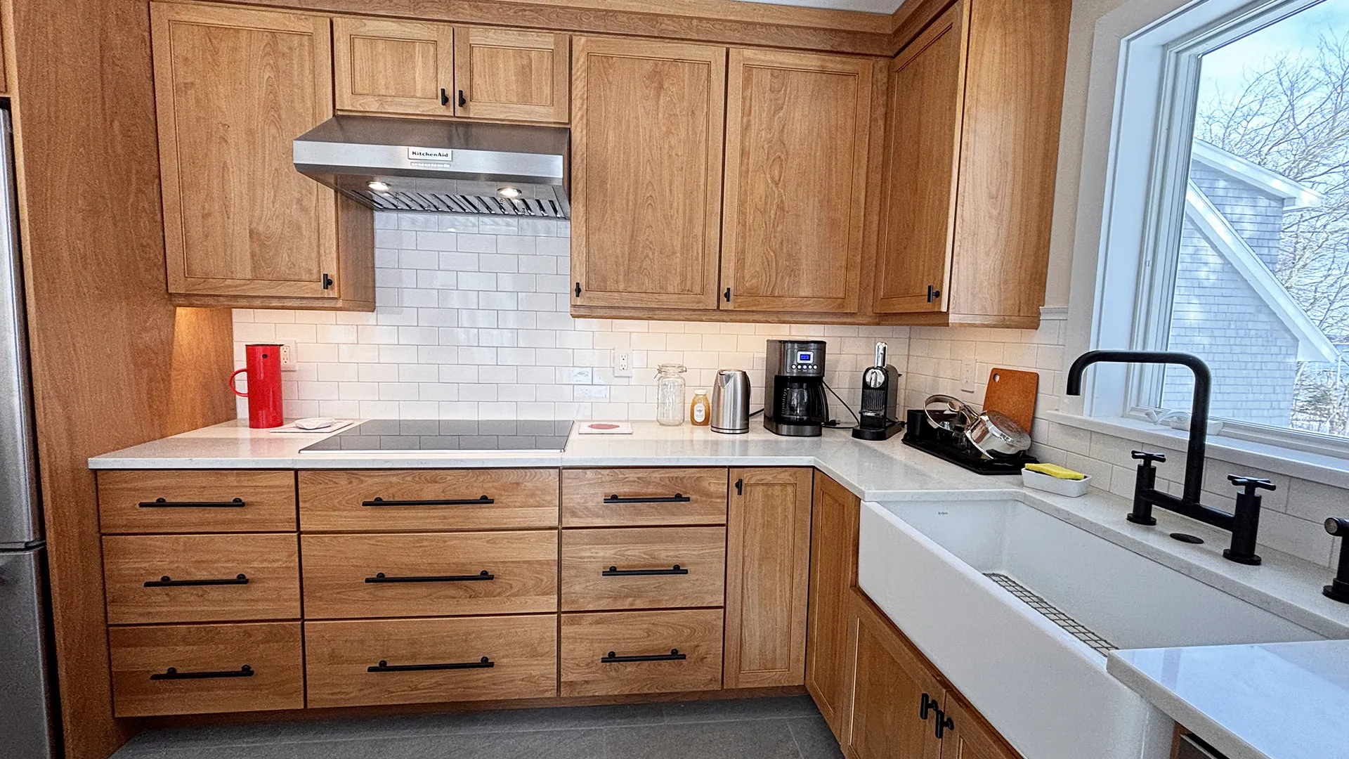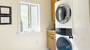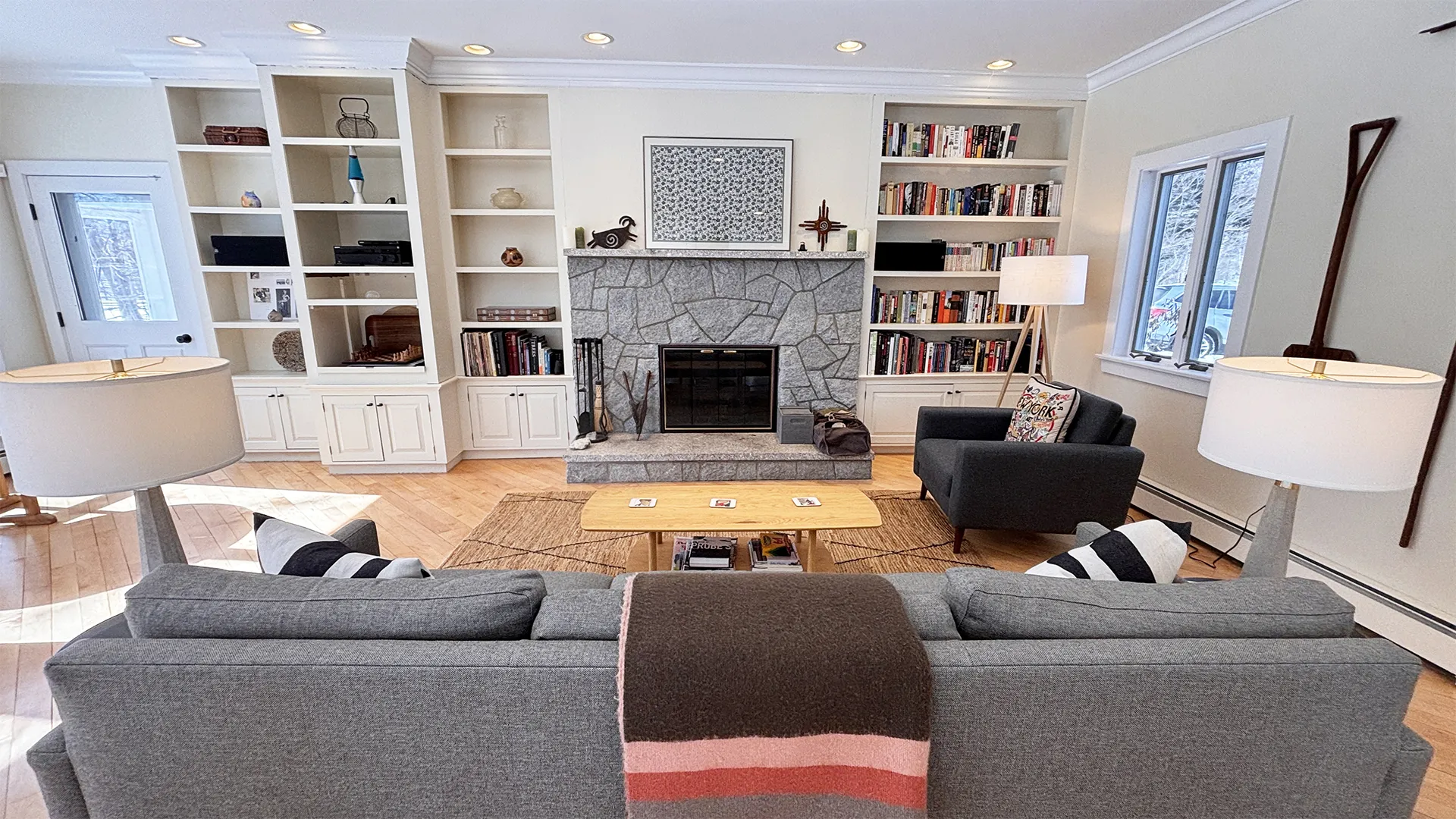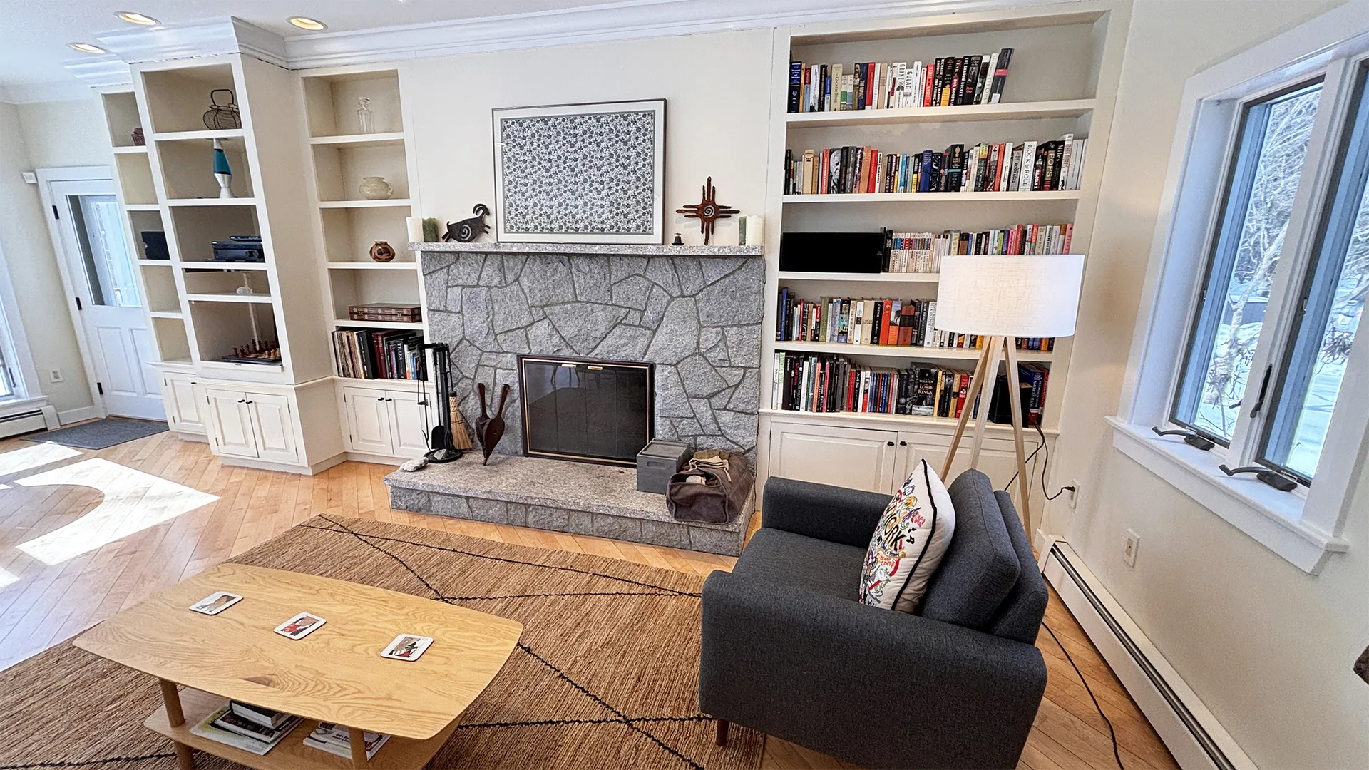 FIRST FLOOR: Entry opens onto a beautiful open space with sweeping views and a continuous Living, Dining, and newly renovated Kitchen area. Living Room features a fireplace, stereo unit, an eclectic library, lots of access to the deck, and plenty of comfortable seating overlooking the water. Dining area has a 7.5’ table to seat six comfortably (eight or more with 18” leaf extension). Kitchen enjoys a center island for cooking prep and is stocked with quality cookware, a sous-vide unit, panini press, rice cooker, yogurt maker, coffee and Nespresso makers. Island counter seats four. Half Bath and Laundry Room/Pantry are off the hall adjacent to the Kitchen.