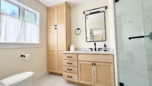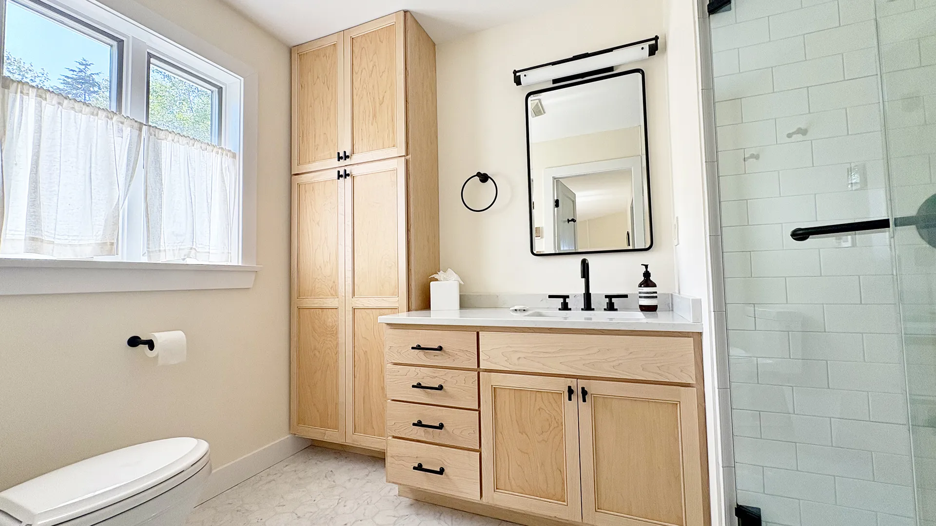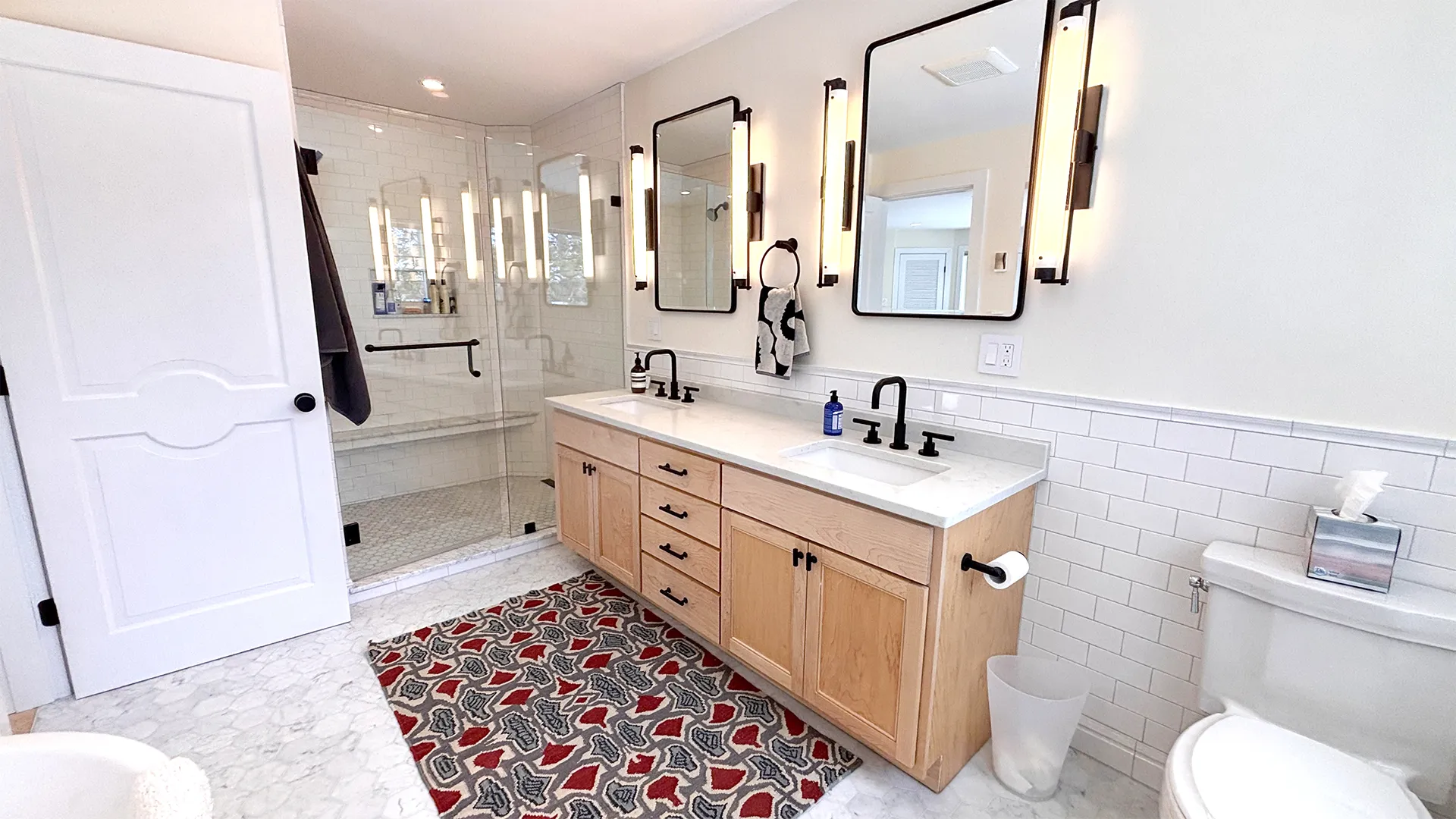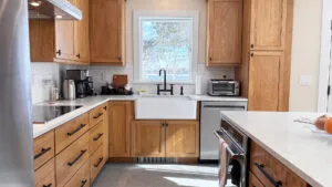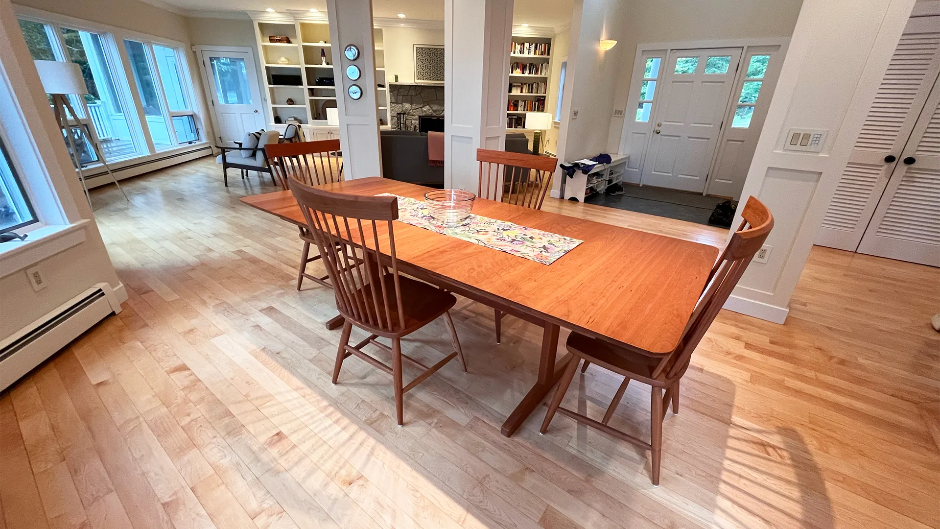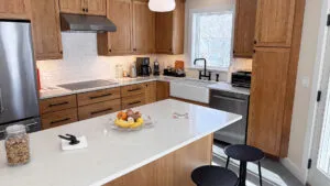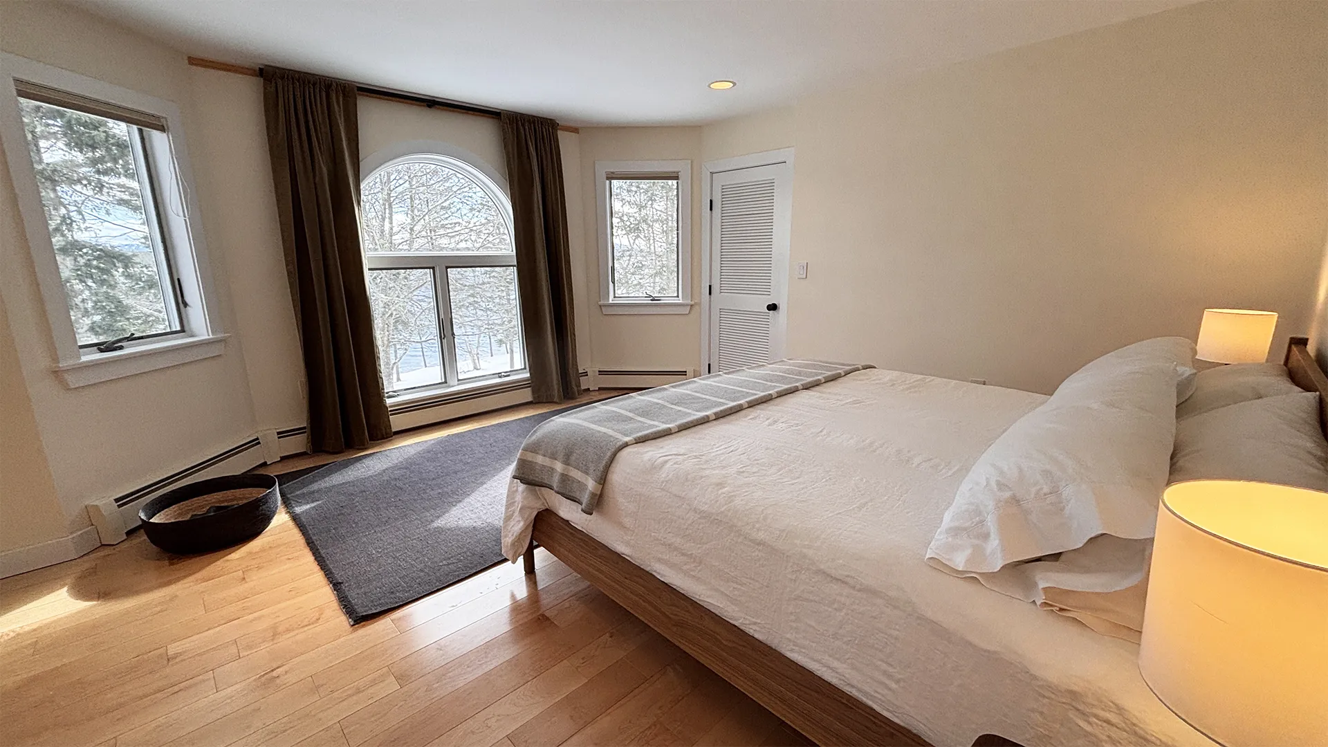 FIRST FLOOR: Entry opens onto a beautiful open space with sweeping views and a continuous Living, Dining, and newly renovated Kitchen area. Living Room features a fireplace, stereo unit, an eclectic library, lots of access to the deck, and plenty of comfortable seating overlooking the water. Dining area has a 7.5’ table to seat six comfortably (eight or more with 18” leaf extension). Kitchen enjoys a center island for cooking prep and is stocked with quality cookware, a sous-vide unit, panini press, rice cooker, yogurt maker, coffee and Nespresso makers. Island counter seats four. Half Bath and Laundry Room/Pantry are off the hall adjacent to the Kitchen.