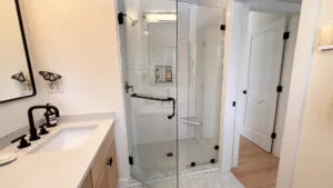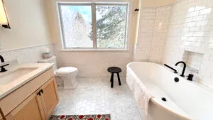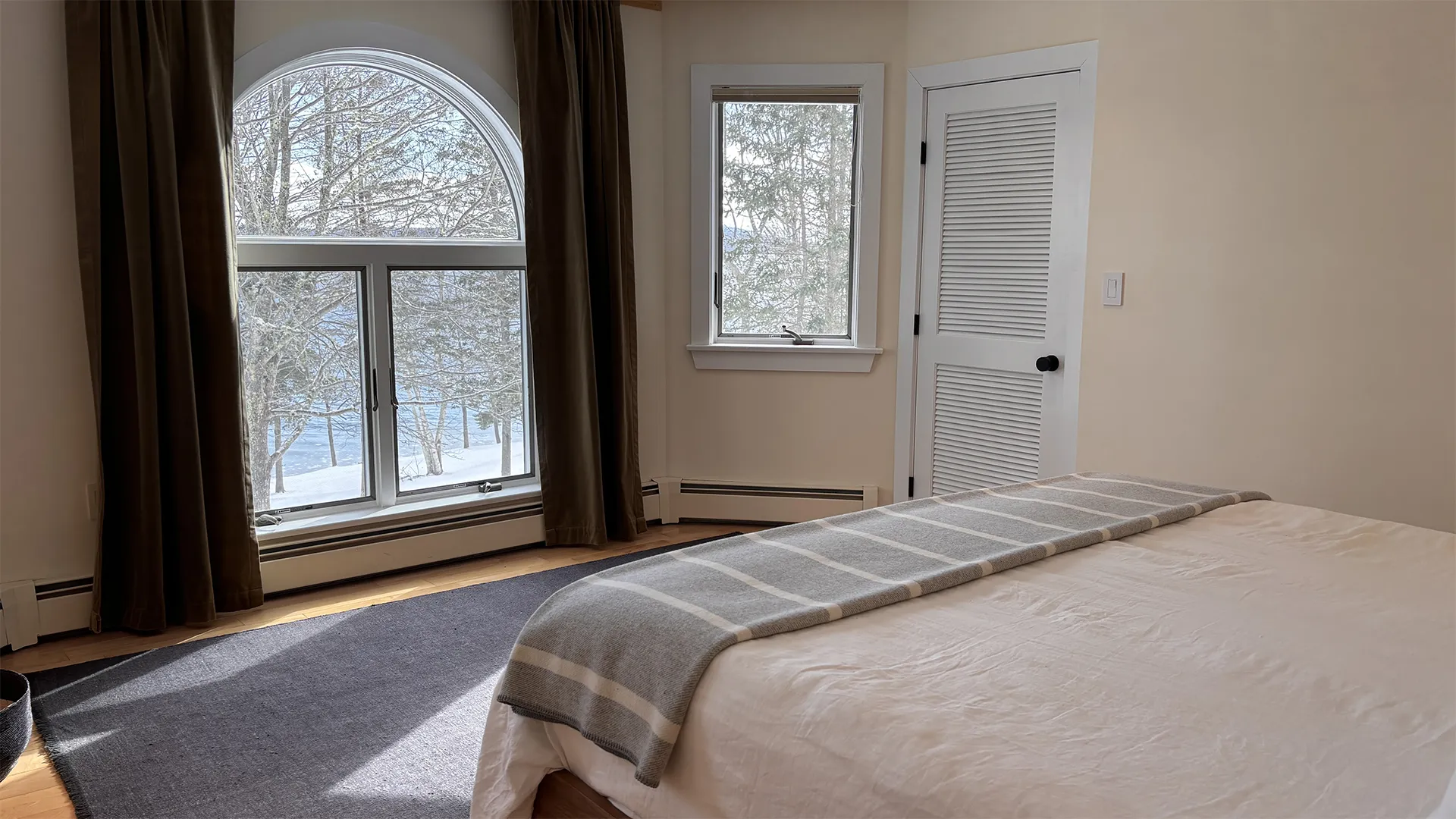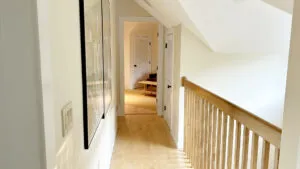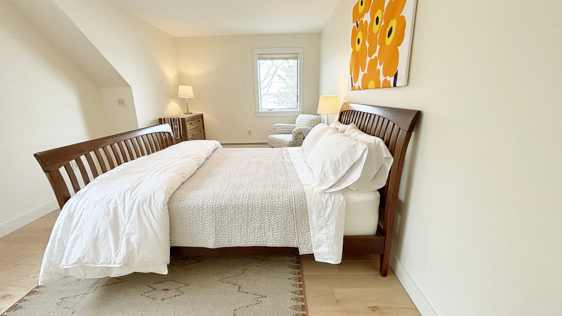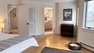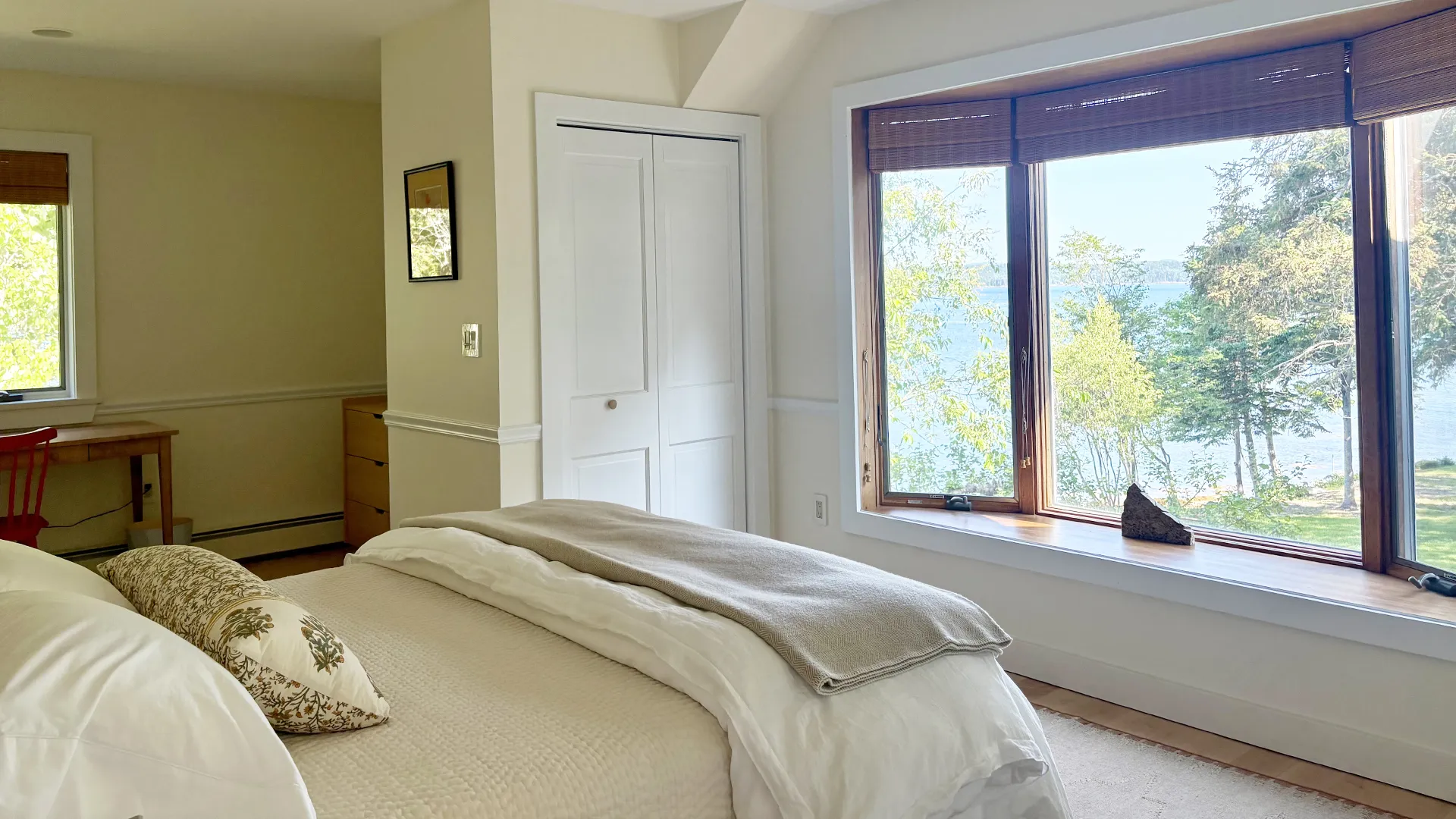 SECOND FLOOR: Accessed by a half flight of stairs, the Guest Wing features two bedrooms, each with a Queen bed, both with water views and full closets, and one with a desk area. These bedrooms share a newly renovated Full Bath with walk-in shower. A second half flight of stairs leads to the Primary Bedroom with King Bed and en suite fully renovated Bath with separate soaking tub and glass-walled shower. Down a short hallway, a Den with TV, DVD player, stereo unit, work area with standing desk, monitor and printer, and water views provides a quiet spot for enjoying a movie, listening to music, reading, or catching up on your emails! Sofa opens to a double bed for extra sleeping space, suitable for a child or young adult. (Note that the sofa bed is not intended to increase the maximum occupancy above six.)