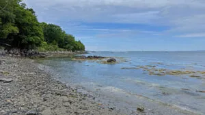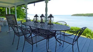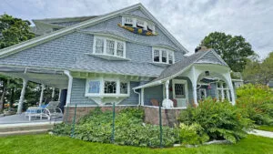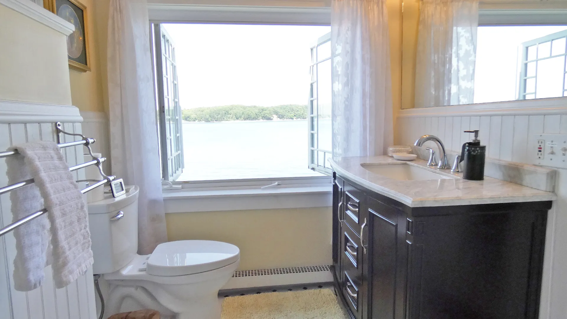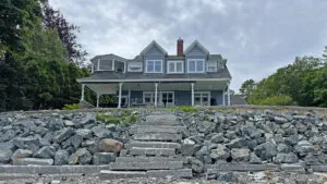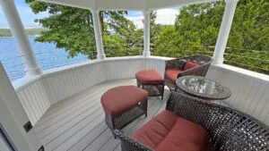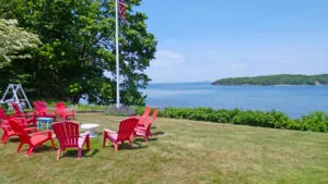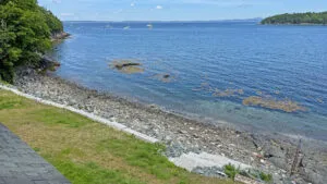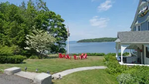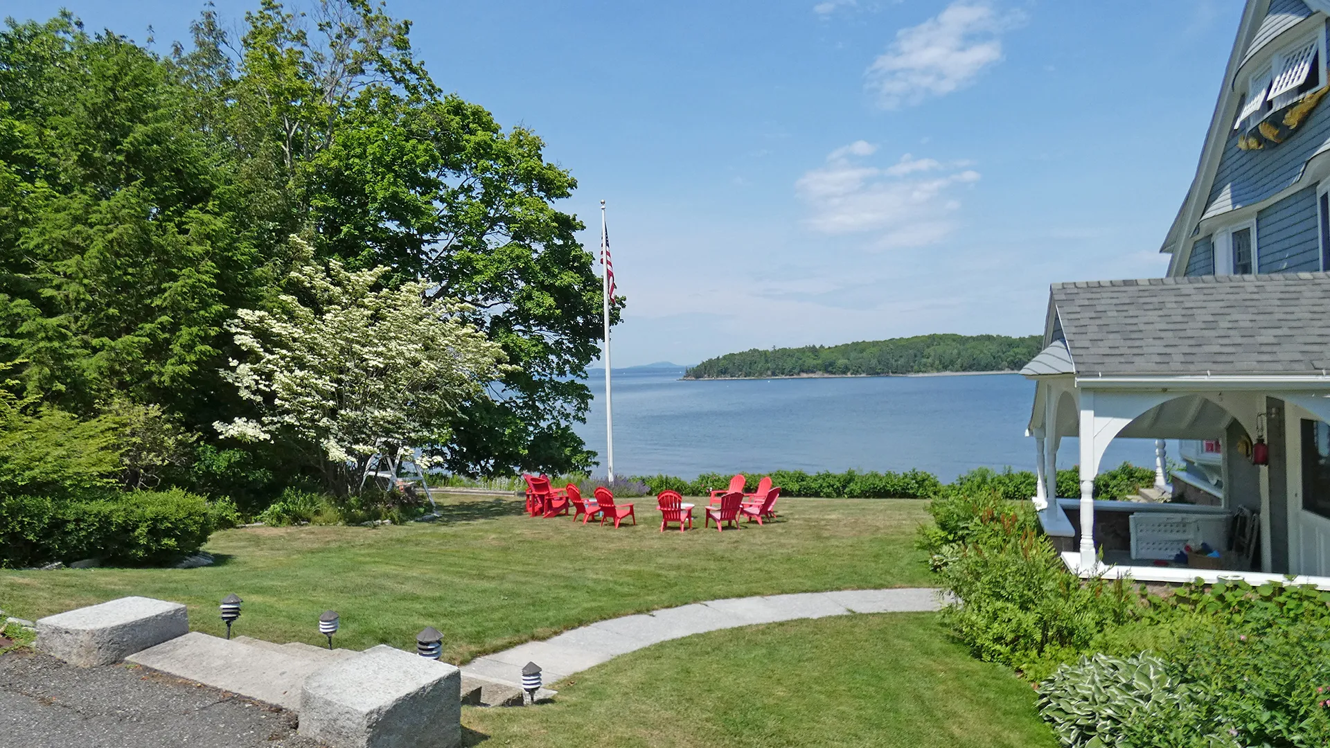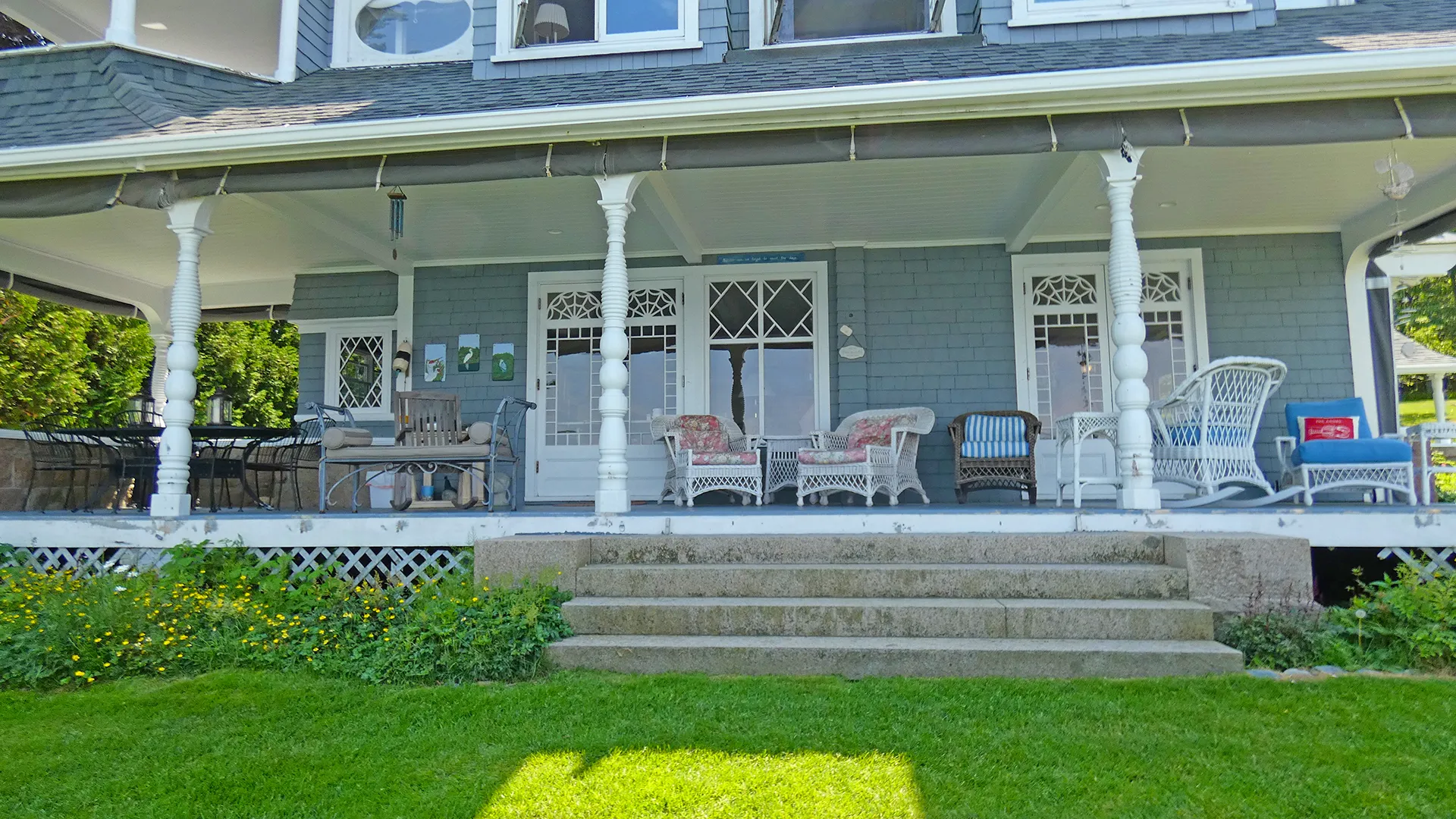 OUTDOOR SPACES: Spacious and furnished covered porch off the first-floor with stereo and optional enclosures for inclement weather. Porch overlooks Frenchman’s Bay, Bar Harbor, and the outer islands, as well as the lawn and garden area. Patio down by the seawall. Small covered porch off Primary Bedroom with chair swing and beautiful views.
