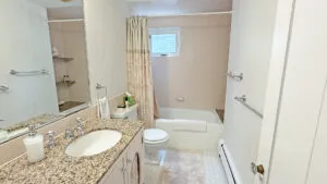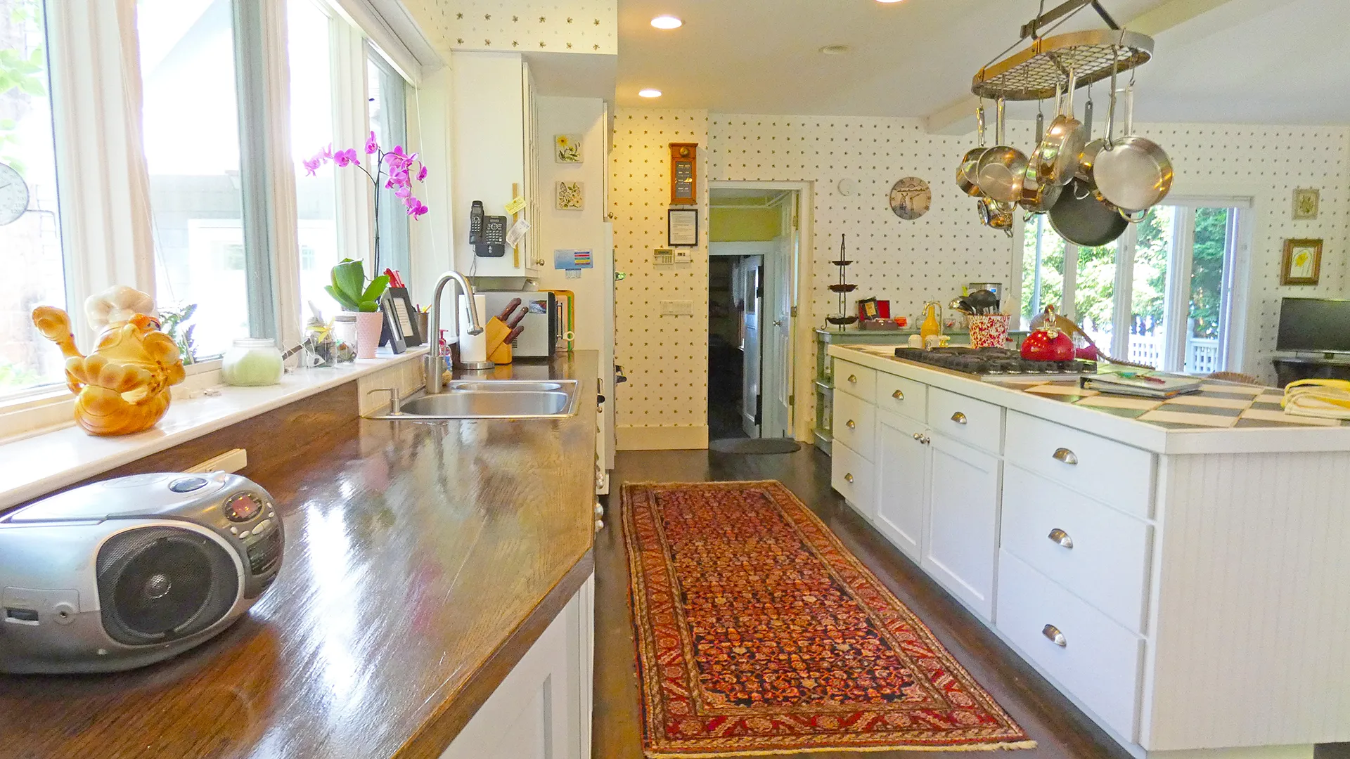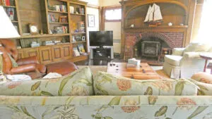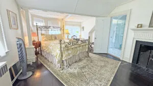 FIRST FLOOR: Formal Living Room with gas insert fireplace and nearby Parlor each enjoy shoreline and garden views and separate exits to a large covered porch overlooking the Bay, the perfect spot for relaxing and entertaining! Large formal Library with numerous seating area and a gas insert fireplace and formal Dining Room. Very spacious and fully updated eat-in kitchen with nearby Butler’s Pantry boasts a large island, dining for eight, and a garden entrance. Bathroom with combined tub and shower.