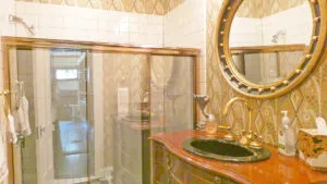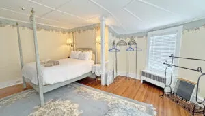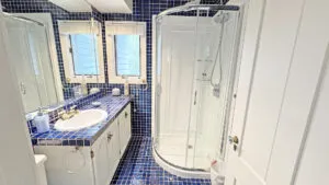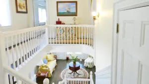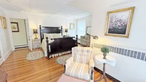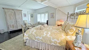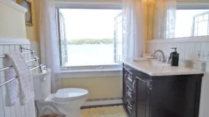 SECOND FLOOR: Two Primary Bedrooms, one with a King bed, covered porch and gas fireplace, and the other with a Queen bed– both with separate private Baths with Showers, and shoreline views of Bar Harbor and outer islands. Bedroom with four poster Queen Bed, settee, slight water view. Bedroom with Queen Bed, sitting area and slight water view. Shared Bathroom with combined tub and shower sits along the hallway. Fifth Bedroom with two Twins that can be converted to a king and sixth Bedroom with Queen and water view. Shared hallway Bathroom with combined tub and shower. Seventh Bedroom with Full bed.