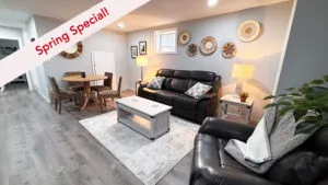 FIRST FLOOR: Enter through a private entry and step down to the lower level. To the left, a large, comfortable living space with large screened TV, recliners, and a table that comfortably seats four. A newly re-done Kitchen features all new appliances, washer dryer, and plenty of counter space for meal prep. Step up to the small, but serviceable, Full Bath with walk in custom tiled shower. Two Bedrooms, one with a Queen and one with a Double Bed are cozy and bright. Worries about the lack of AC? Not an issue – given its lower level situation, this space is quite cool in the summer and additional fans will ensure your comfort when required.