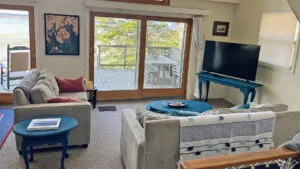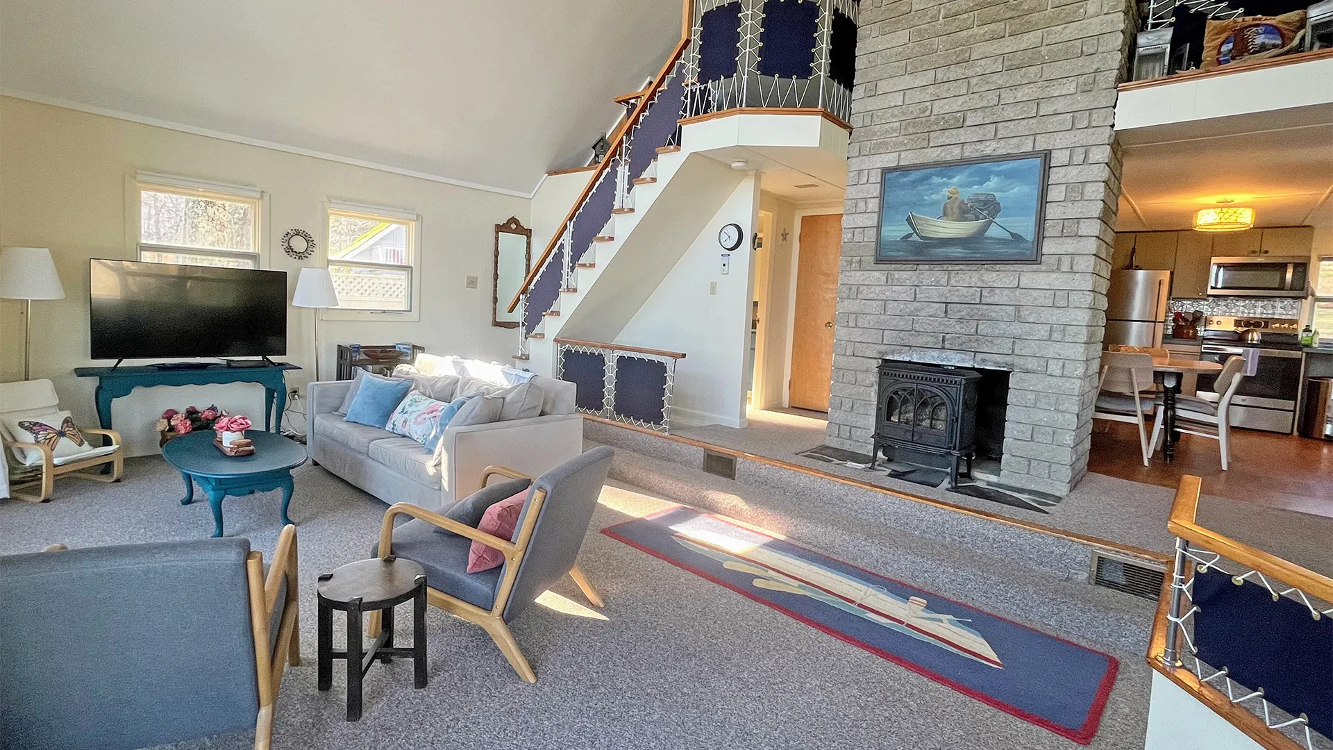 FIRST FLOOR: Enter from a furnished back deck to an Eat-in Kitchen with seating for six. A Bedroom off the kitchen offers a Queen bed. Step down to a Living Room designed to showcase the views, with gas fireplace, Twin sleeper sofa, and two sets of sliding doors which open to the furnished deck. Also off the kitchen is a Full Bathroom with tub and shower.
