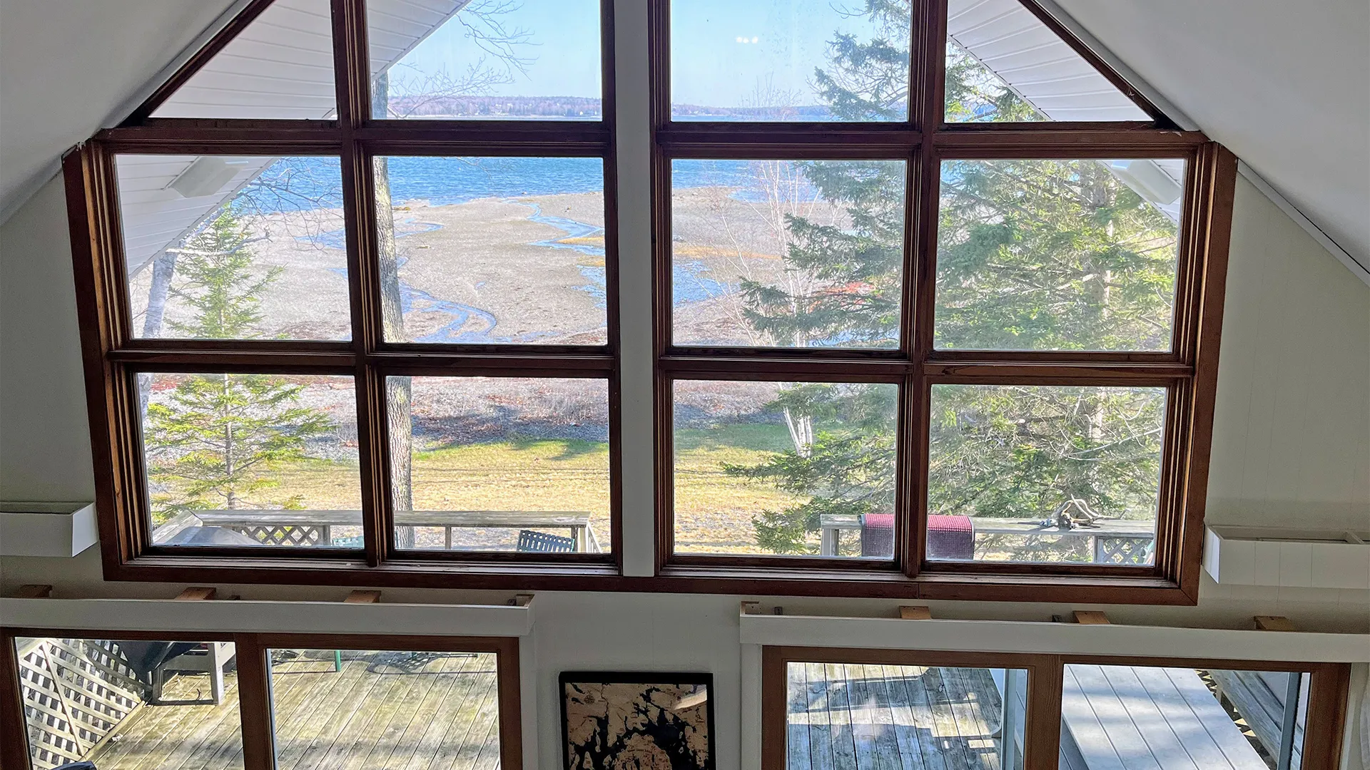 SECOND FLOOR: Lofted to below, the upstairs Bedroom offers a King bed, two XL Twin beds, and views of the water through a bank of windows designed to illustrate the setting and flood the space with light.