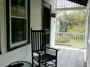 OUTDOOR SPACES: Two porches, covered in front, and one along the side near the main entry. Back patio space with table and chairs, and picnic table. Shed available for bike storage. Attractive yard with a small stream running behind plus paths and trails that network towards the golf course for walking.