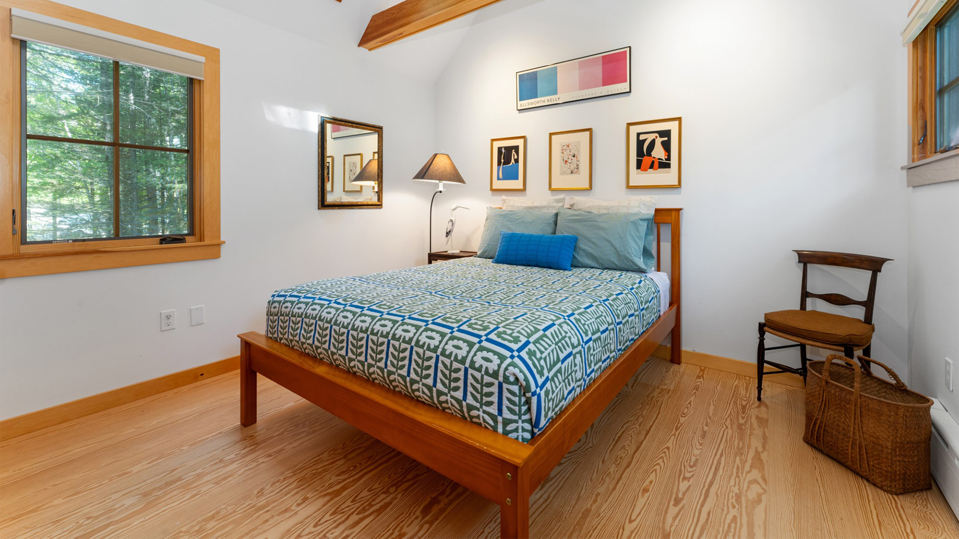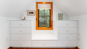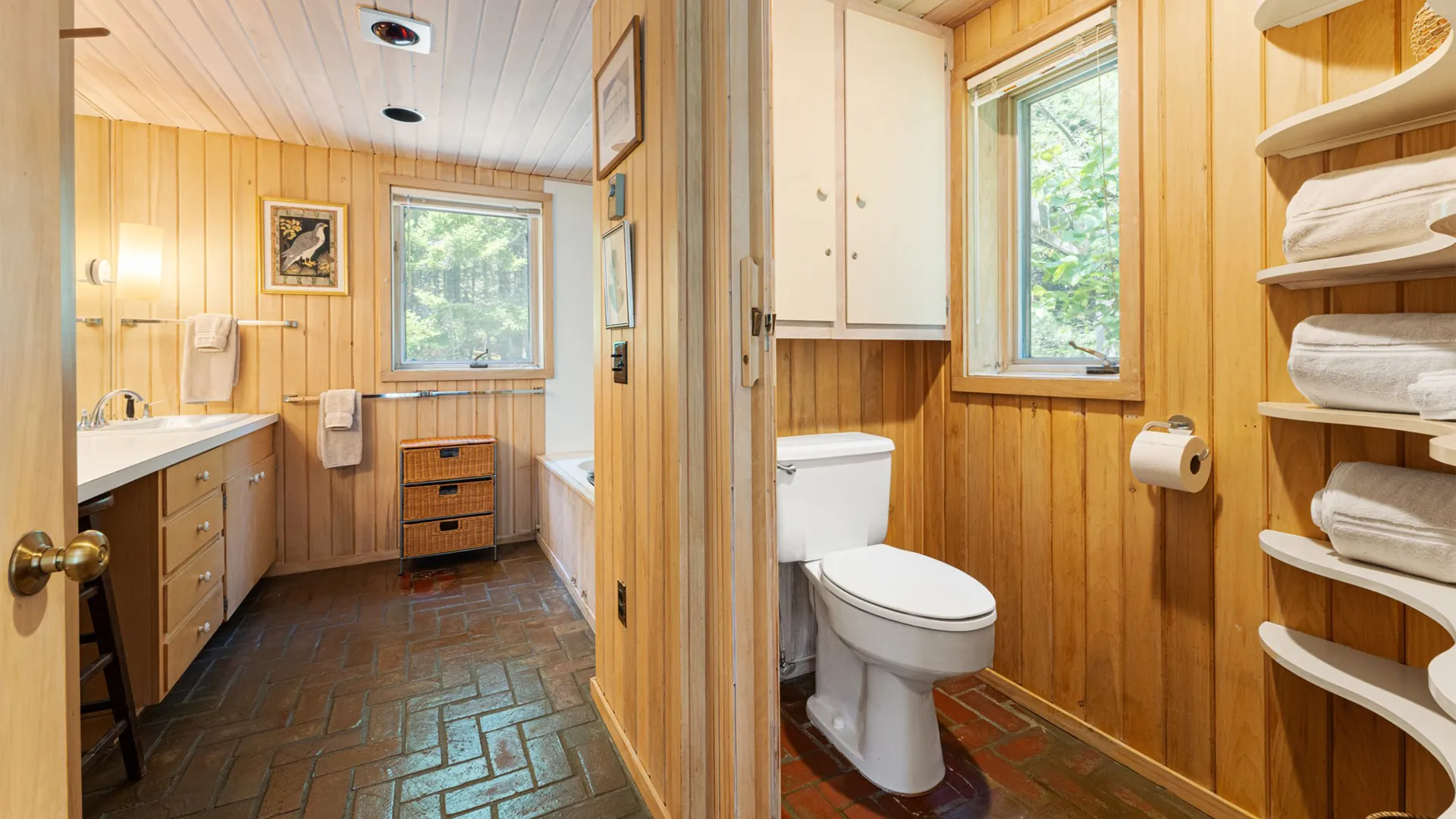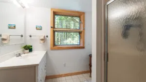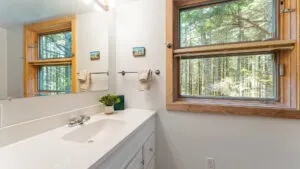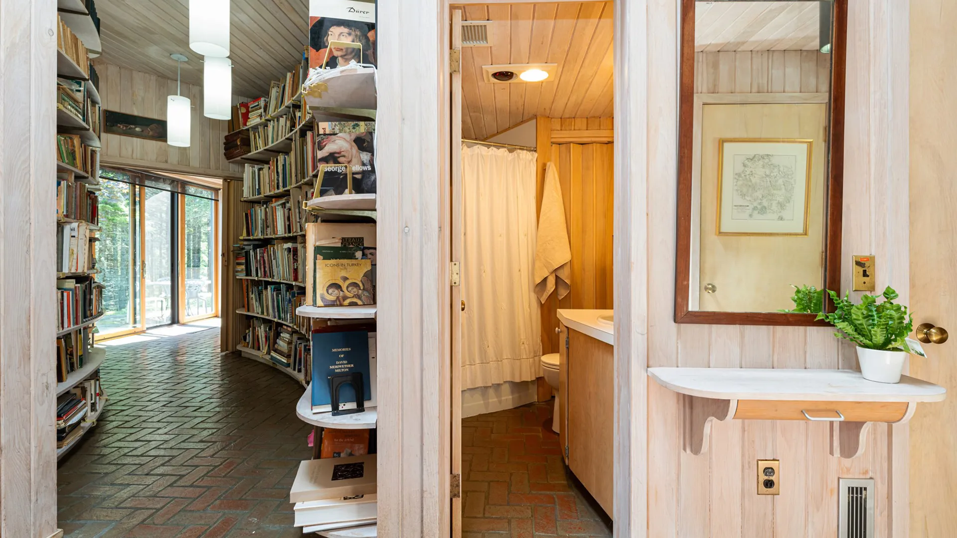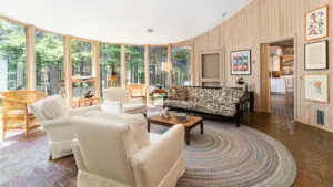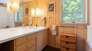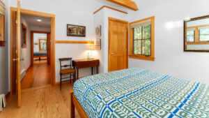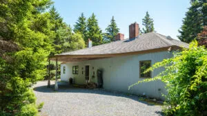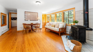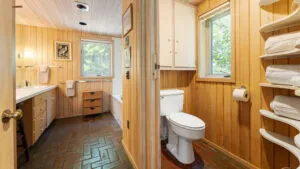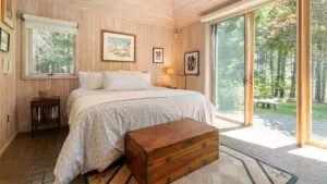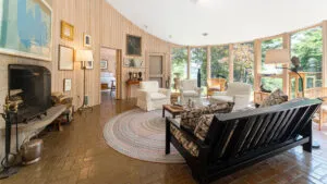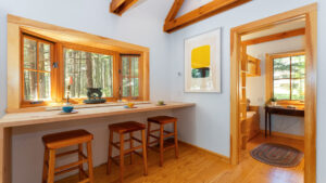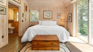 FIRST FLOOR: Designed by Wallace Harrison, Dodge Point Main House features curving walls that create flow and movement from one room to the next. Informal entry from the driveway leads to a laundry area that opens to a well equipped eat-in Kitchen with pretty water views and table that seats six, eight in a pinch. Living Room with vaulted slanted ceiling, curving windows overlooking the water, and plenty of comfortable seating focused around the granite fireplace. From the Living Room, the Primary Bedroom with King Bed and en suite Full Bath with jet tub and handheld shower. From the Bedroom, enter the curving Library which leads to Bedroom with Queen Bed and shared Full Bath with tub and shower across the hall. On the opposite end of the house, adjacent to the Kitchen is a third Bedroom with Trundle Bed and Shared Full Bath with shower stall. This bedroom is suitable for children or single adults. Note that the interior window separating this bedroom from the Kitchen can be shaded for privacy.GUEST HOUSE: