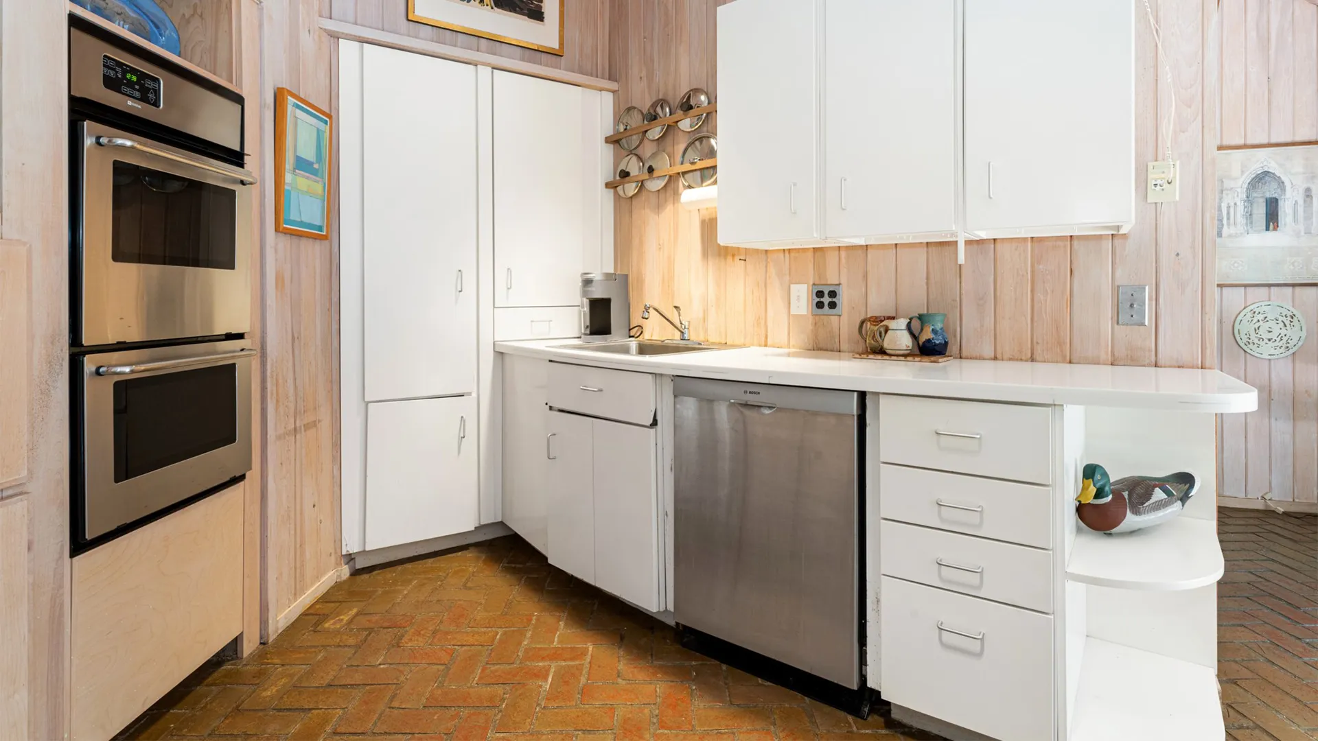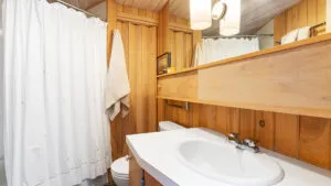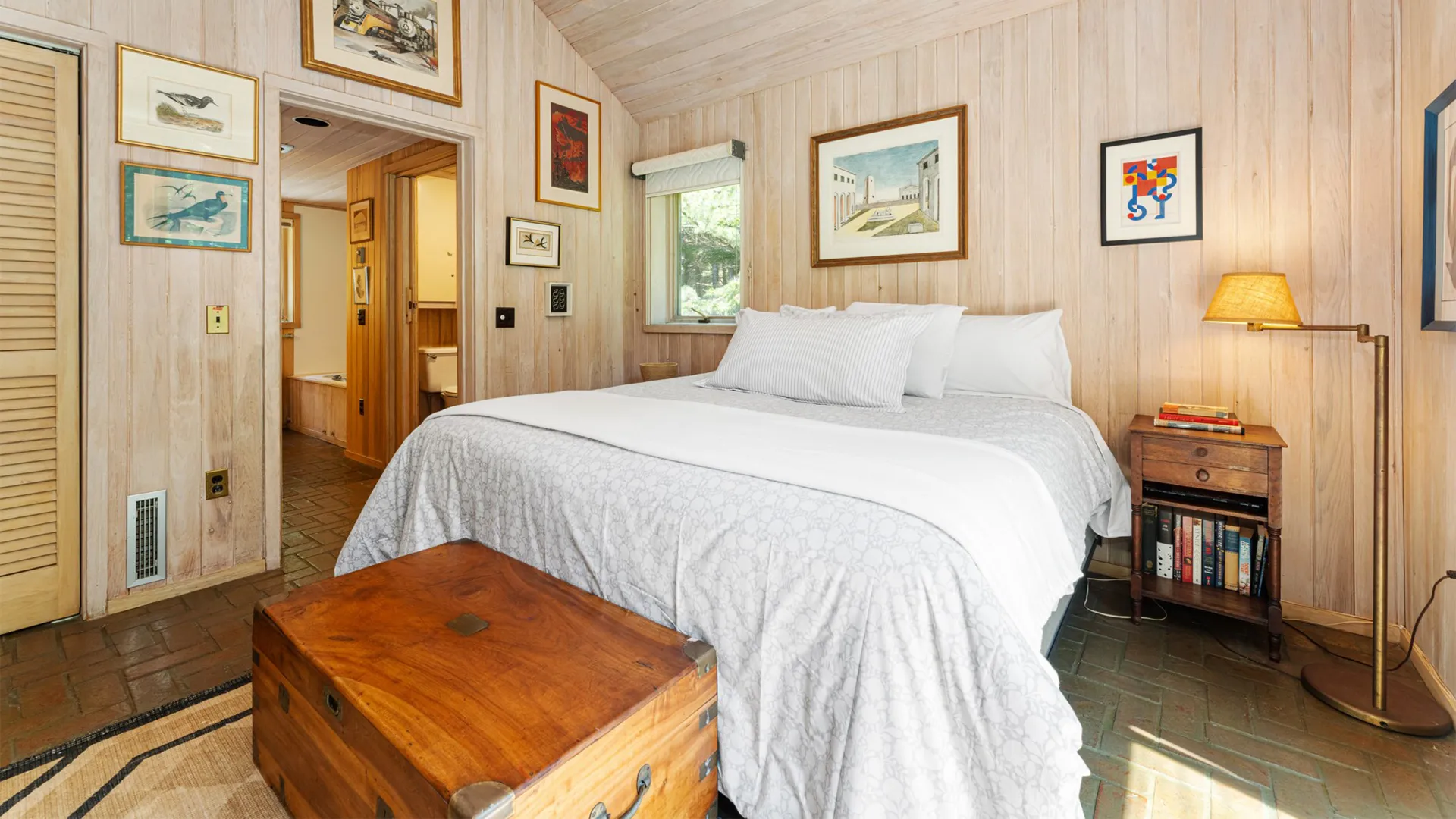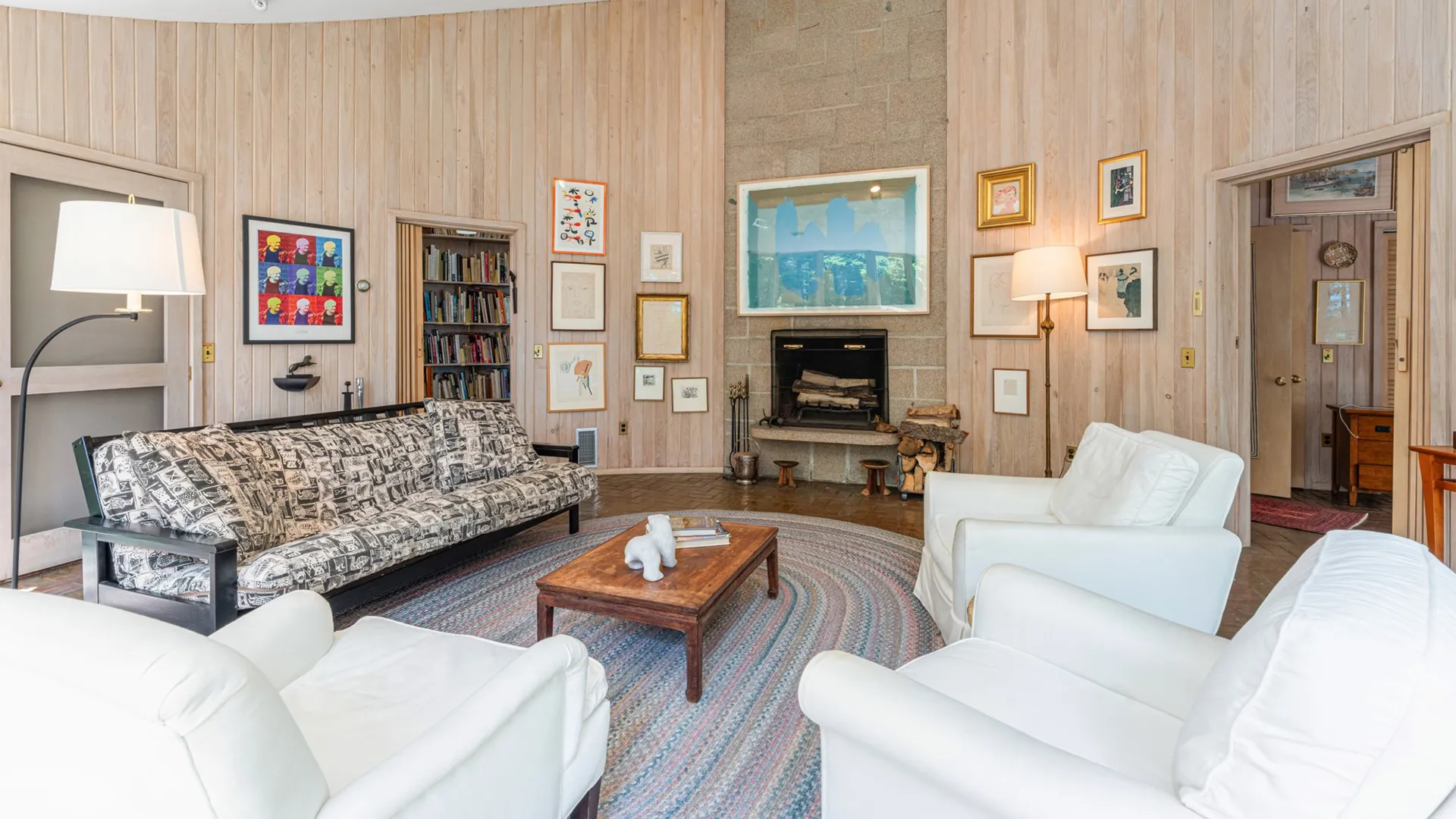 FIRST FLOOR: Designed by Wallace Harrison, Dodge Point Main House features curving walls that create flow and movement from one room to the next. Informal entry from the driveway leads to a laundry area that opens to a well equipped eat-in Kitchen with pretty water views and table that seats six, eight in a pinch. Living Room with vaulted slanted ceiling, curving windows overlooking the water, and plenty of comfortable seating focused around the granite fireplace. From the Living Room, the Primary Bedroom with King Bed and en suite Full Bath with jet tub and handheld shower. From the Bedroom, enter the curving Library which leads to Bedroom with Queen Bed and shared Full Bath with tub and shower across the hall. On the opposite end of the house, adjacent to the Kitchen is a third Bedroom with Trundle Bed and Shared Full Bath with shower stall. This bedroom is suitable for children or single adults. Note that the interior window separating this bedroom from the Kitchen can be shaded for privacy.GUEST HOUSE: