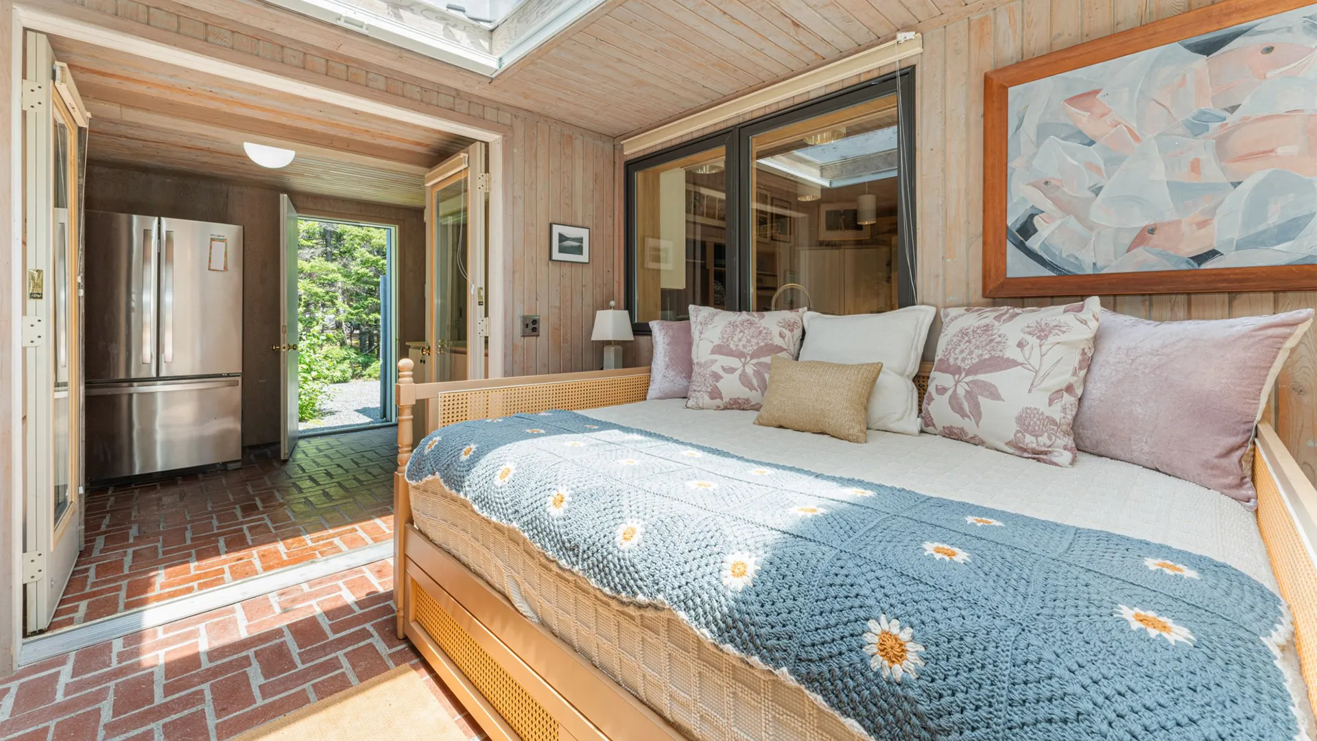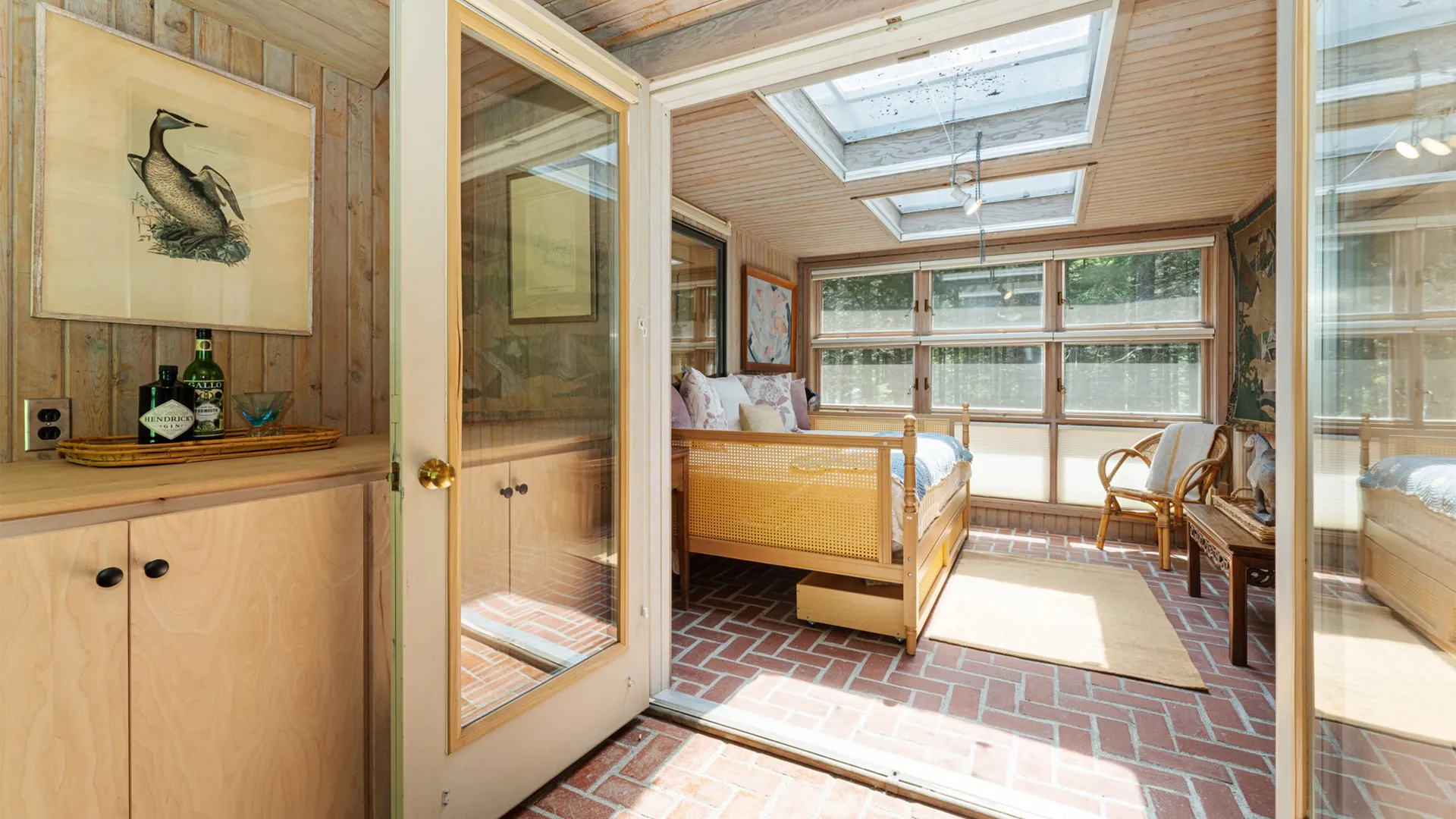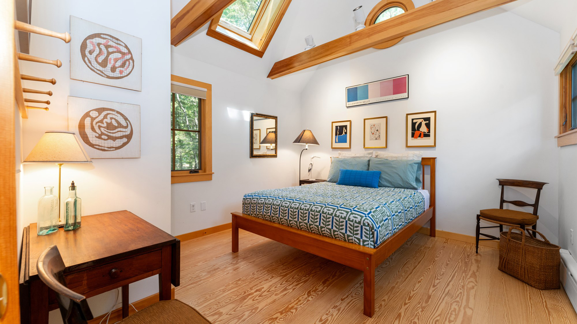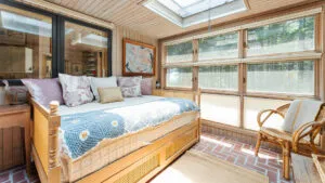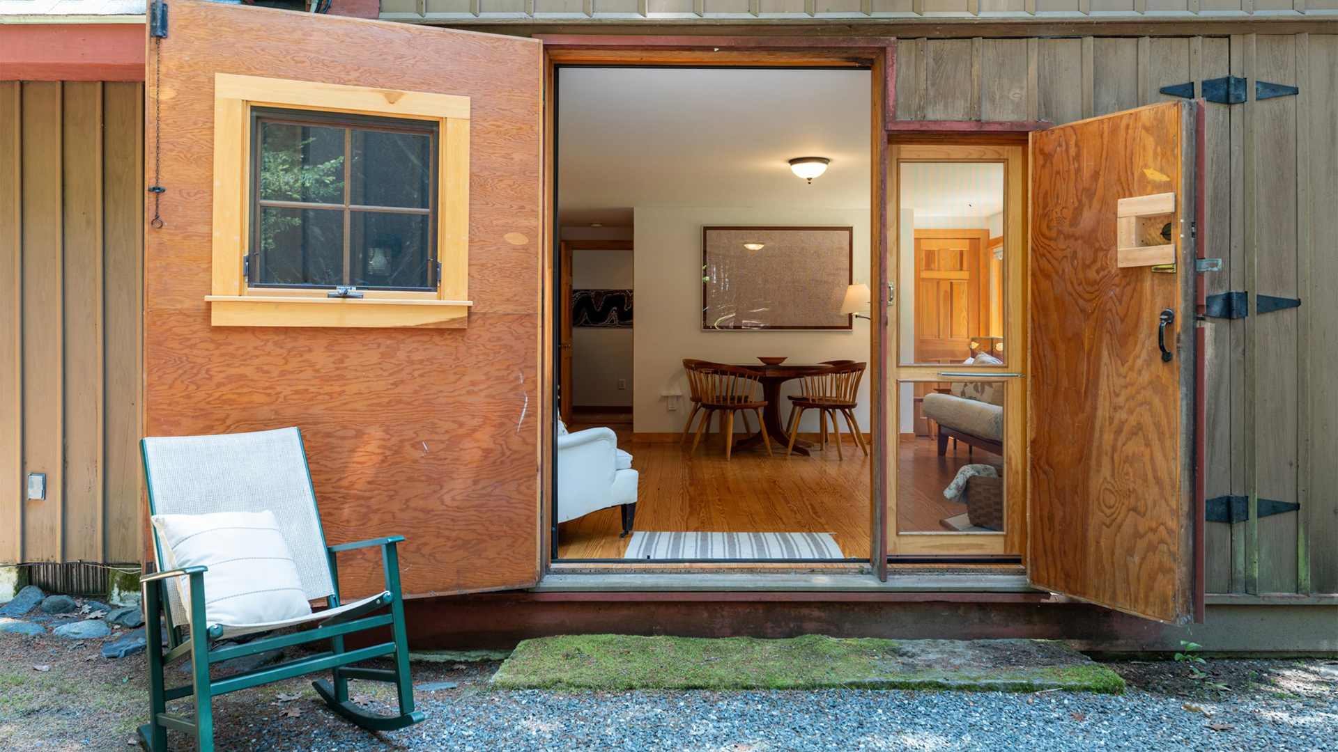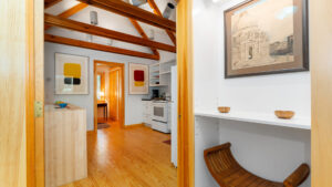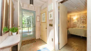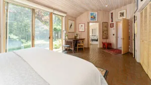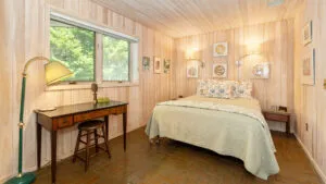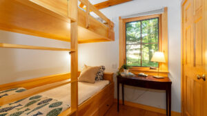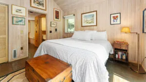 FIRST FLOOR: With a unique barn-style door opening from the gardens, the Guest House features a Living/Dining Room with table that seats four but can expand to seat more. Kitchen with counter seating for three leads to a small Bedroom with Bunkbeds. Adjacent to the Living Room is a Full Bath with shower stall. Just beyond the second entry to the house is a Bedroom with Twin Beds and en suite Full Bath with shower stall.SECOND FLOOR: A bedroom with Queen Bed and Primary Bedroom with King Bed share a Full Bath with combined tub and shower.