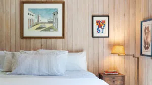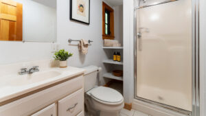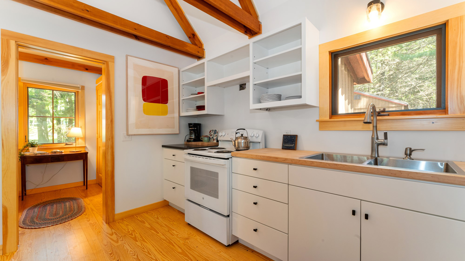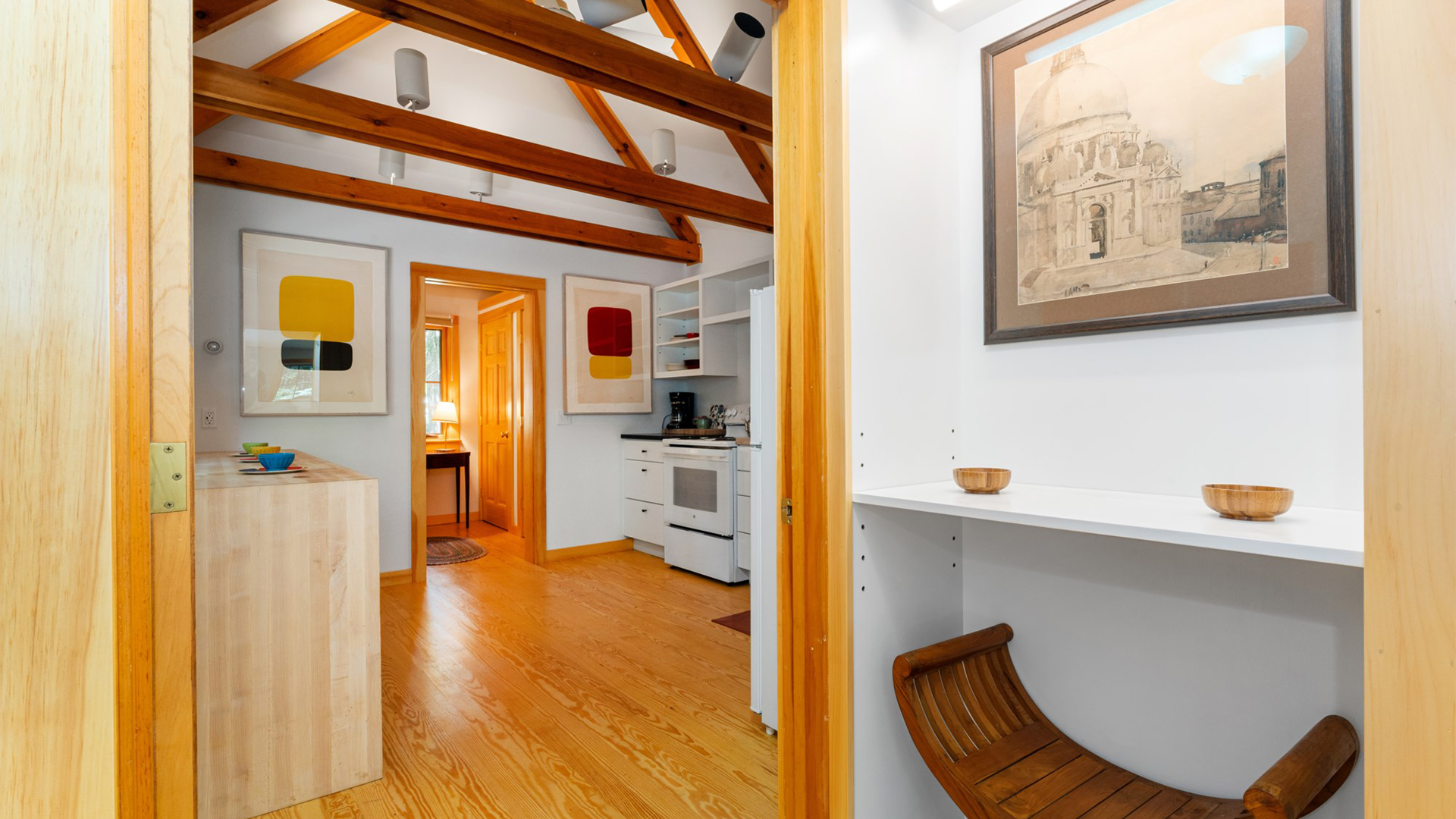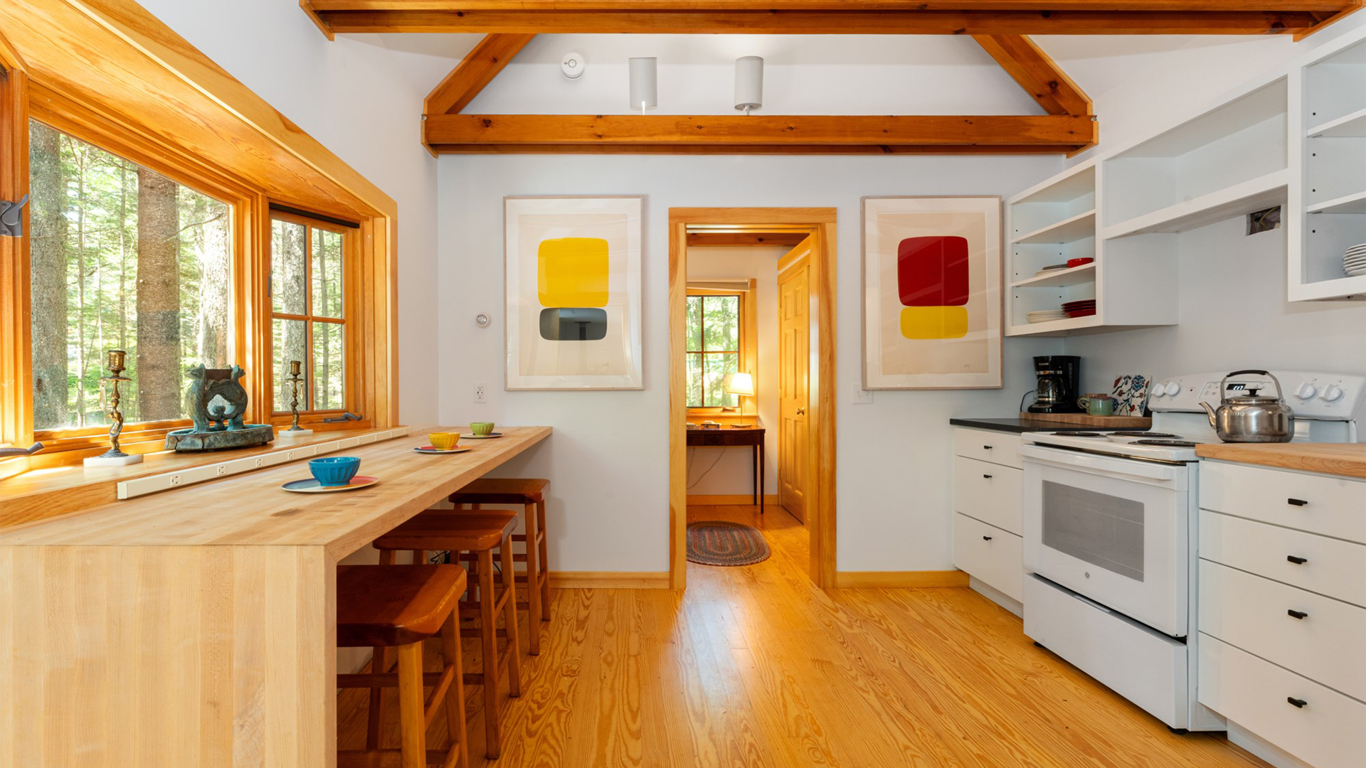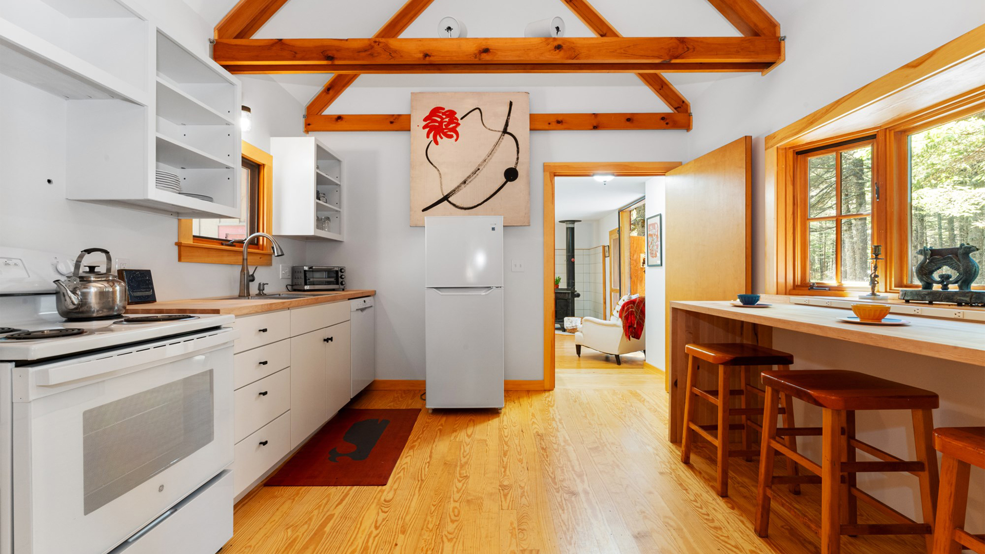 FIRST FLOOR: With a unique barn-style door opening from the gardens, the Guest House features a Living/Dining Room with table that seats four but can expand to seat more. Kitchen with counter seating for three leads to a small Bedroom with Bunkbeds. Adjacent to the Living Room is a Full Bath with shower stall. Just beyond the second entry to the house is a Bedroom with Twin Beds and en suite Full Bath with shower stall.SECOND FLOOR: A bedroom with Queen Bed and Primary Bedroom with King Bed share a Full Bath with combined tub and shower.