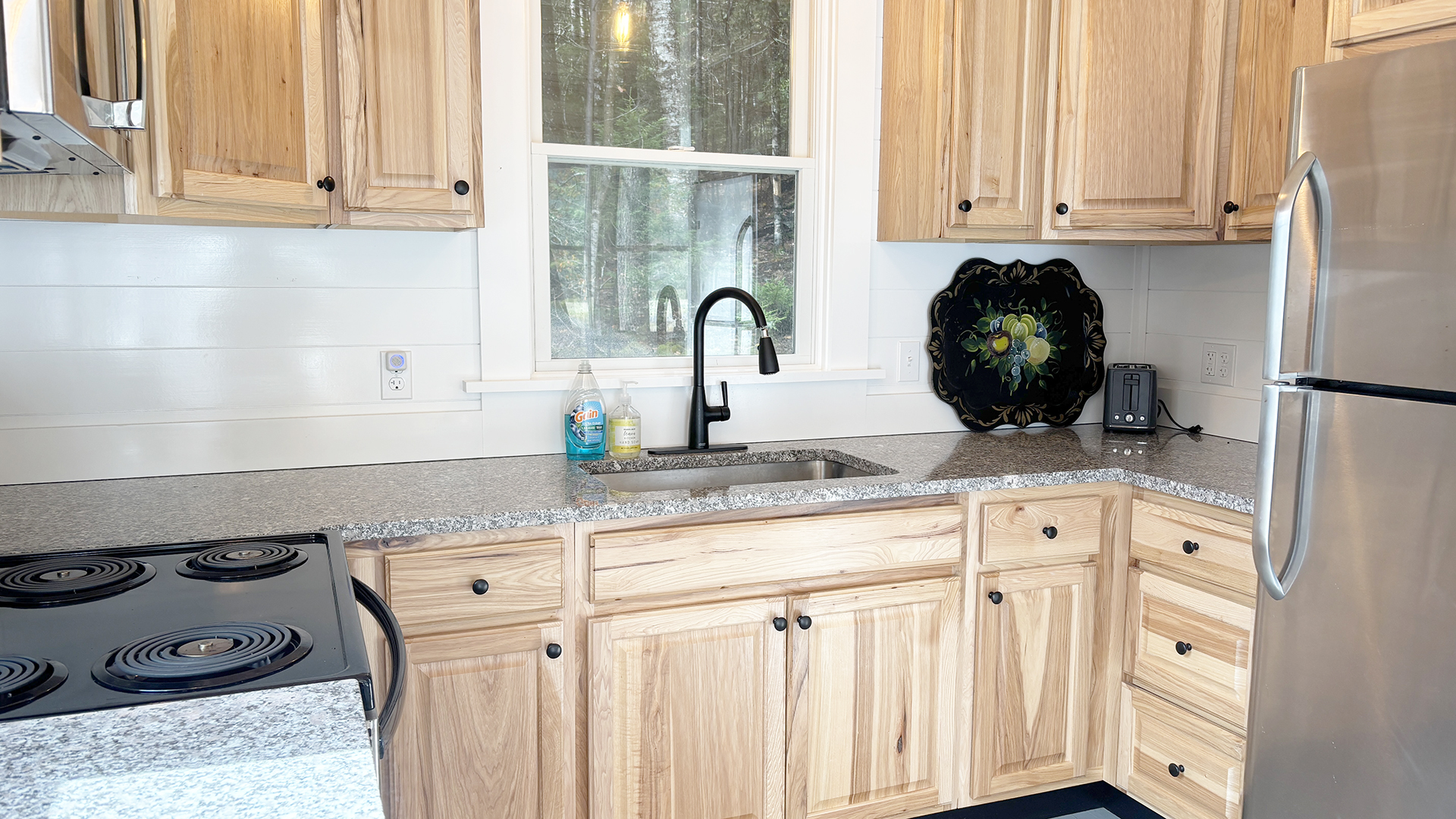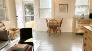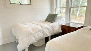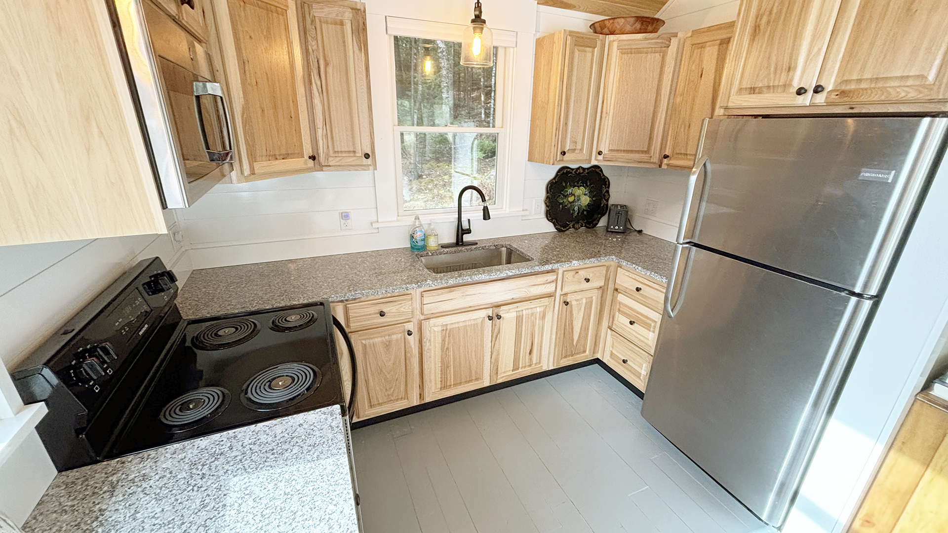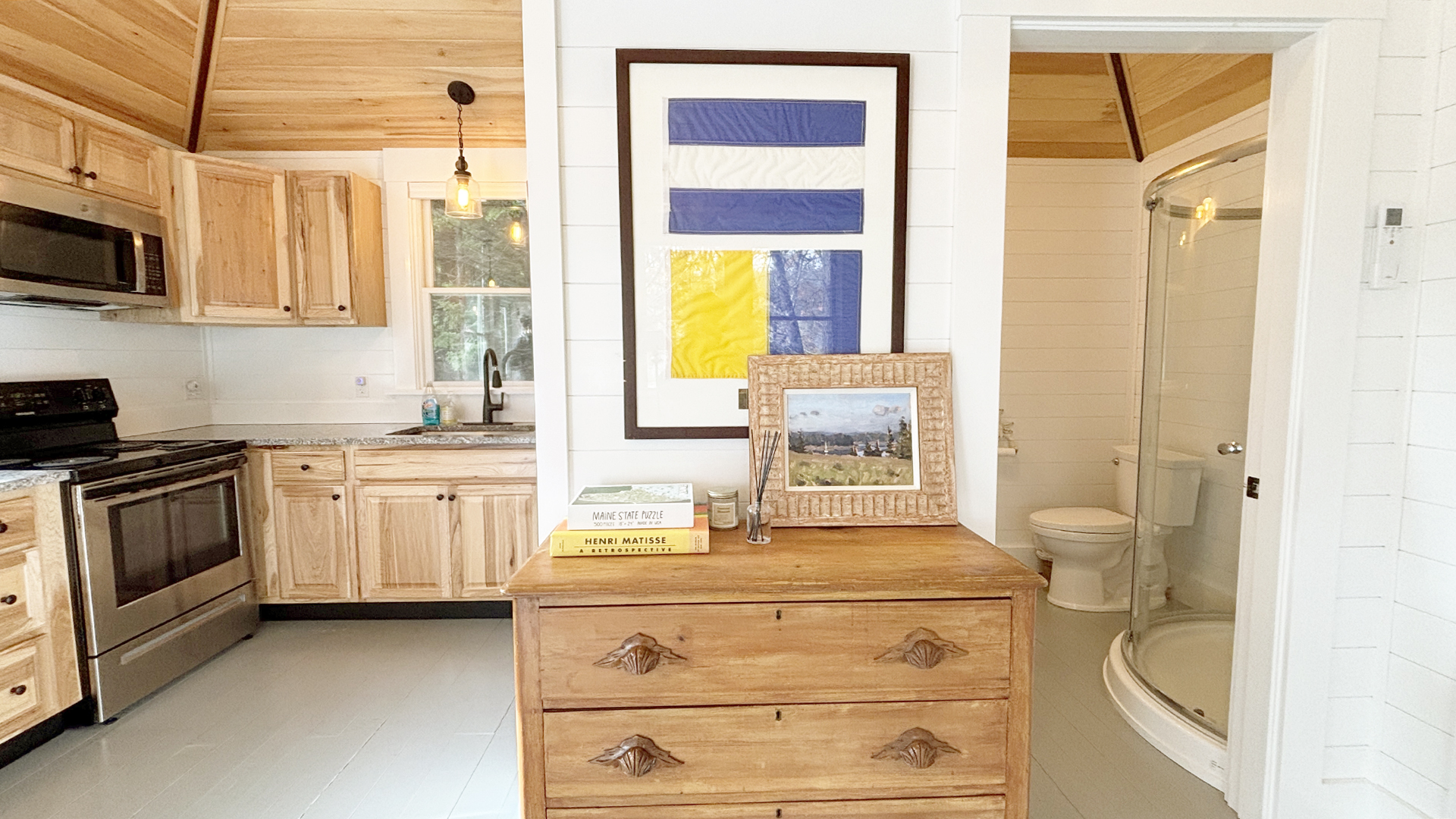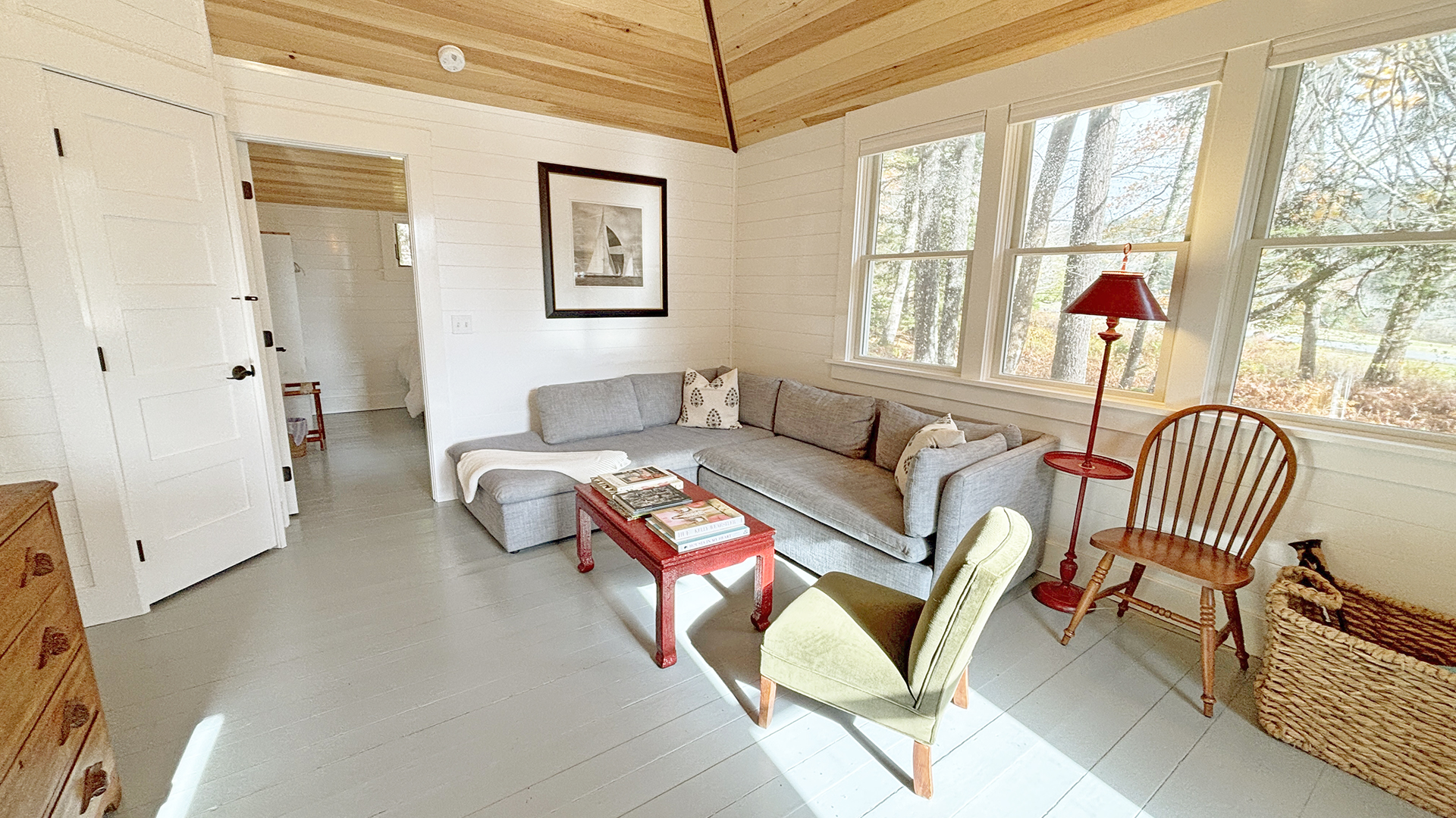 FIRST FLOOR: Open Living/Dining/Kitchen area with lofted ceiling and painted shiplap paneling create a bright and welcoming spot with sectional sofa, table for two, and fully equipped Kitchen (note no dishwasher). Full Bath with shower stall. Bedroom with King Bed that can be converted to Twins. Mini-split heat pump provides AC throughout for hotter days and heat to take off the chill.OUTDOOR SPACES: Shared yard and lawn space with neighboring Edgewood, with mature woods surrounding. A gently sloping lawn surrounds the property with shrubbery serving as a buffer between the home and the road. A “secret” path that networks to Jordan Pond House trails and Carriage Roads is just behind this property! Be sure to explore!