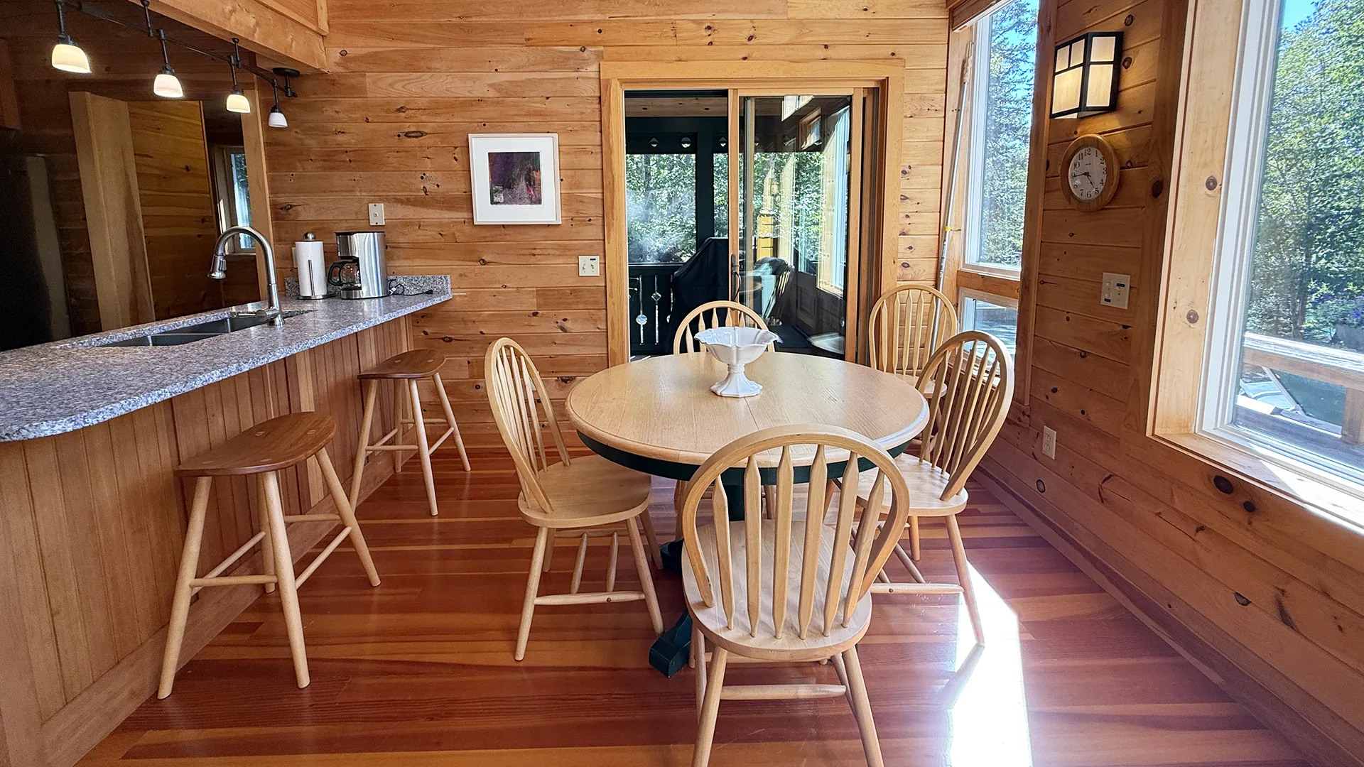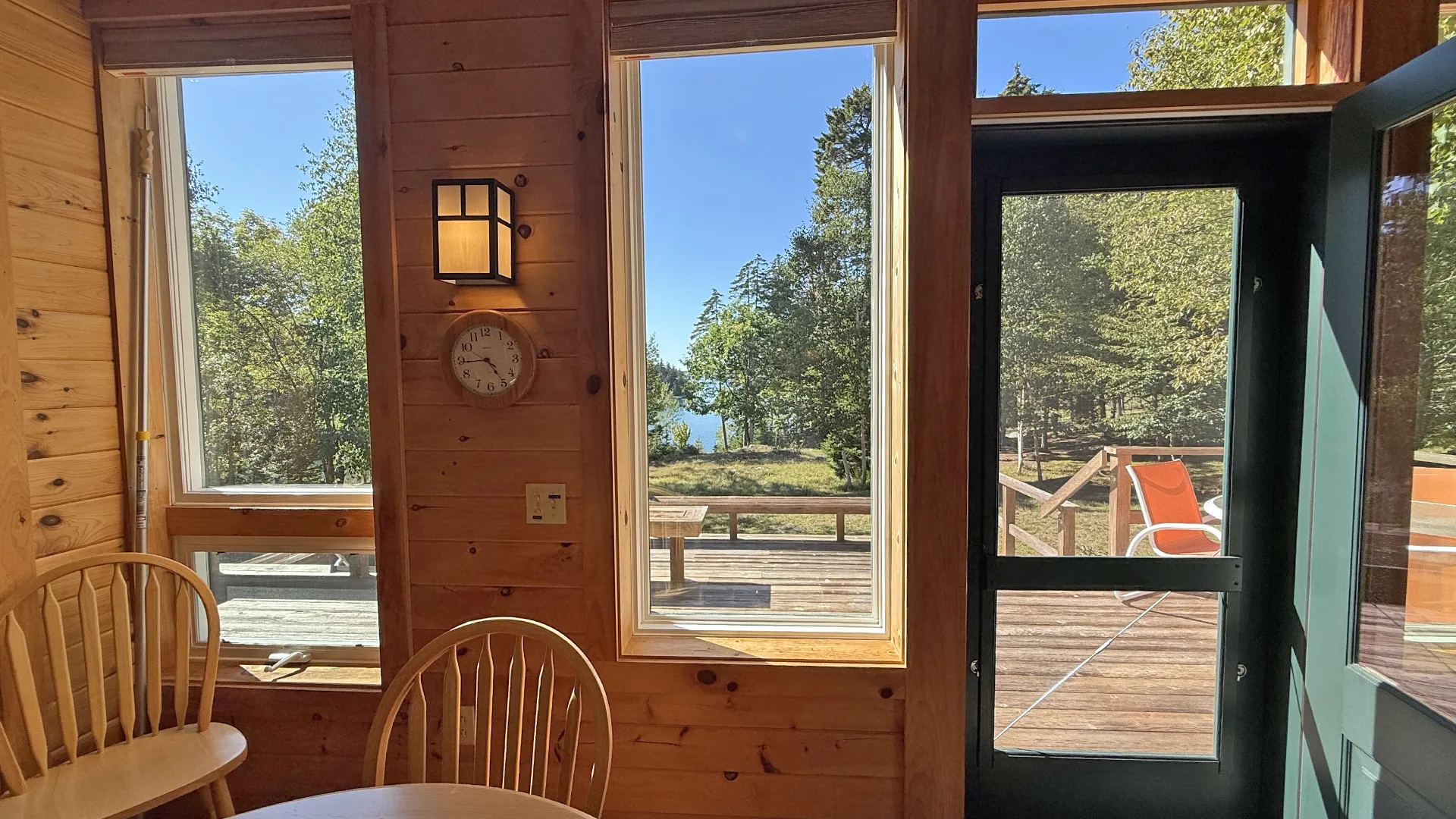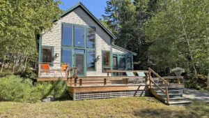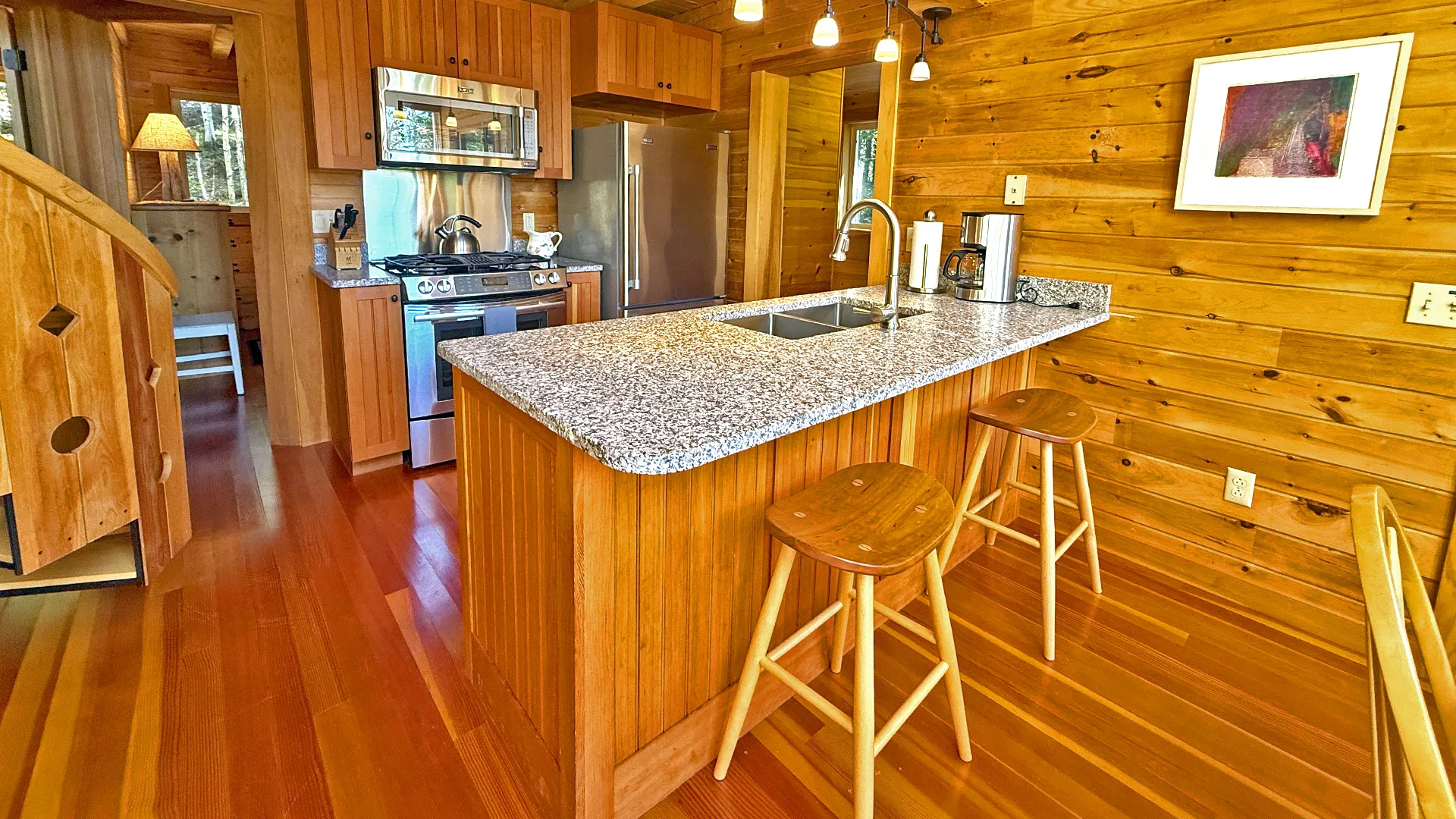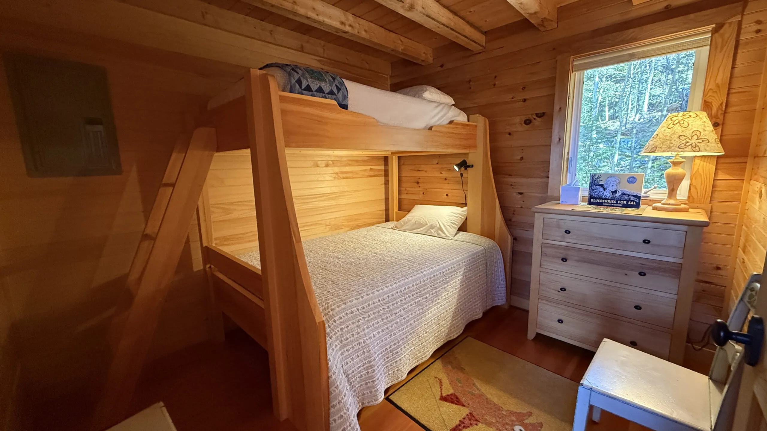 FIRST FLOOR: Enter through a mudroom with a “drop zone” for coats and boots plus a convenient laundry area to the galley style, well-equipped Kitchen. Combined Living and Dining area features floor to ceiling windows overlooking the meadow and cove beyond, a woodstove, comfortable seating, TV with Roku, dining table that seats four to six easily, and a door to a screened in porch (not yet pictured), perfect for buggy evenings or a way to escape the heat and sun. Two bedrooms, each with a set of bunk beds. Full Bath with walk-in shower stall.