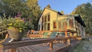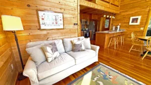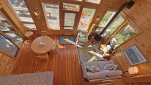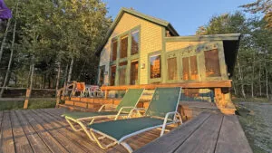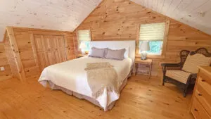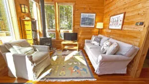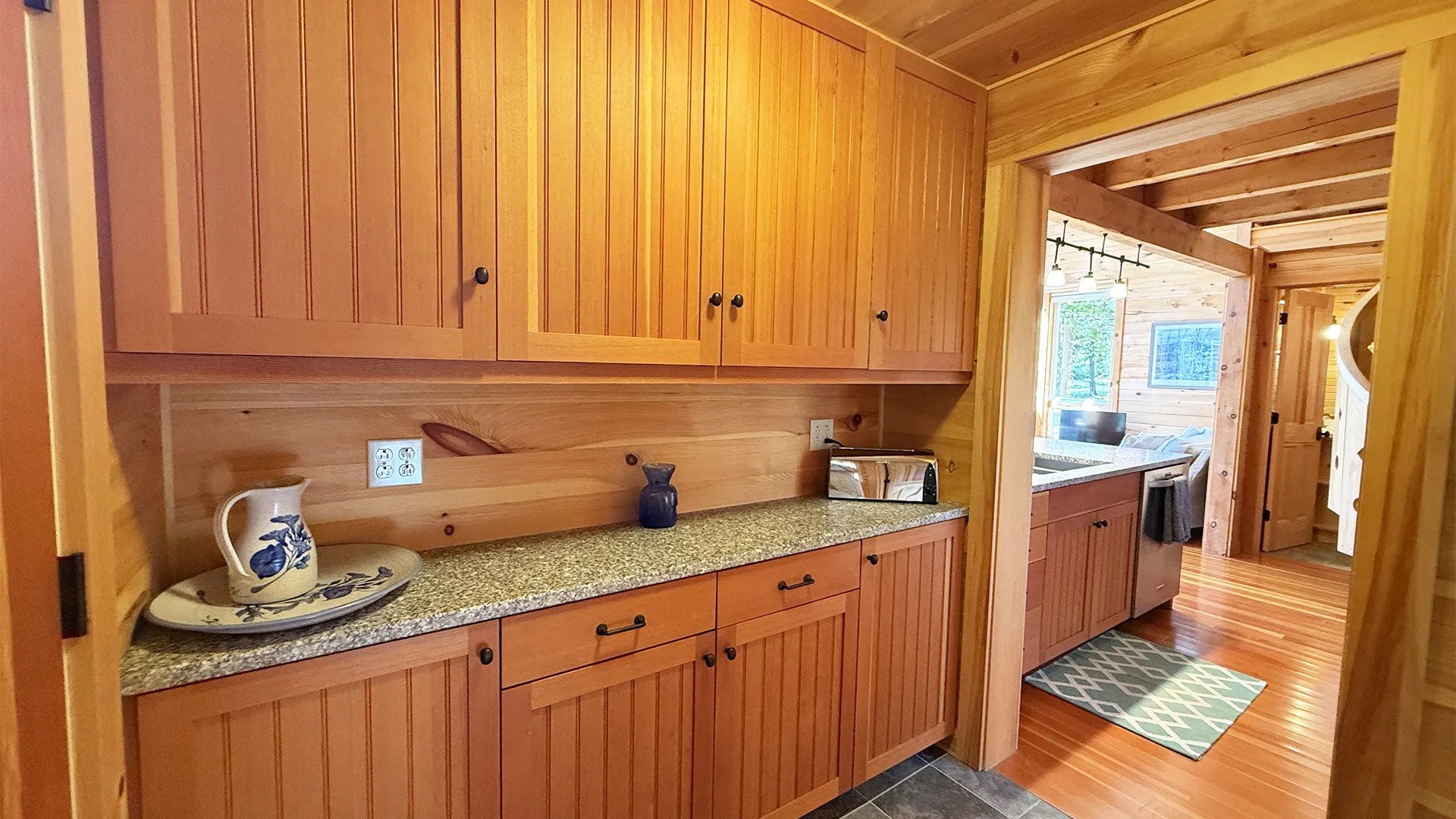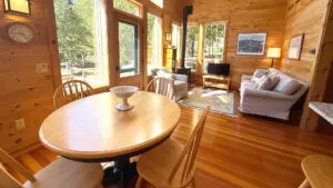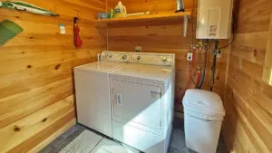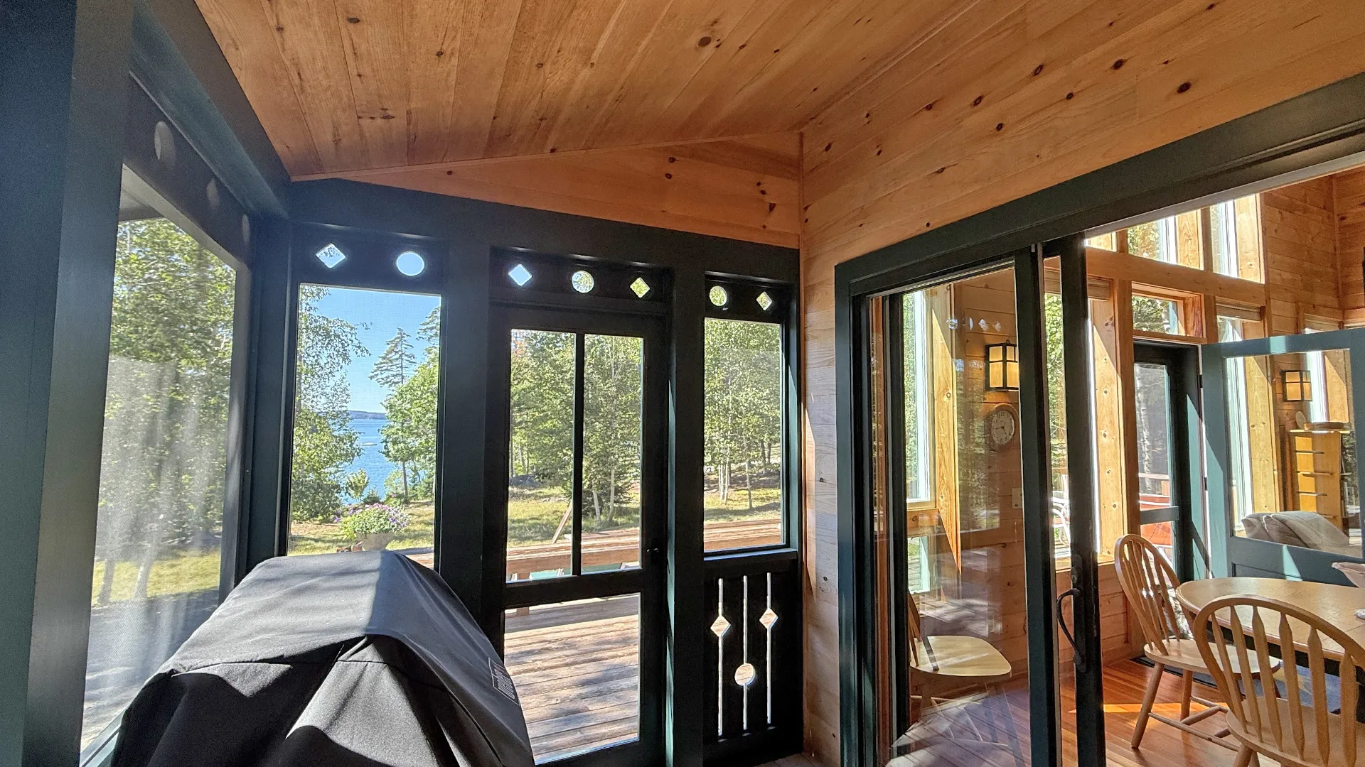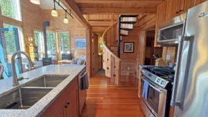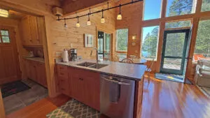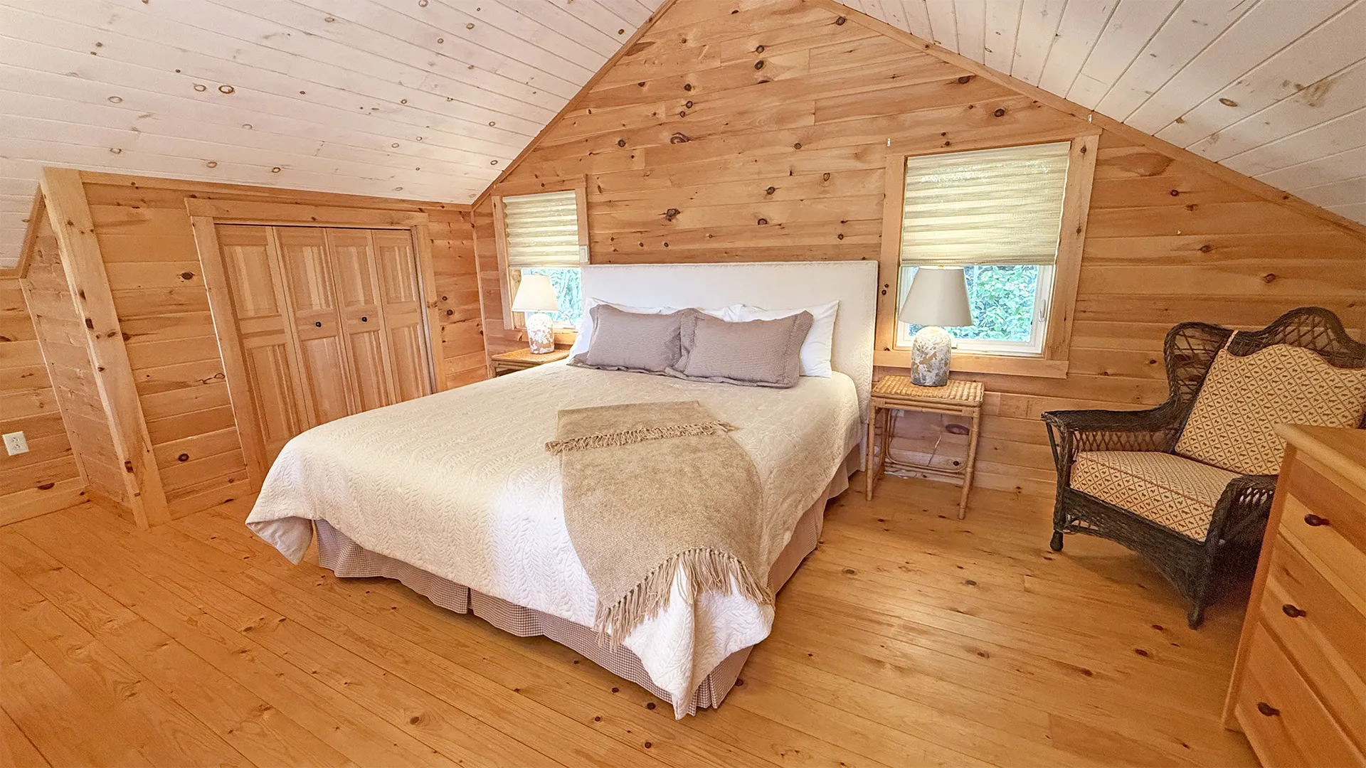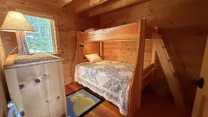 FIRST FLOOR: Enter through a mudroom with a “drop zone” for coats and boots plus a convenient laundry area to the galley style, well-equipped Kitchen. Combined Living and Dining area features floor to ceiling windows overlooking the meadow and cove beyond, a woodstove, comfortable seating, TV with Roku, dining table that seats four to six easily, and a door to a screened in porch (not yet pictured), perfect for buggy evenings or a way to escape the heat and sun. Two bedrooms, each with a set of bunk beds. Full Bath with walk-in shower stall.