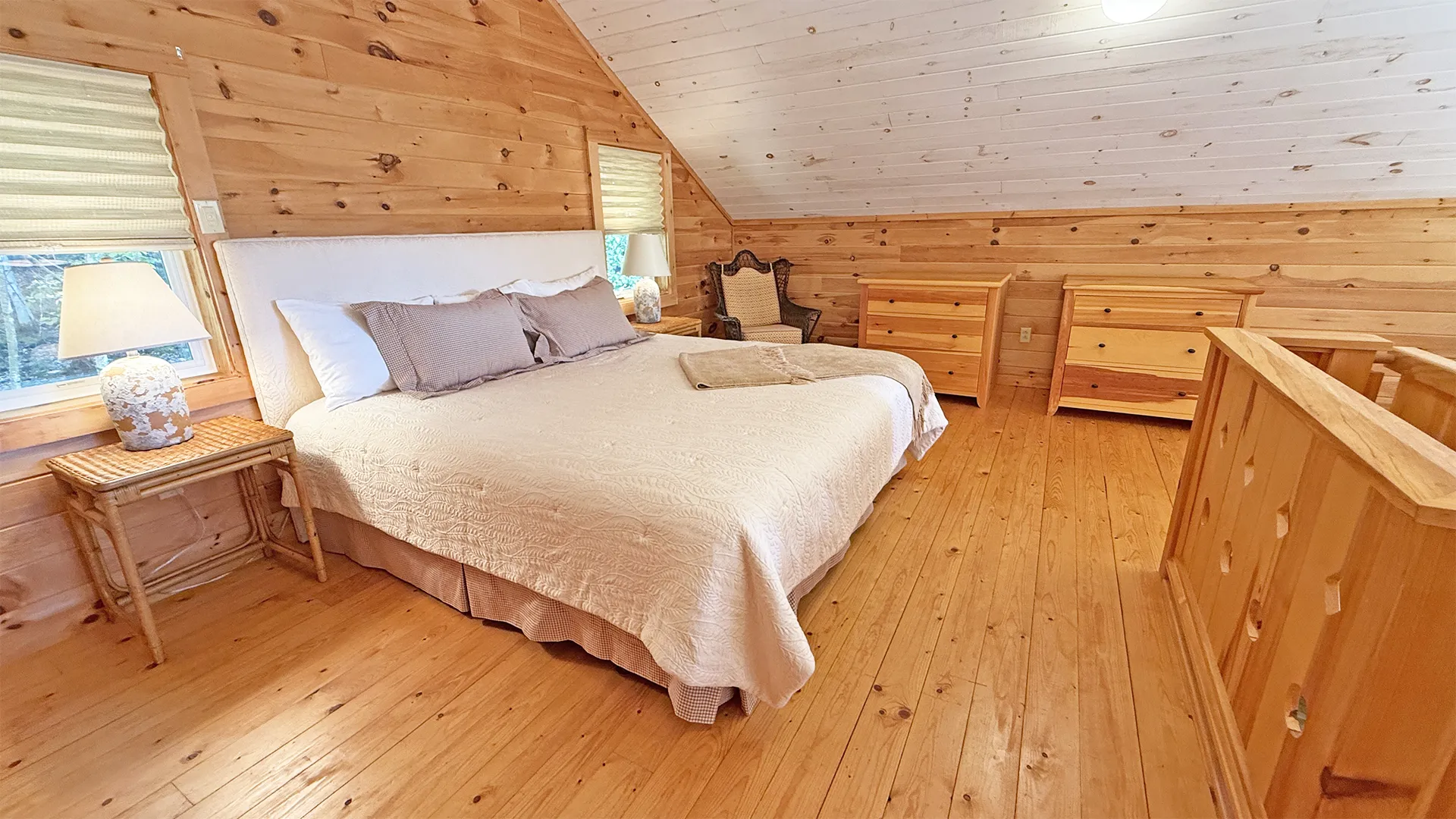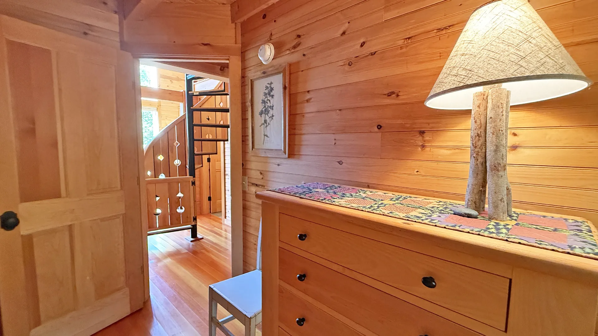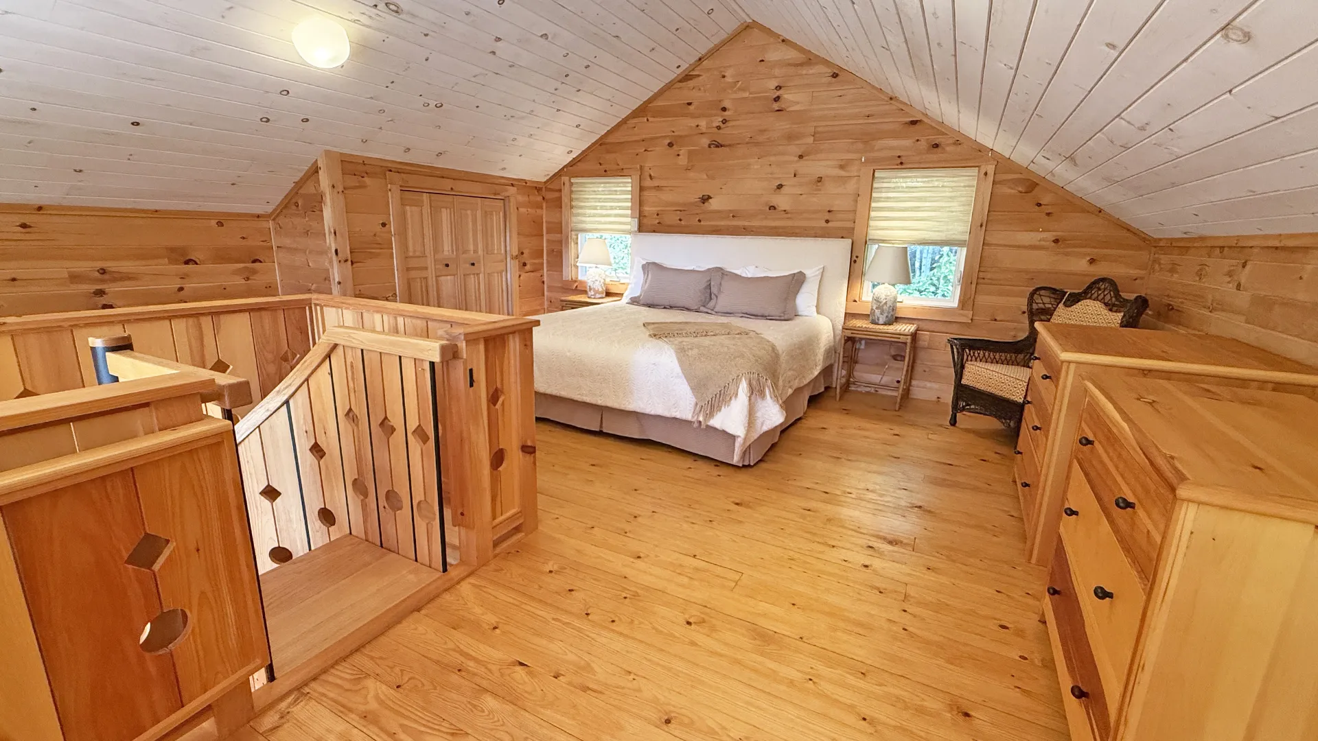 SECOND FLOOR: Spiral staircase, which can be gated at both the top and bottom, leads to a lofted Primary Bedroom with King bed and views out to the water.