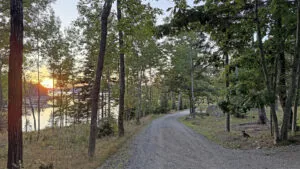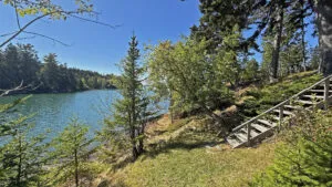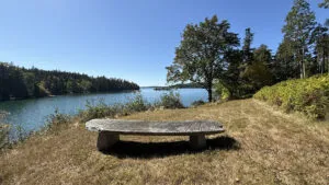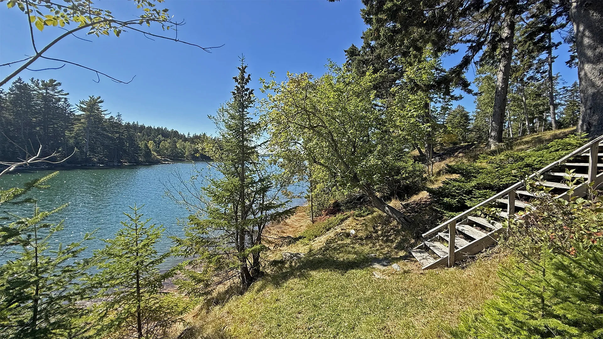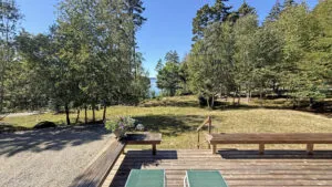 OUTDOOR SPACES: Door from the Living area leads to a furnished Deck across the front of the house with views across the surround meadow to the water. Follow the dirt road, which serves as the driveway to the family house at the end of the point, to a short path and staircase leading to the shore.