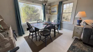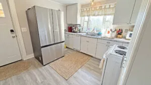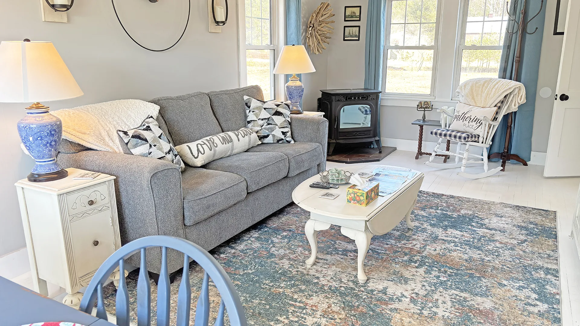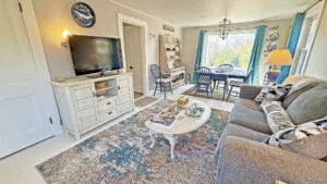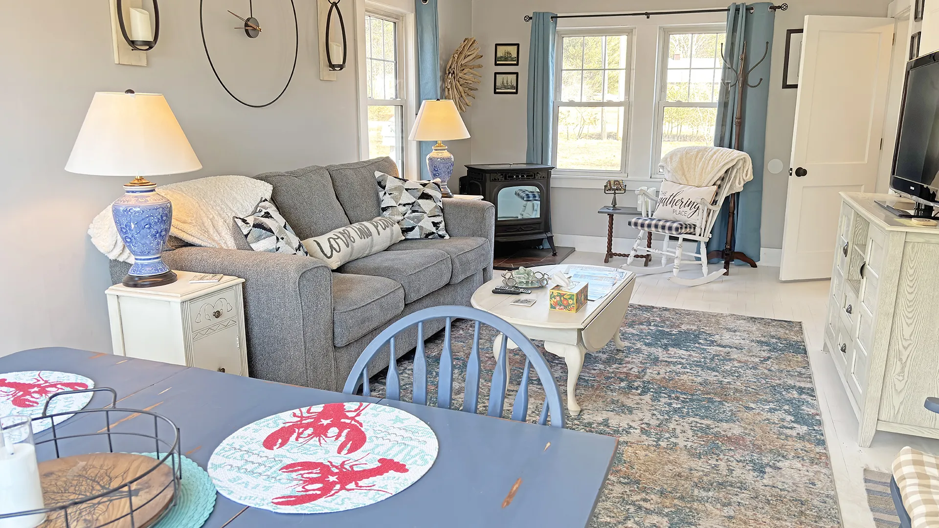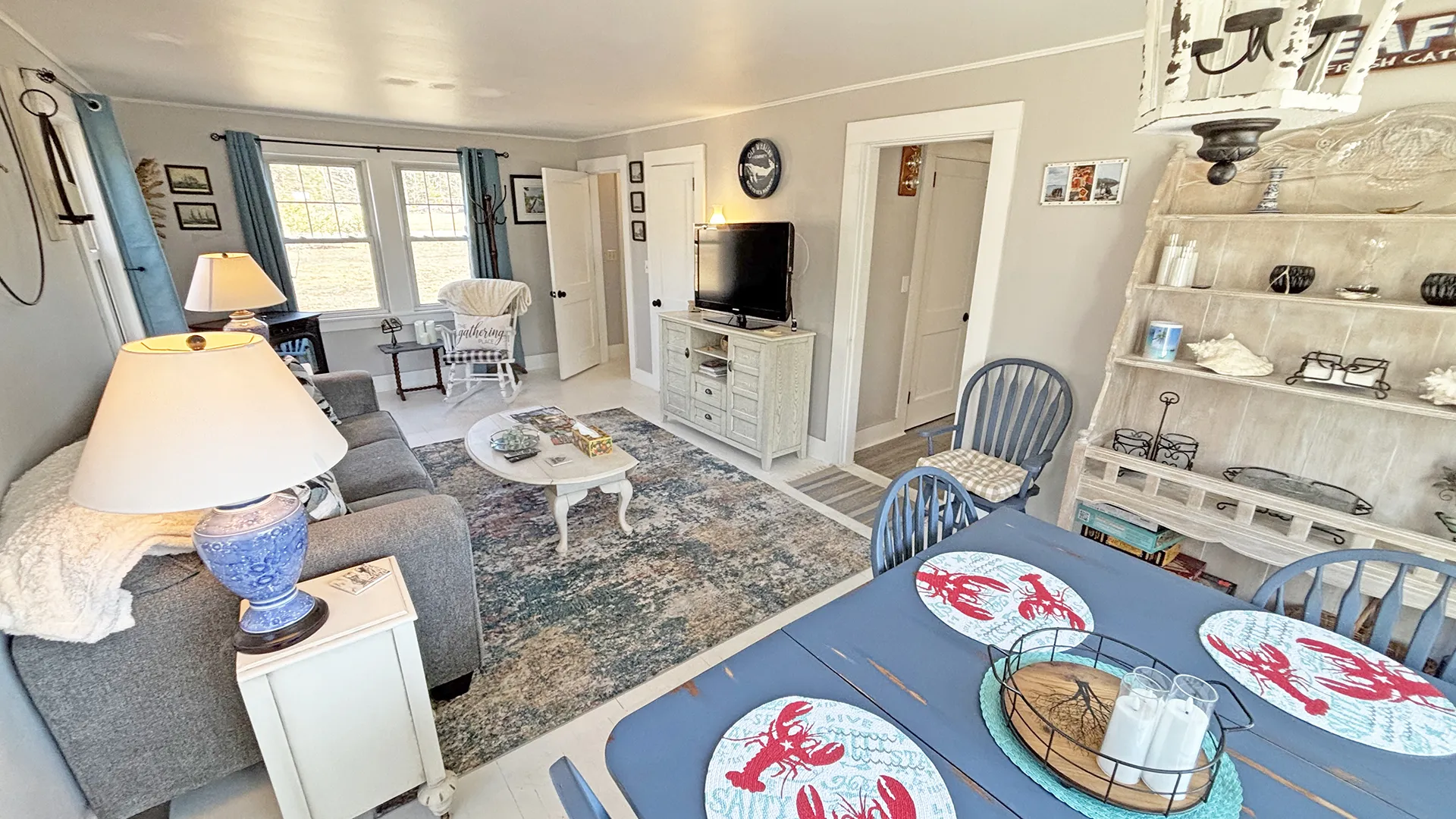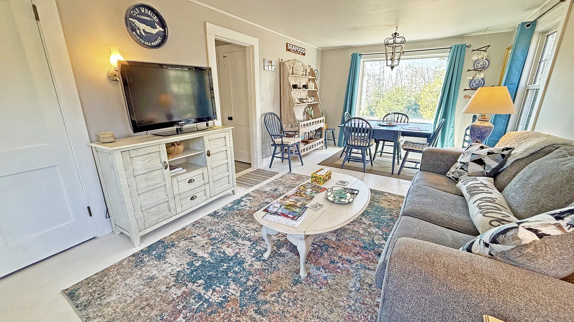FIRST FLOOR: Enter through the screened porch to a Kitchen with updated appliances. Adjacent to the Kitchen is a Bedroom with Queen bed. Shared Full Bath with combined tub and shower. Combined Living and Dining area with table that seats 4 to 6, large screened TV, and new sofa with queen sized sofa bed, and pellet stove for cooler days. Anticipated for the 2026 season, mini-split AC/Heating units will keep things cool on warmer days.