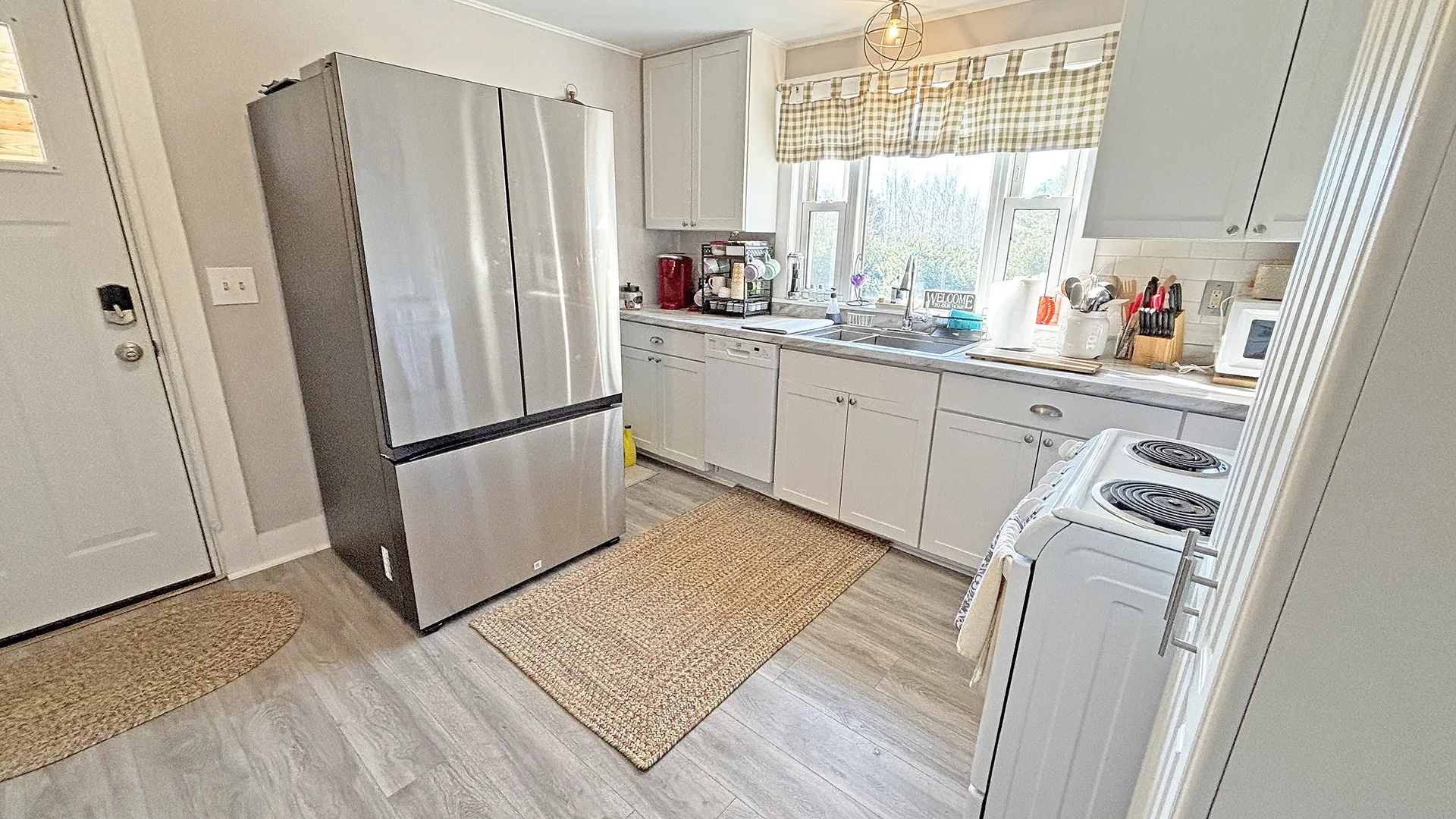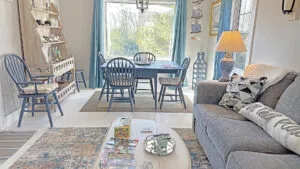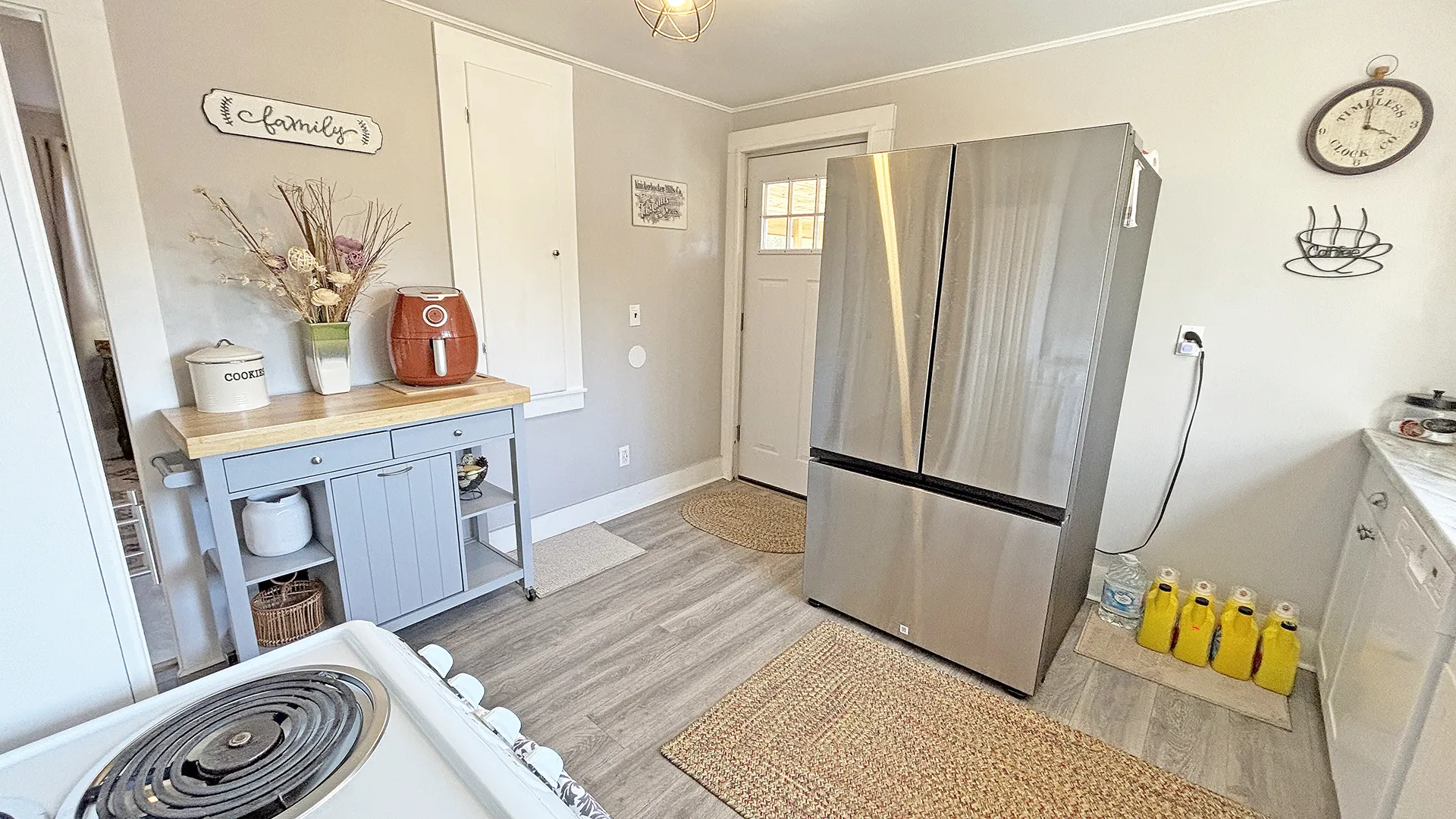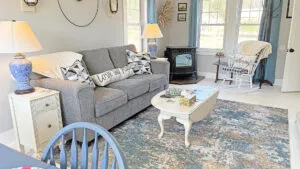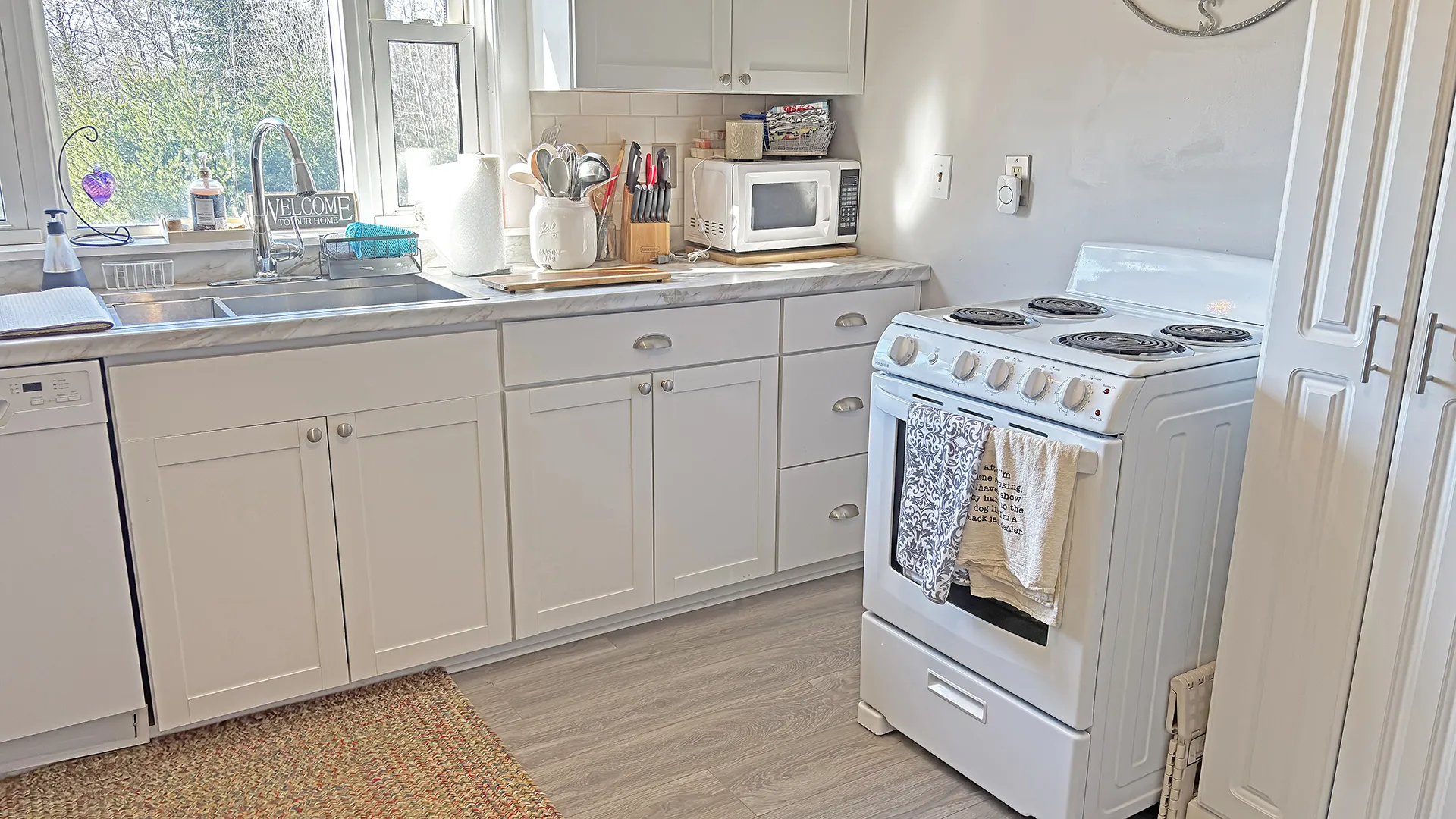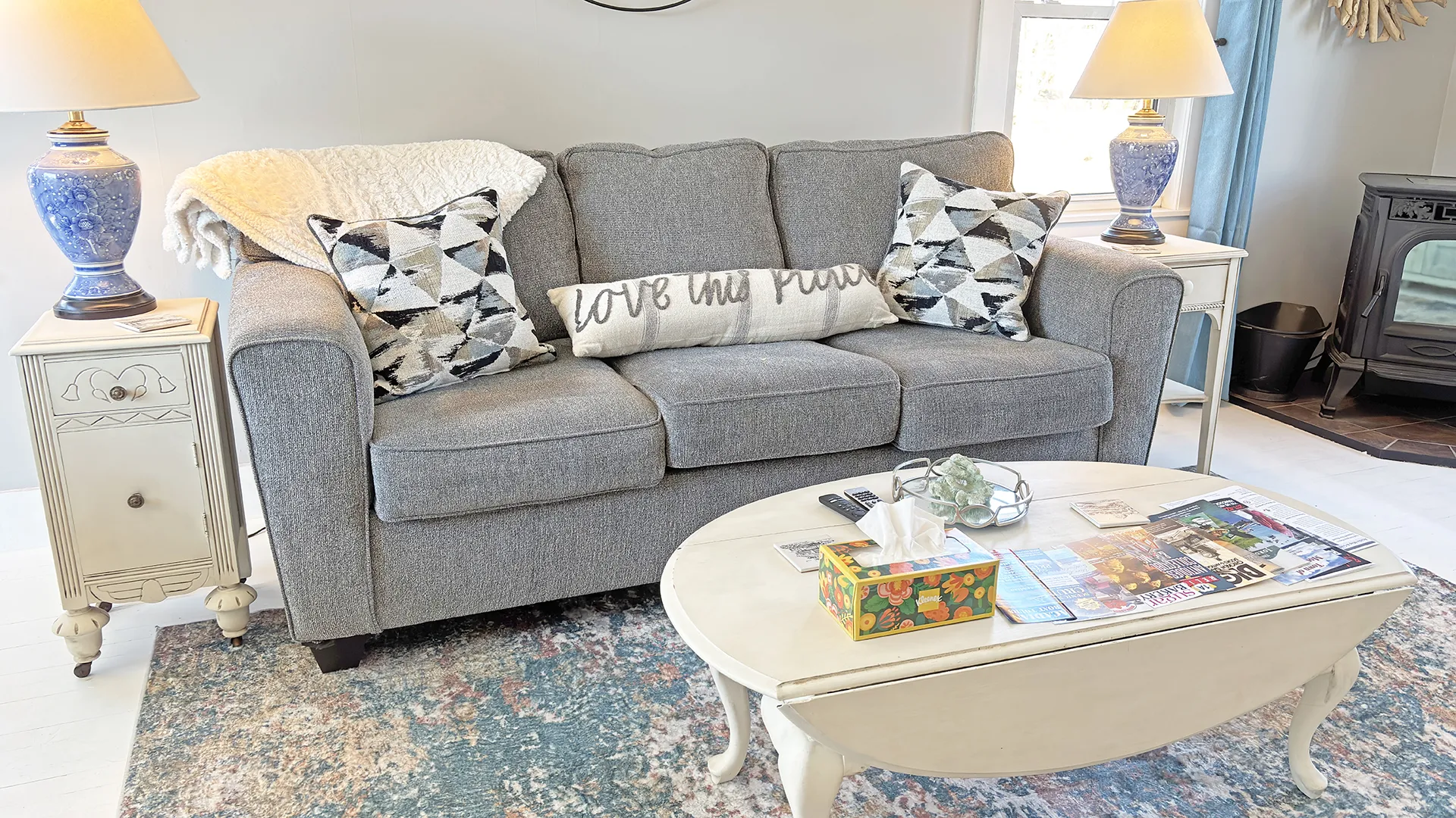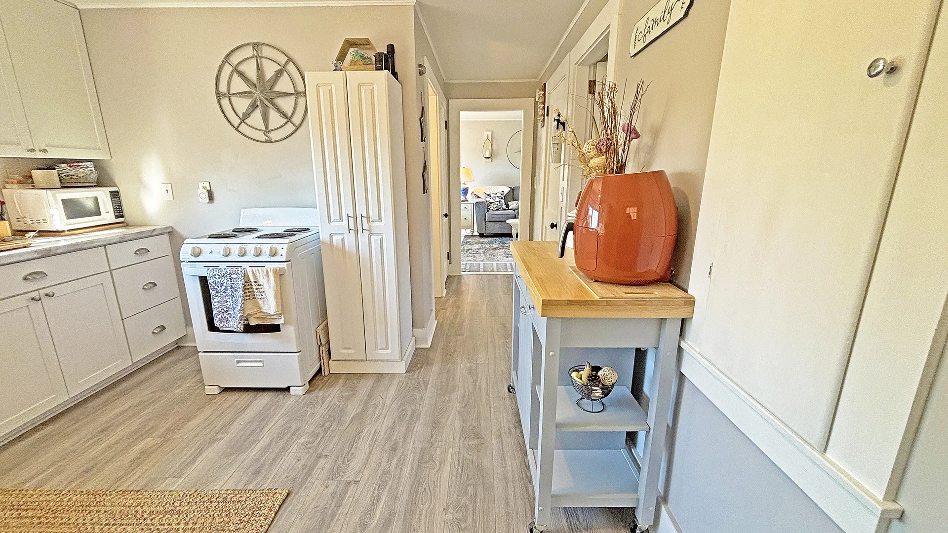FIRST FLOOR: Enter through the screened porch to a Kitchen with updated appliances. Adjacent to the Kitchen is a Bedroom with Queen bed. Shared Full Bath with combined tub and shower. Combined Living and Dining area with table that seats 4 to 6, large screened TV, and new sofa with queen sized sofa bed, and pellet stove for cooler days. Anticipated for the 2026 season, mini-split AC/Heating units will keep things cool on warmer days.