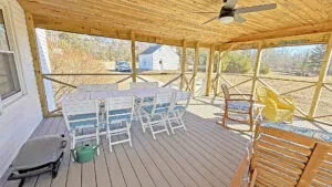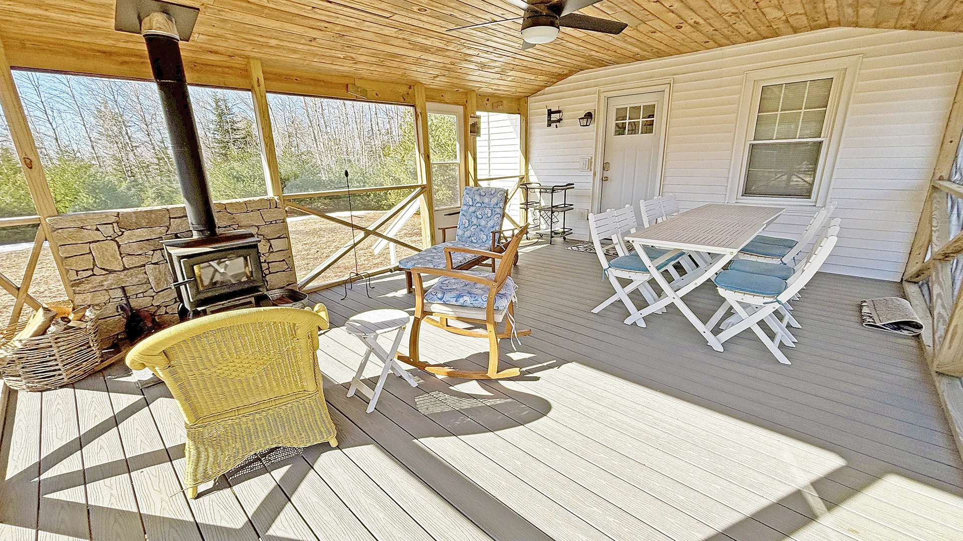 OUTDOOR SPACES: Fantastic screened in porch is likely to be your principal hang-out spot with table for dining. Note: woodstove featured in photos is not available for tenant use. The house is surrounded by expansive, level lawn, perfect for play and relaxation! Lamoine Beach Road has semi-regular traffic, but this home is set far enough back from the road that you will still enjoy a sense of privacy and quiet, particularly in the evenings.