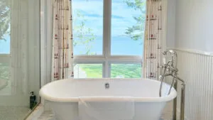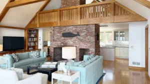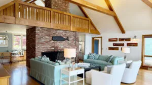 FIRST FLOOR: Front entry offers immediate views out to the open ocean through sliders that lead to the front deck. To the right, a large Living Room with cathedral ceiling, floor to ceiling windows, showcase fireplace, and plenty of comfortable seating creates a warm and lovely gathering space. In one corner, a circular table is perfect for puzzles, games, or dining for up to 6 people. Adjoining the Living Room, a full-service gourmet style Kitchen with center island and high-end appliances, is fully stocked to make meal prep a breeze. An informal Kitchen dining table seats 8 to 10 comfortably. Over the Kitchen and accessed by a ship’s ladder is a lofted “hang-out” area suitable for quiet play, reading, or day-time use. Just beyond the Kitchen is a well-organized pantry and Half Bath that leads to a Primary Bedroom with King Bed, water views, and en suite luxurious Full Bath with double vanity, separate soaking tub with water views, and glass-walled walk-in shower.