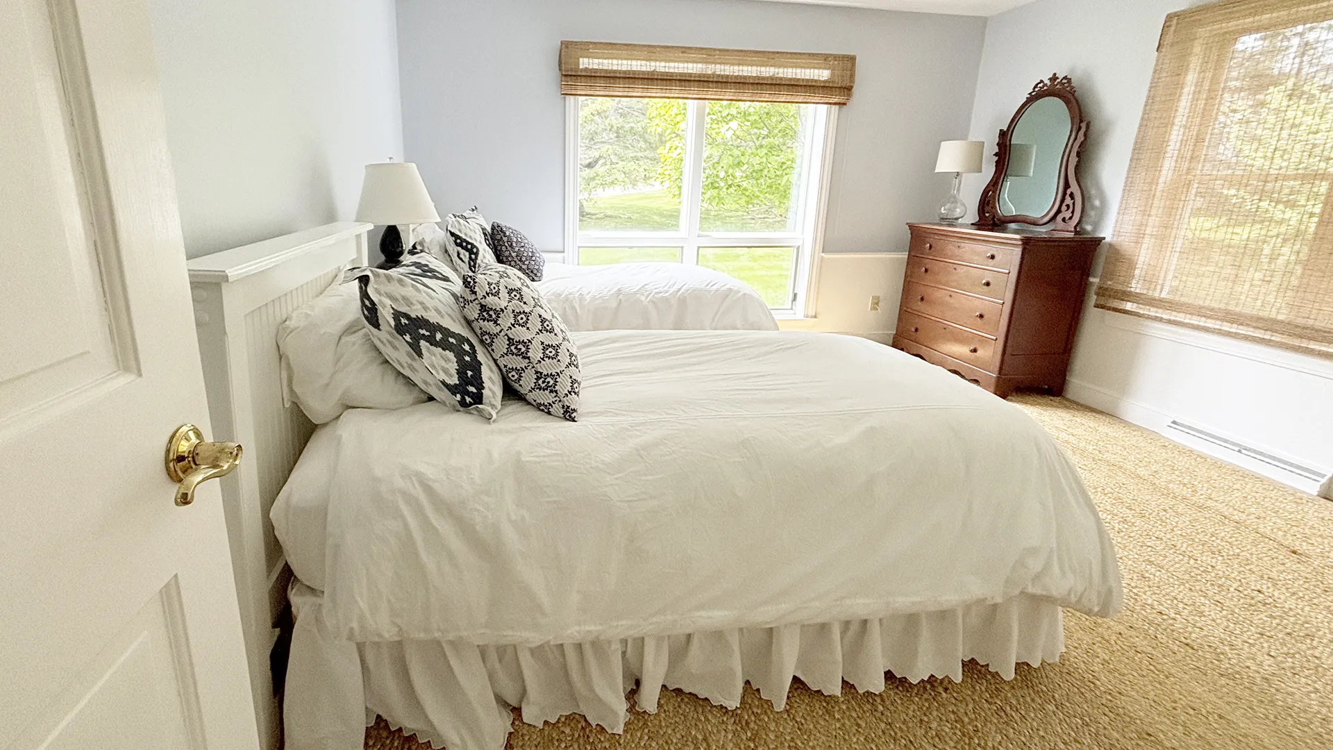 LOWER LEVEL: (Not pictured) Stairs to the lower level lead to a large bunkroom suitable for kids with four single beds. Note that there is no bath on this level and no door on the bedroom for safety reasons. Although situated in the lower level, this room has upper windows for light and ventilation, and feels fresh and comfortable.