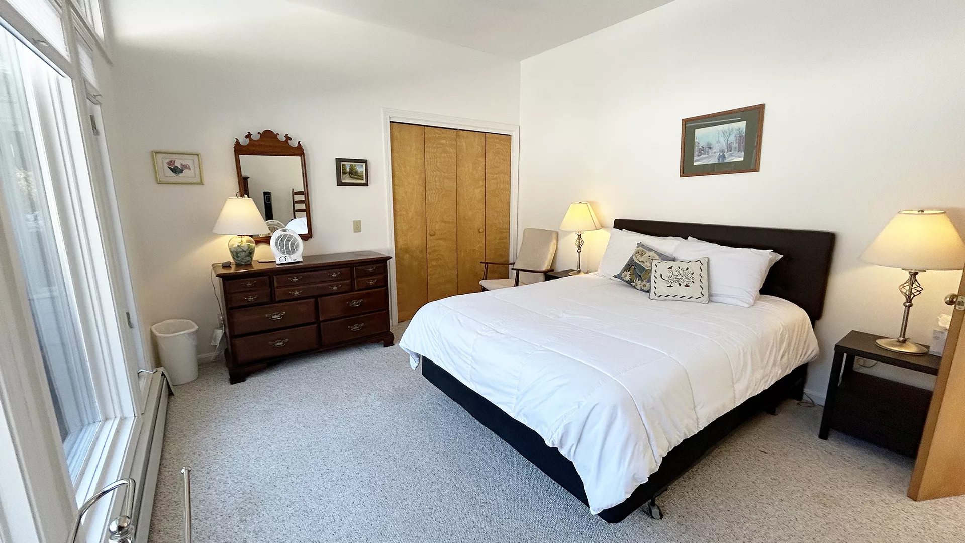 FIRST FLOOR: Entry leads to spacious combined living/dining room, with A/C and glass doors to central deck overlooking shore. This deck features a stunning granite fireplace making cool evenings a delight! Dining table seats four to six comfortably. Well-equipped kitchen overlooking living area. Large laundry area with storage. Half Bath. Down a short hallway, a Primary Bedroom with King bed and water views also features sliding doors leading to the front deck. Shared Full Bathroom with combined tub and shower. Guest Bedroom with Queen bed.