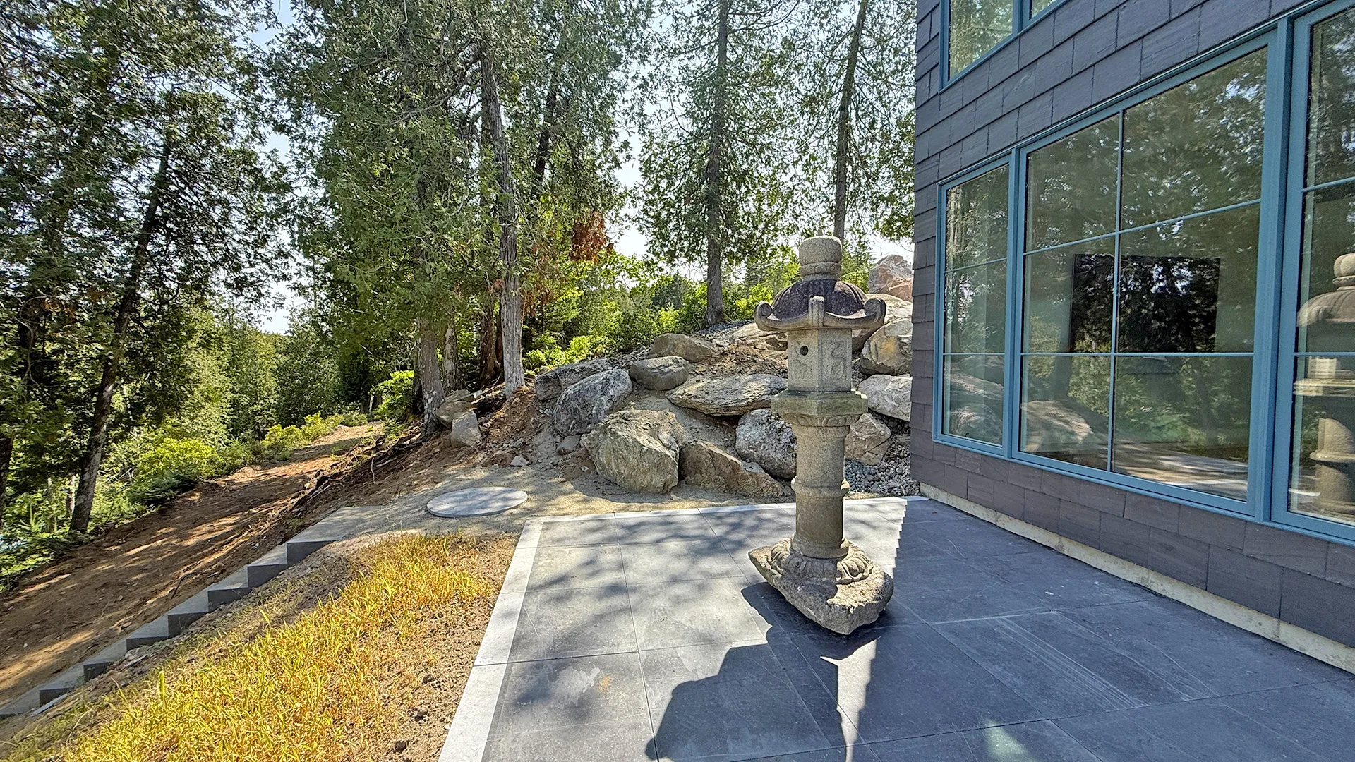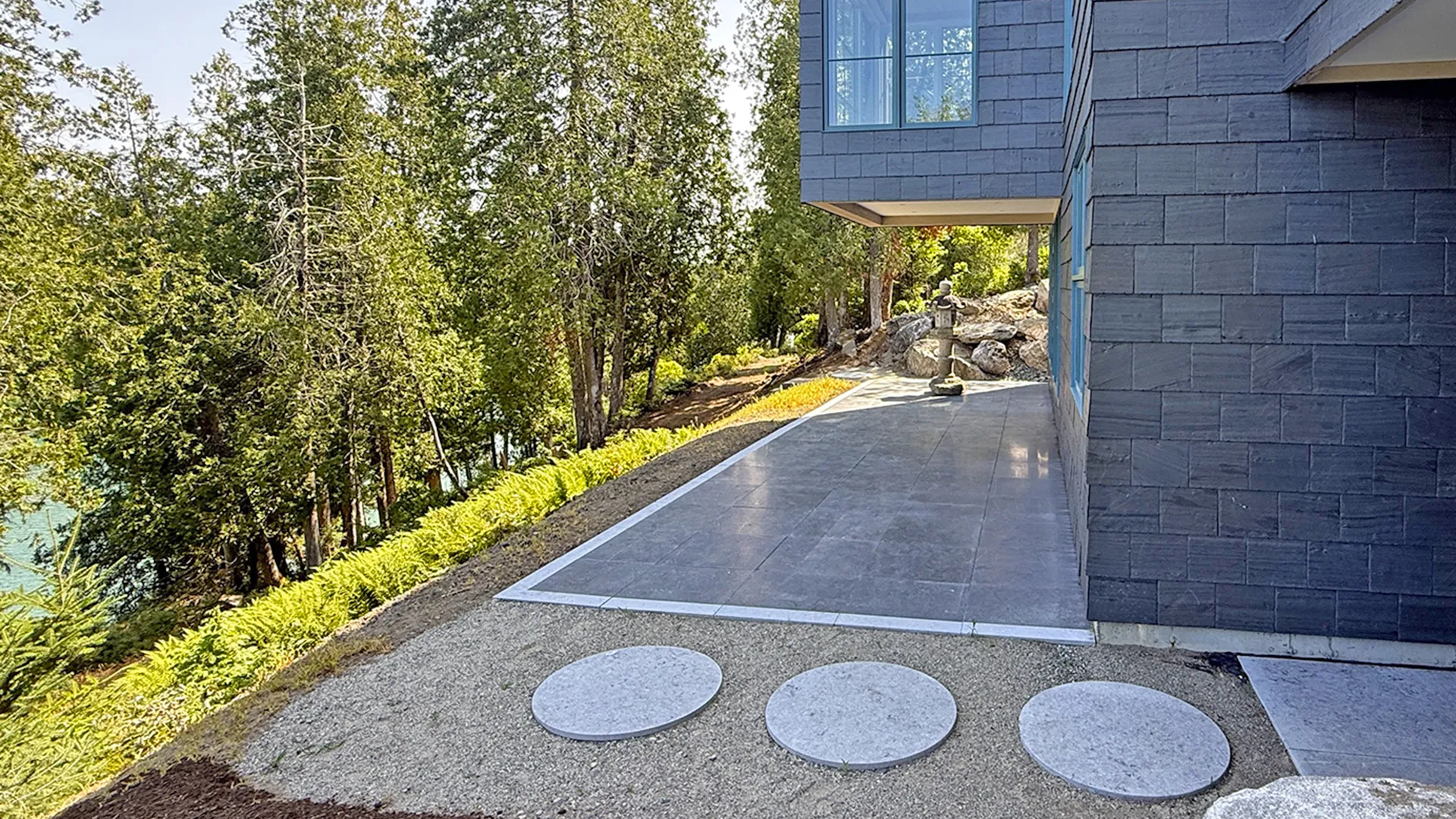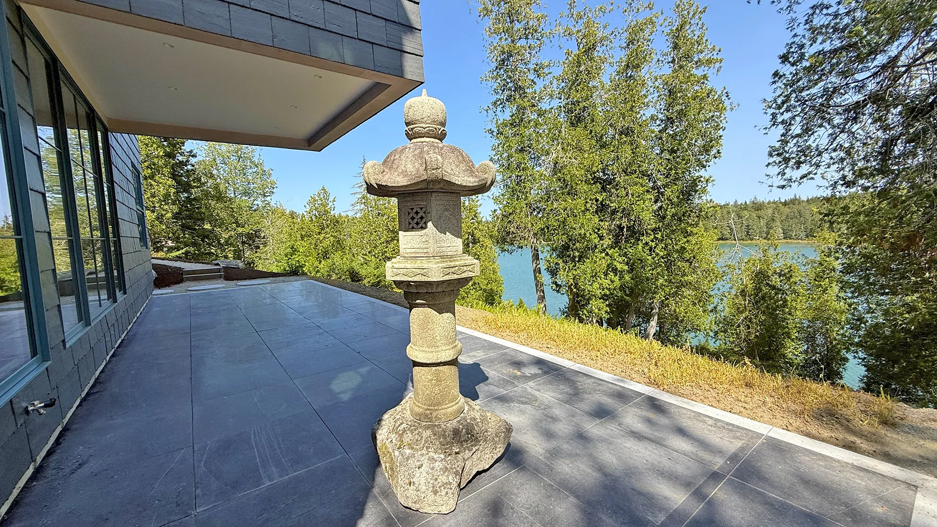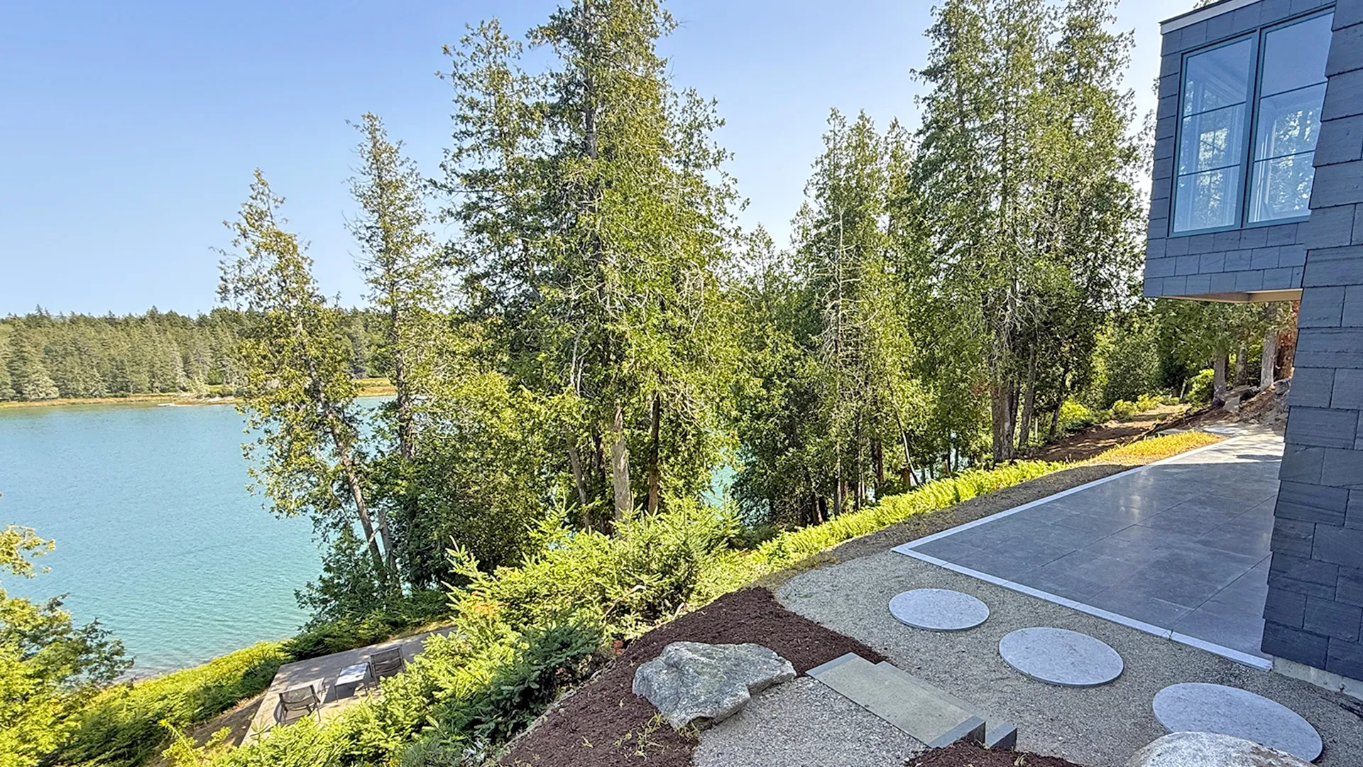 OUTDOOR SPACES: Outdoor terrace overlooking the cove. A footpath leads to a platform with chaises and a firepit overlooking the water. Tidal cove offers warmer swimming any time of day, as the reversing falls at the end of the cove makes the tides minimal. Given its new construction, this property is still improving its landscaping, but it’s not enough to diminish the overall comfort and shorefront experience!