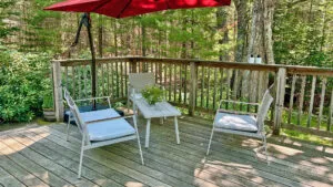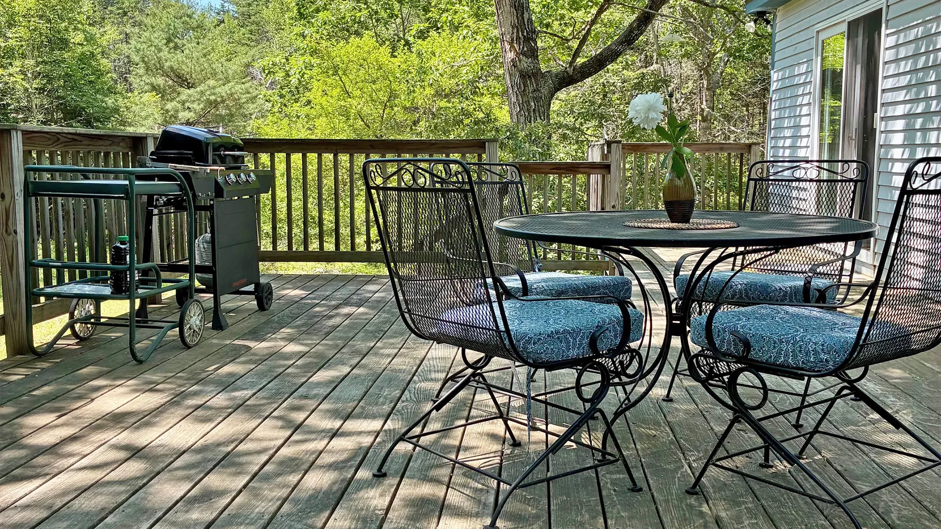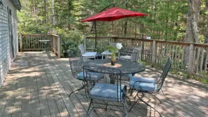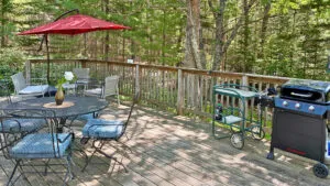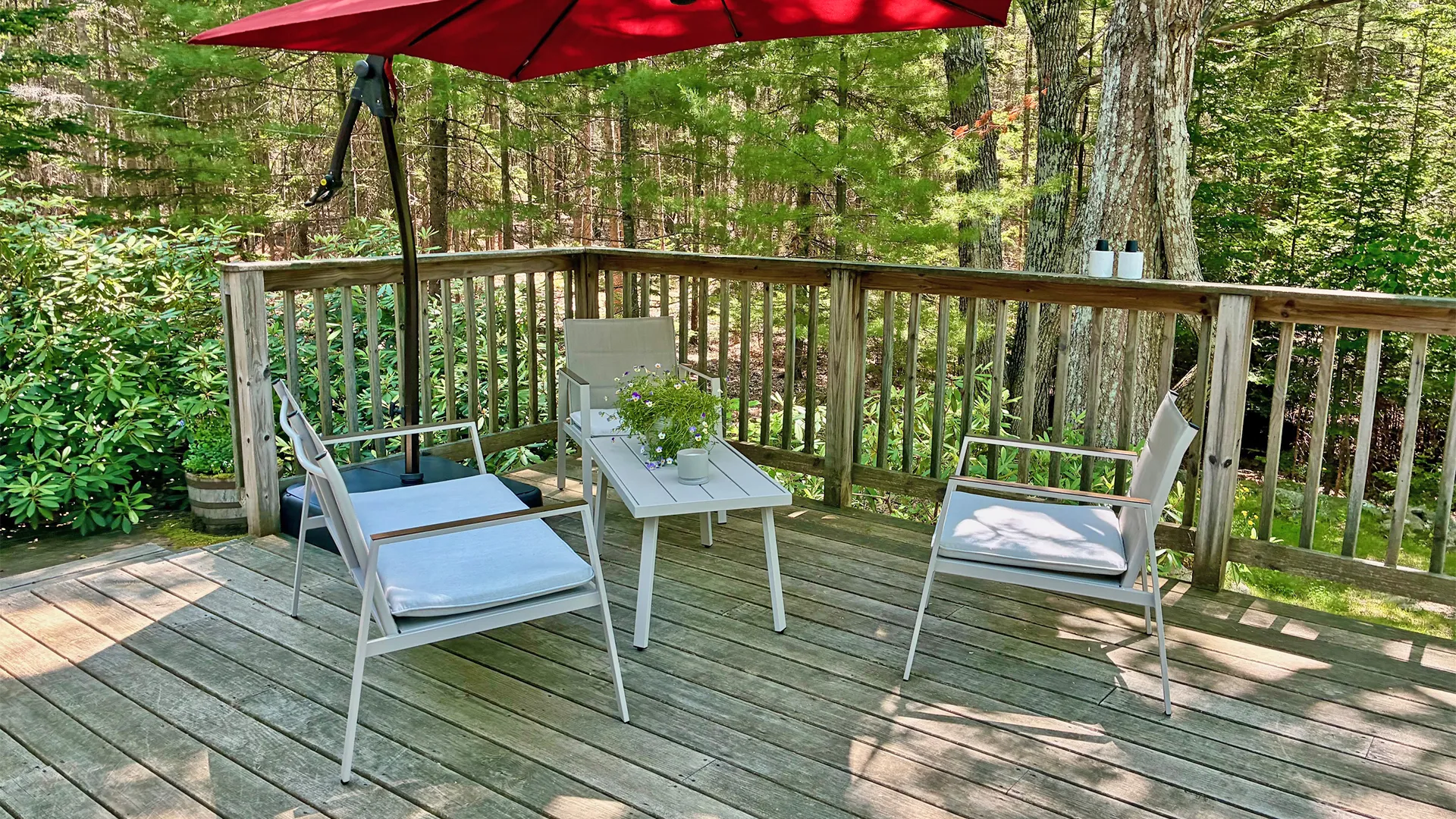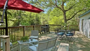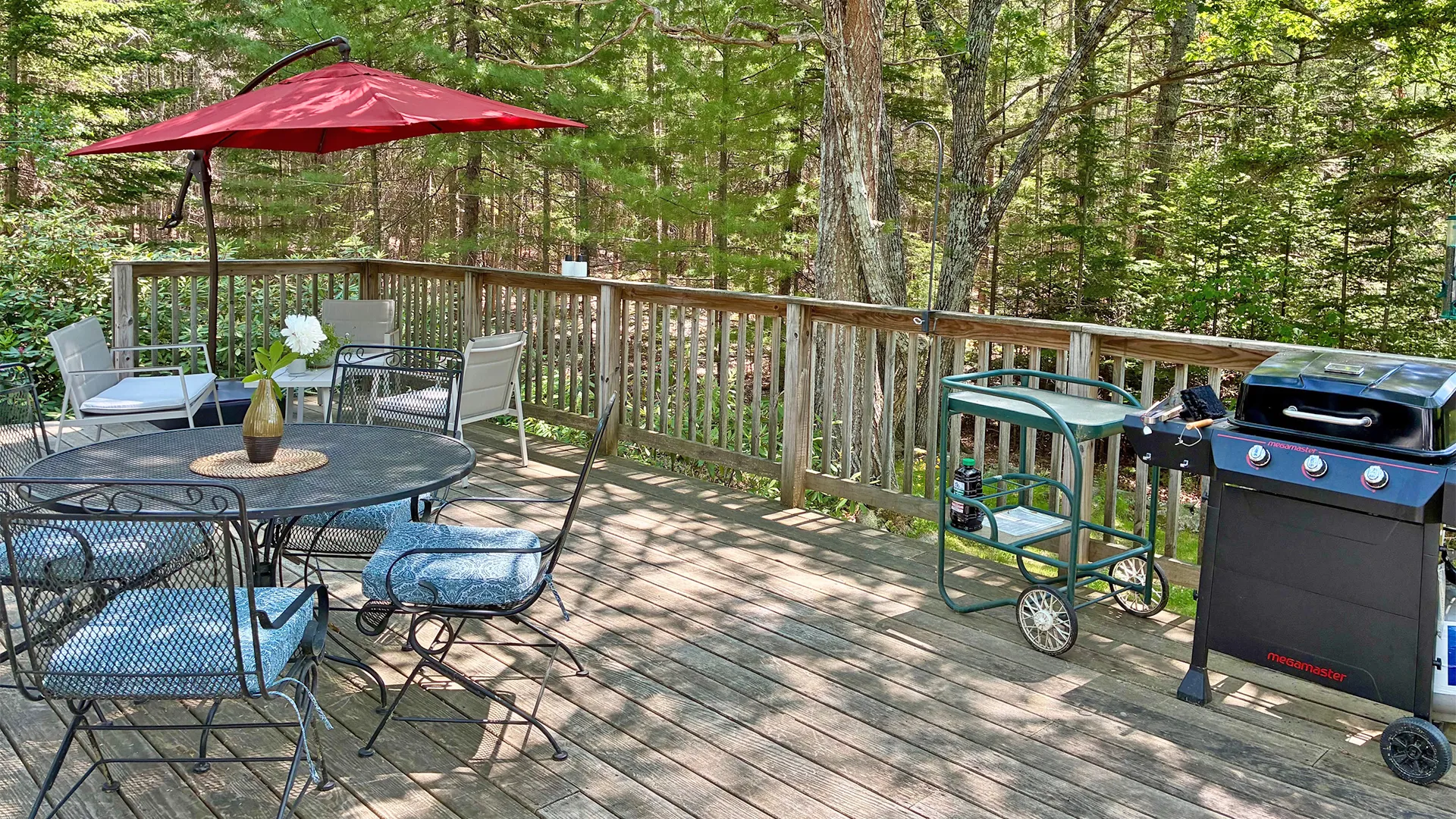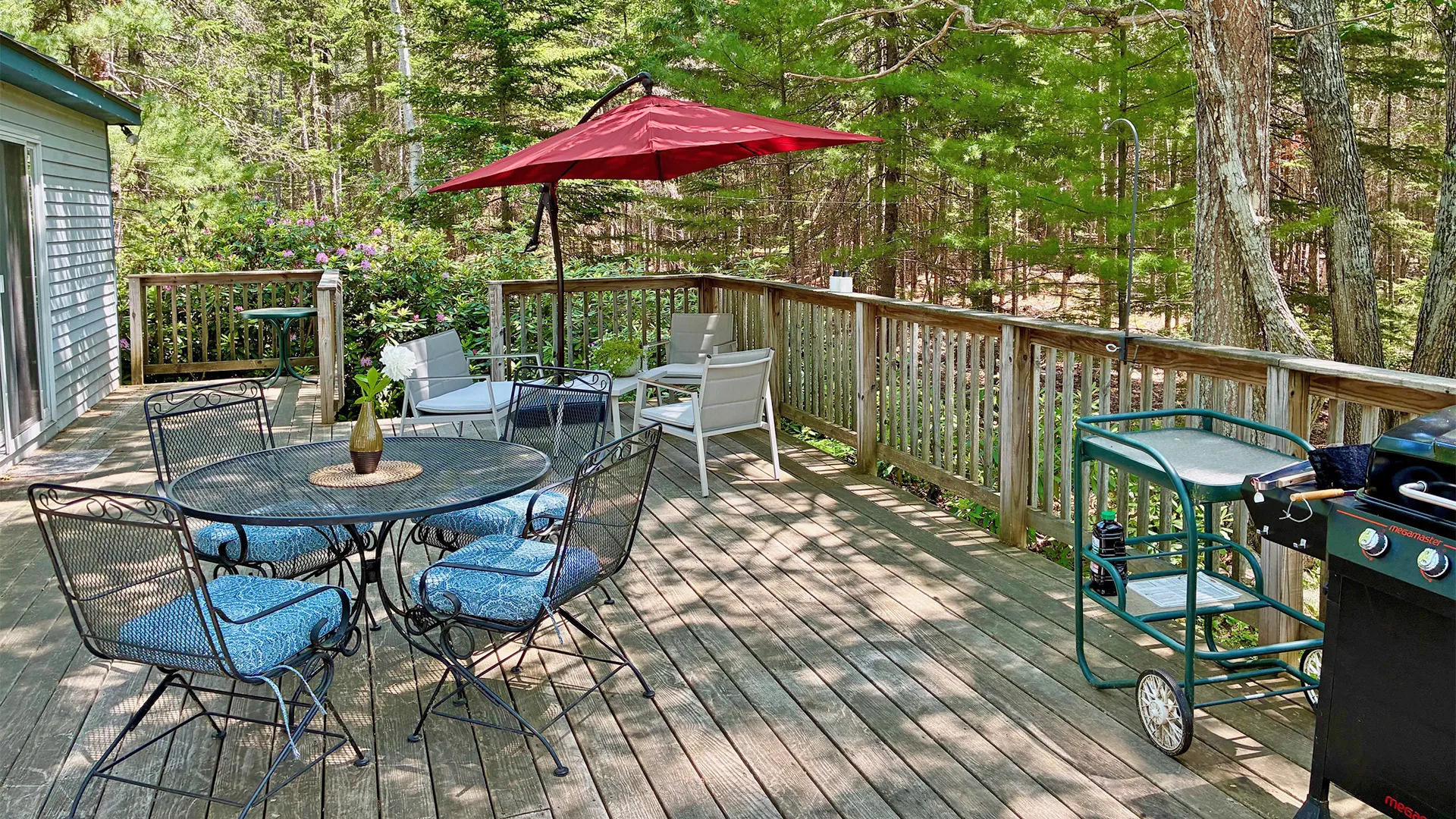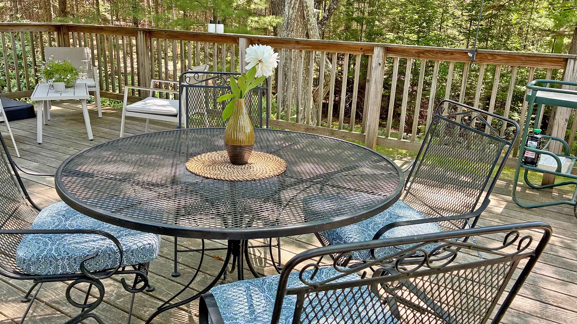 OUTDOOR SPACES: Sliders from the Living Room lead to a large, furnished elevated deck across the front of the house overlooking the back yard and surrounding woods. Woodland paths thread their way in the surrounding property providing short but sweet opportunities to wander the woods for birdwatching or simply enjoying the outdoors!