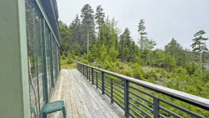 FIRST FLOOR: Entry leads to an expansive combined Living and Dining Area with showcase fireplace and three walls of windows and sliding doors overlooking a stunning view of Sawyer’s Cove. Pretty harvest table seats 6 to 8 easily. Updated Kitchen is open to the Living area and is well stocked for meal prep and entertaining. Primary Bedroom with Queen Bed, TV, en suite Full Bath with walk-in shower, and a wall of windows overlooking the water, plus a slider to the deck. Bedroom with Queen Bed and semi-private en suite Full Bath with combined tub and shower that features an entrance off the hall as well as one from the bedroom.