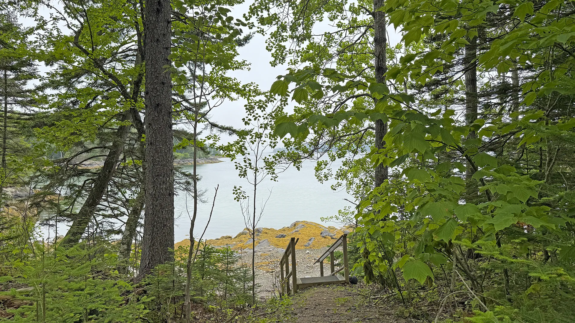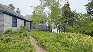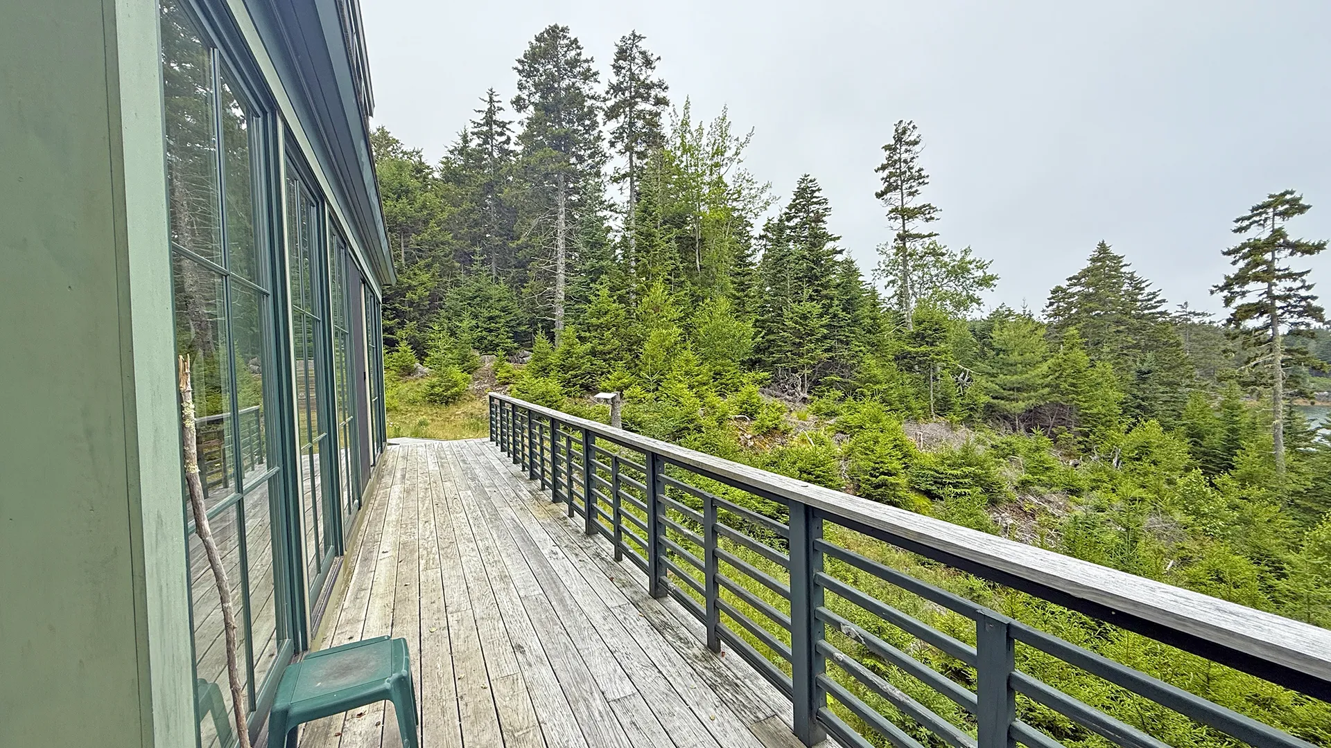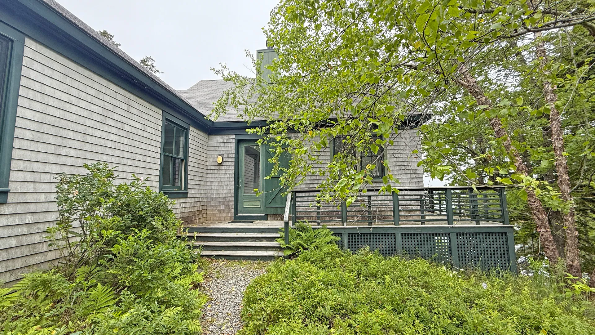 OUTDOOR SPACES: Sliders lead from the Living Area to a furnished deck across the front of the house overlooking the water. Surrounding the house are mature woods of pine and spruce. Just off the driveway is a footpath that leads down the hill to steps that go onto a shale and ledge shore. One particularly stunning smooth granite ledge looks absolutely perfect for a picnic, relaxing with your summer read, or a nice nap in the sun! For those traveling in late July and August, be sure to enjoy the wild blueberries growing along the entrance path leading to the front door!