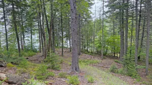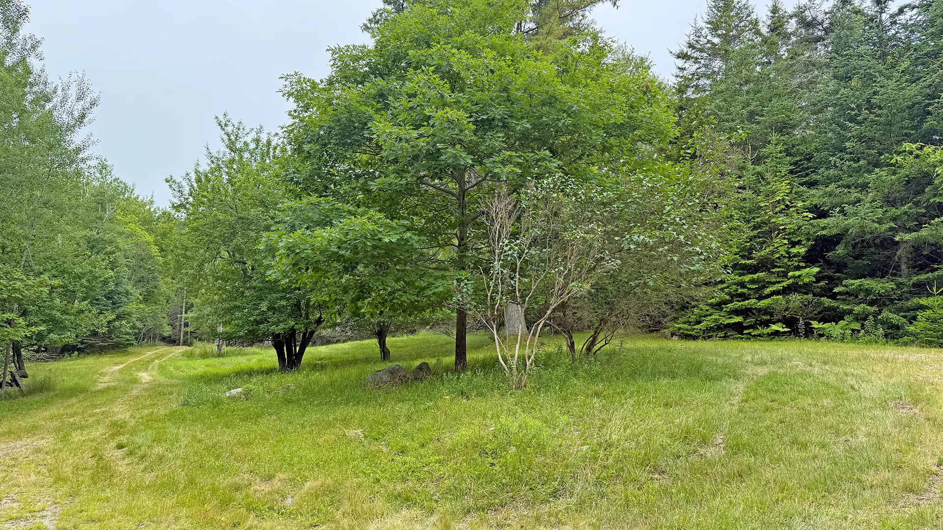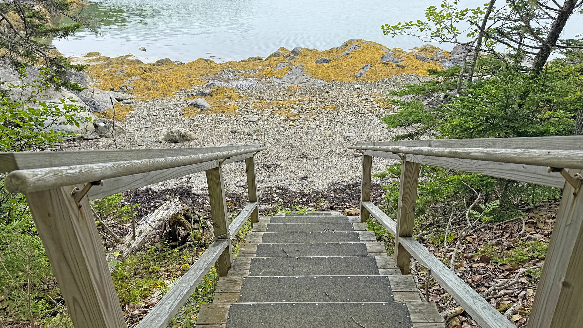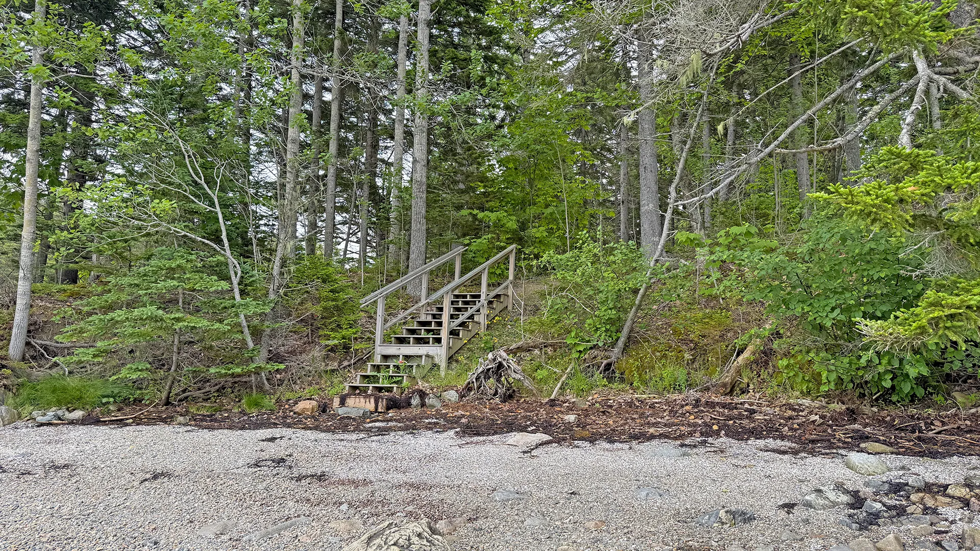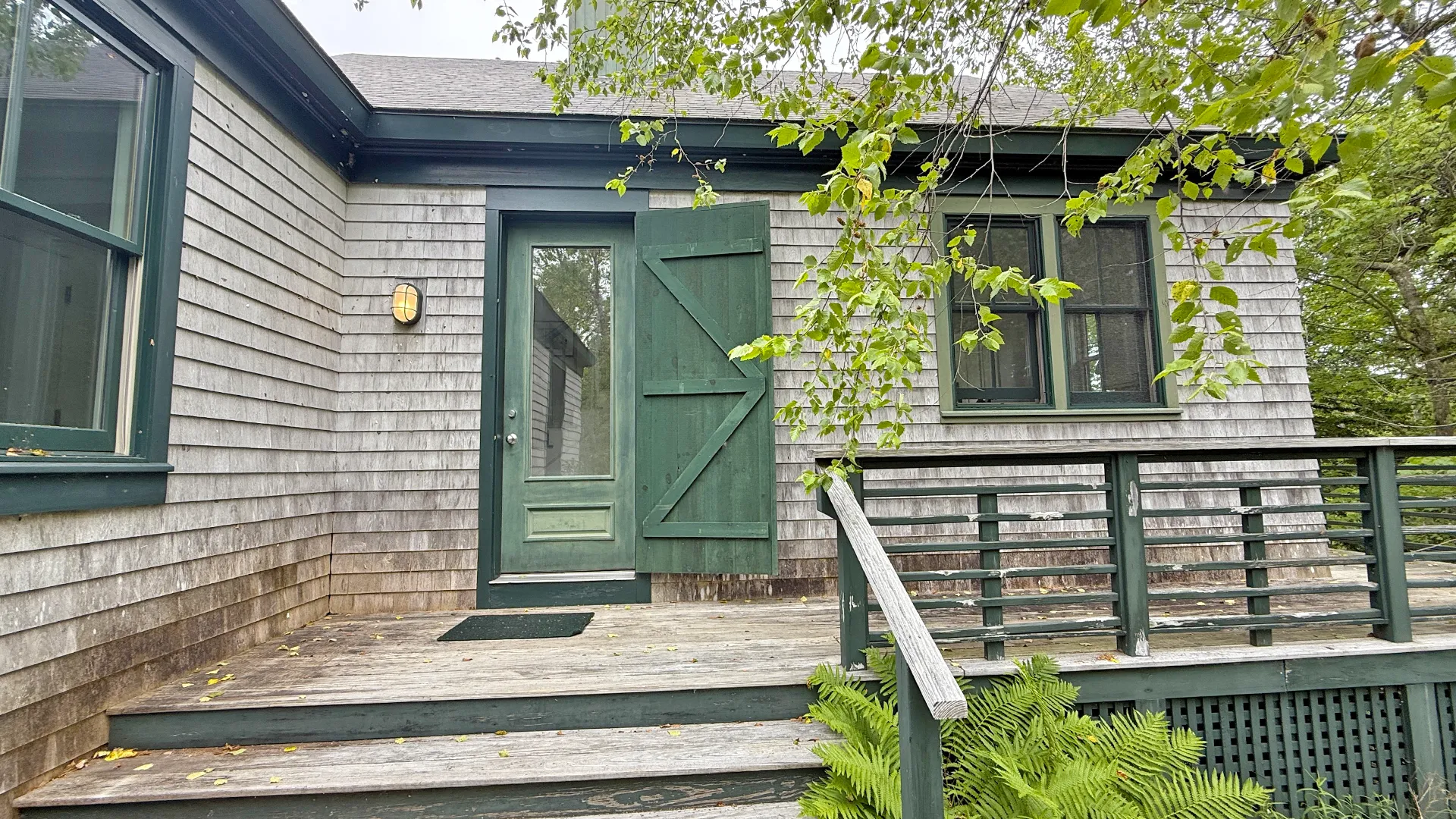 OUTDOOR SPACES: Sliders lead from the Living Area to a furnished deck across the front of the house overlooking the water. Surrounding the house are mature woods of pine and spruce. Just off the driveway is a footpath that leads down the hill to steps that go onto a shale and ledge shore. One particularly stunning smooth granite ledge looks absolutely perfect for a picnic, relaxing with your summer read, or a nice nap in the sun! For those traveling in late July and August, be sure to enjoy the wild blueberries growing along the entrance path leading to the front door!