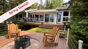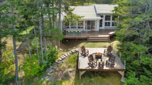 OUTDOOR SPACES: Spacious deck that is ideal for lounging and enjoying the sunshine (awning available). A few steps nearby you will find a sleek and charming lower deck with fire pit and handcrafted wooden chairs.