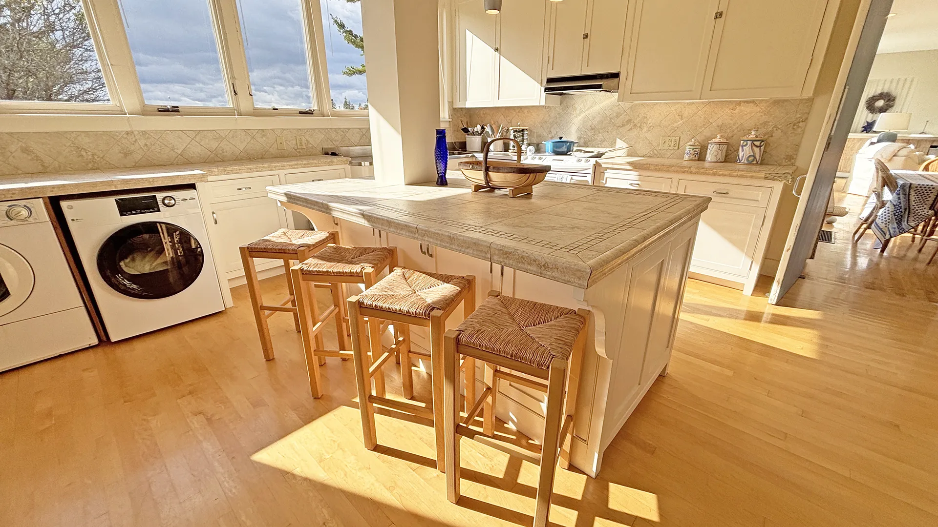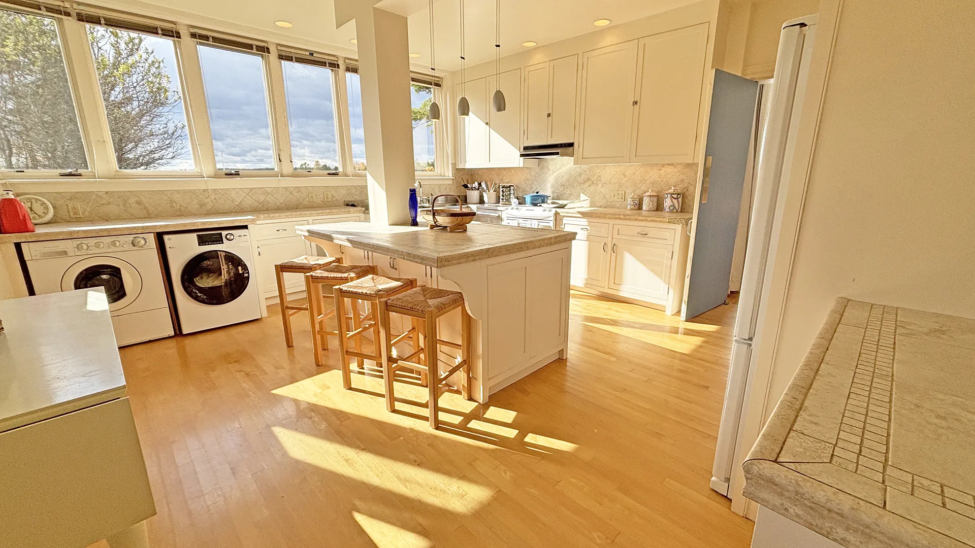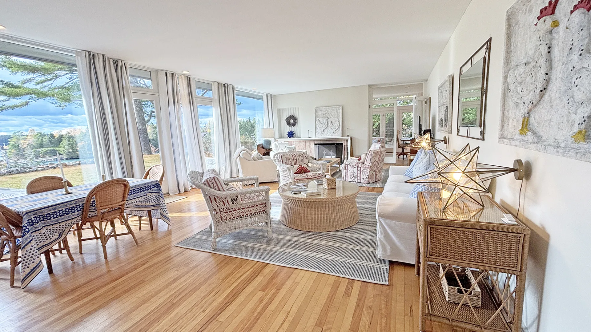 FIRST FLOOR: Entry leads to a bright expansive Living Room with fireplace and a wall of floor to ceiling windows overlooking the front lawn and the water beyond. With plenty of comfortable seating and a dining table that can easily seat four to six, plus more with expansion, this space is magical for entertaining, or simply soaking up the view. Just beyond the Living Room is a cozy den with desk areas overlooking the water. To the left of the entry, the Kitchen features updated appliances, plenty of workspace for meal prep, counter seating for four, and washer/dryer units. A half bath (not pictured) is also located adjacent in the entry hall.