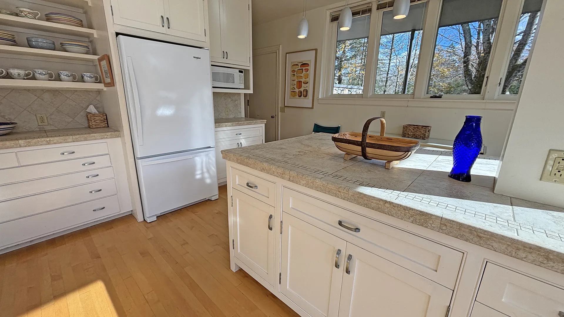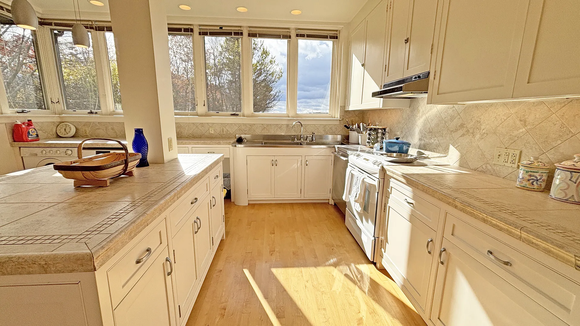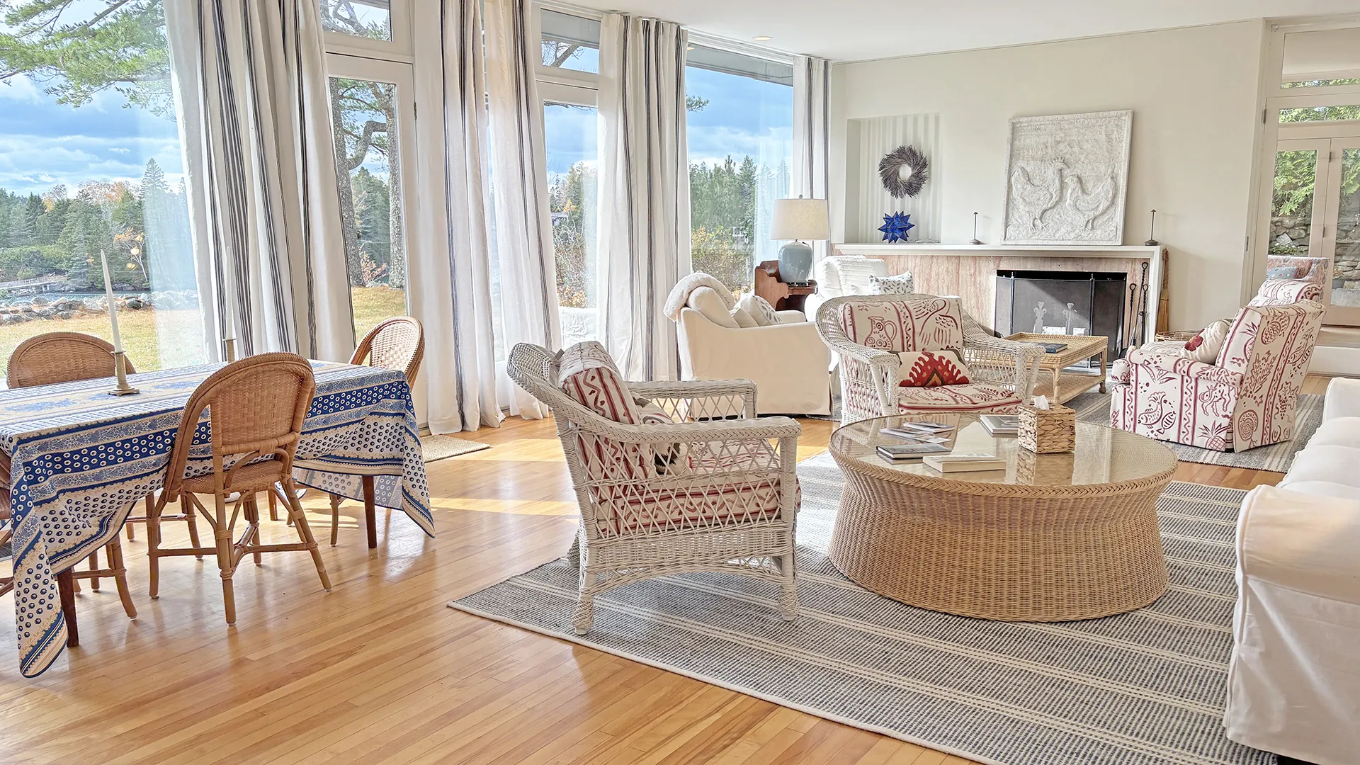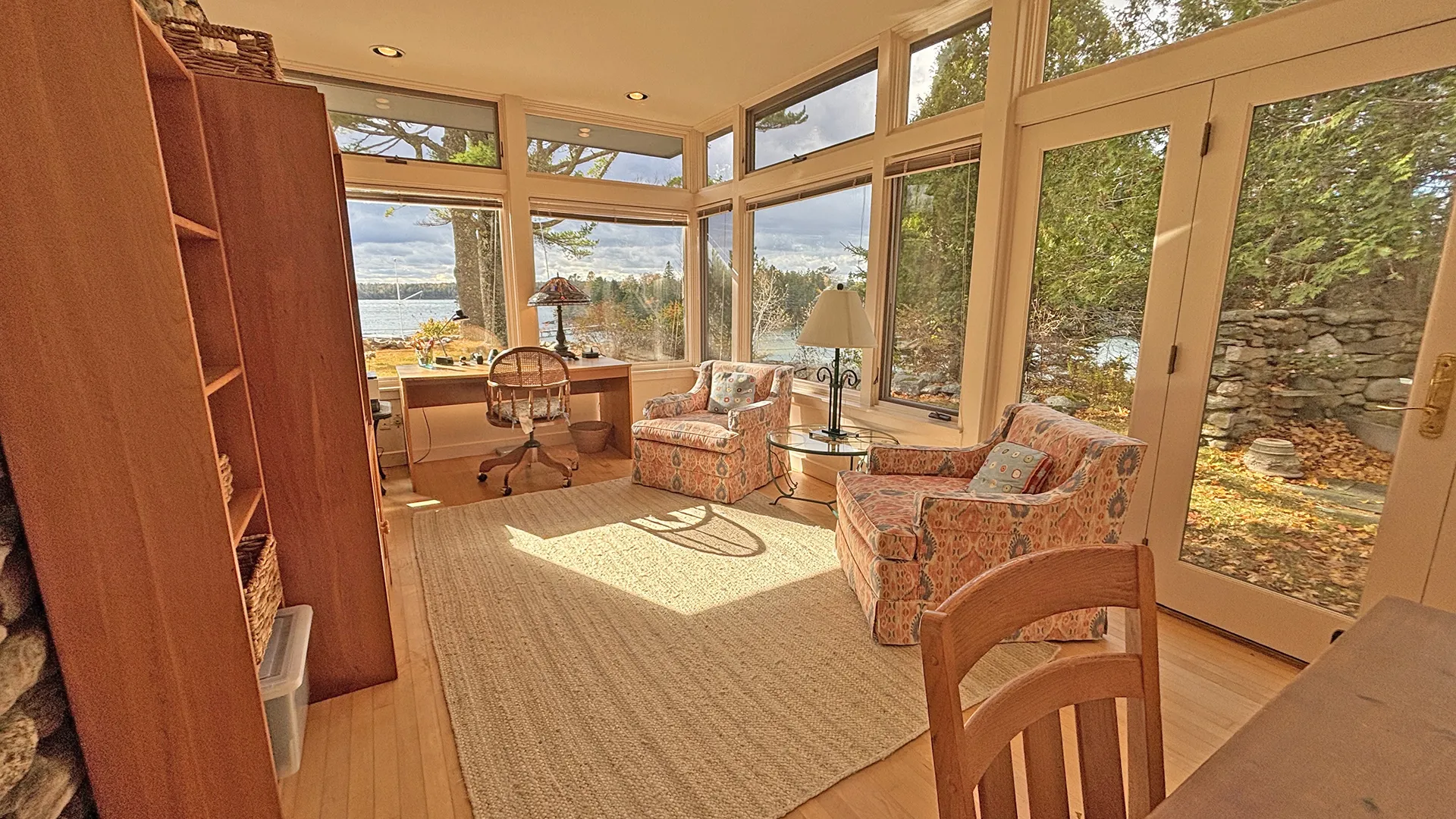 FIRST FLOOR: Entry leads to a bright expansive Living Room with fireplace and a wall of floor to ceiling windows overlooking the front lawn and the water beyond. With plenty of comfortable seating and a dining table that can easily seat four to six, plus more with expansion, this space is magical for entertaining, or simply soaking up the view. Just beyond the Living Room is a cozy den with desk areas overlooking the water. To the left of the entry, the Kitchen features updated appliances, plenty of workspace for meal prep, counter seating for four, and washer/dryer units. A half bath (not pictured) is also located adjacent in the entry hall.