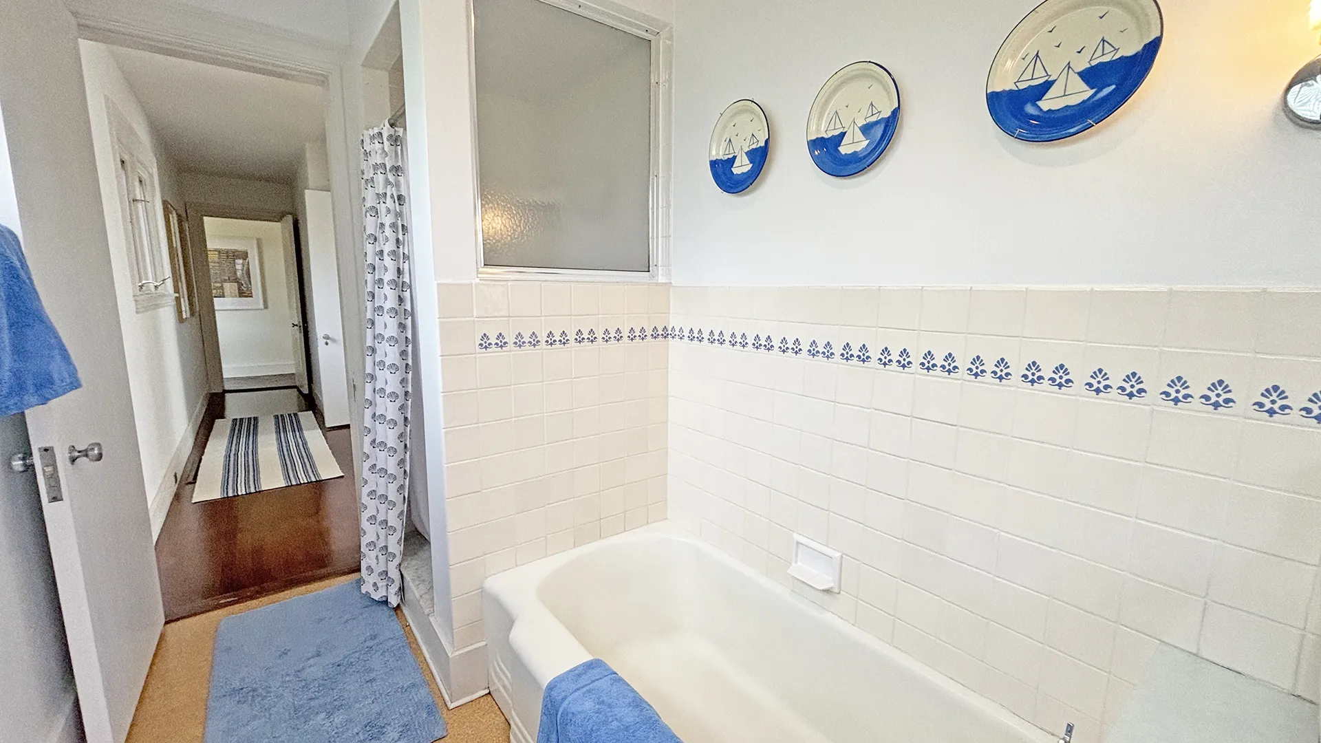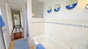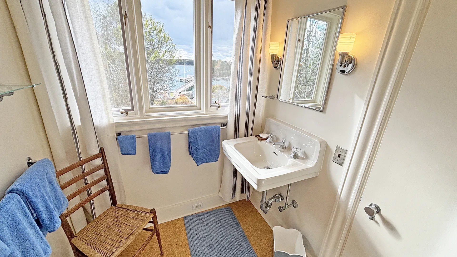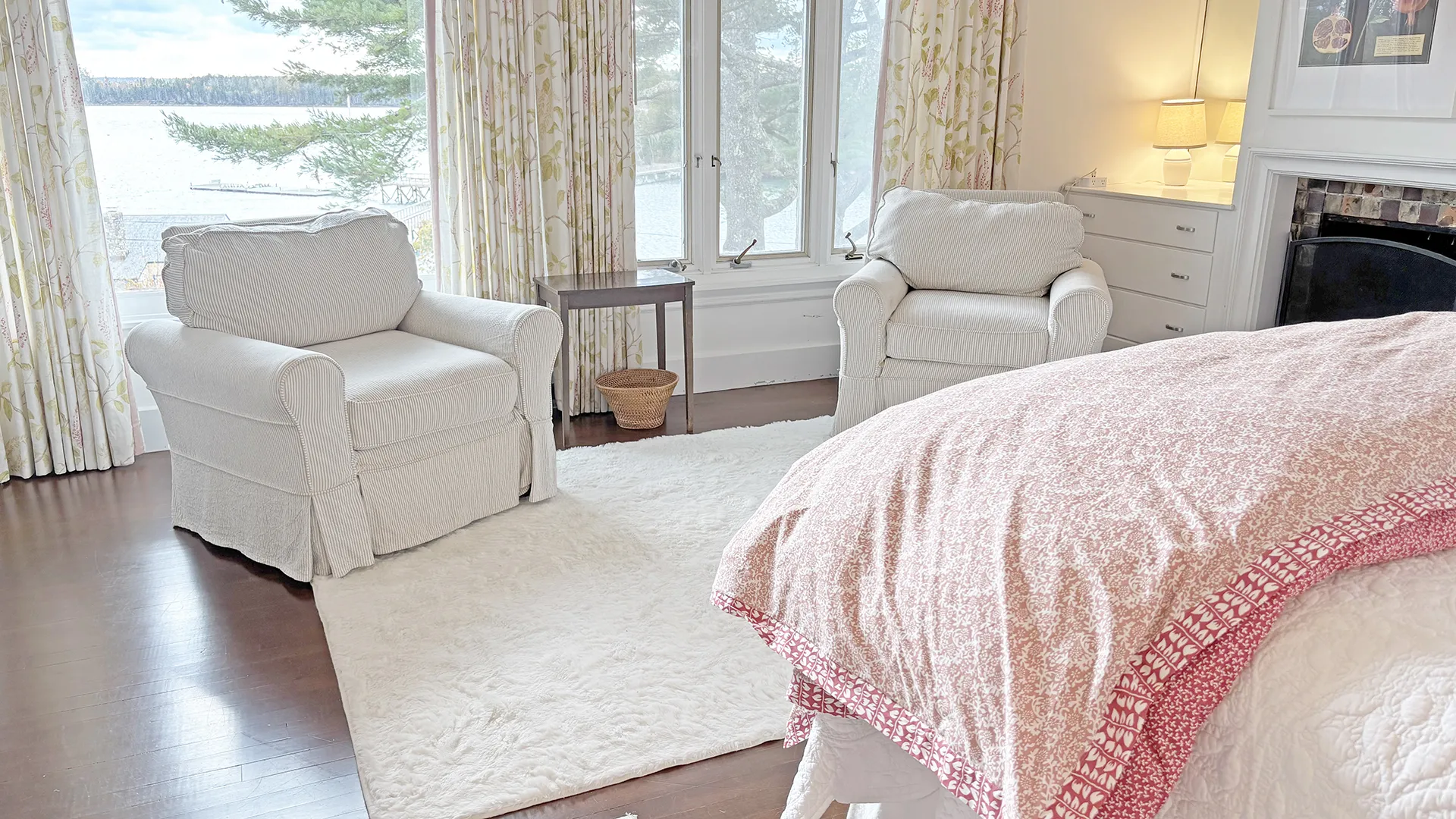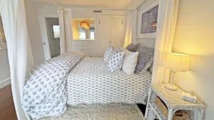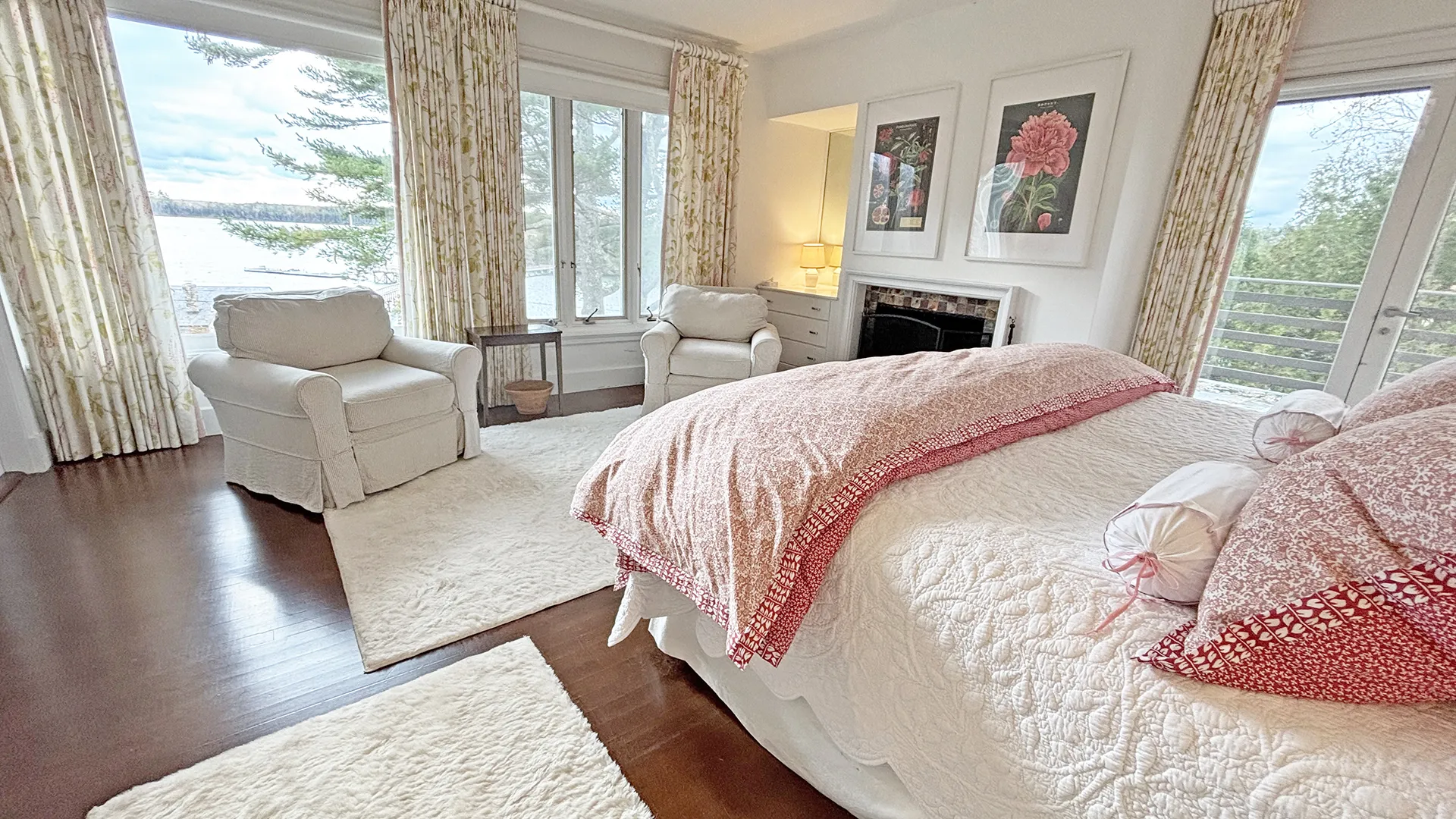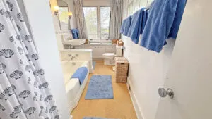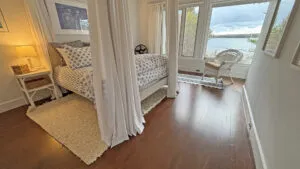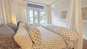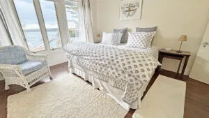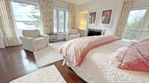SECOND FLOOR: Bedroom One features a Queen Bed and en suite Full Bath with combined tub and shower. Bedroom Two has a King Bed, water views, and en suite Full Bath with combined tub and shower. Able to be closed off as a separate wing, two bedrooms, Bedroom Three with a Queen Bed and Bedroom Four with a King Bed, share a Full Bath with separate tub and shower stall. Bedroom Four is considered the primary bedroom and enjoys access to a private balcony overlooking the lawn, water, and distant hilltops.