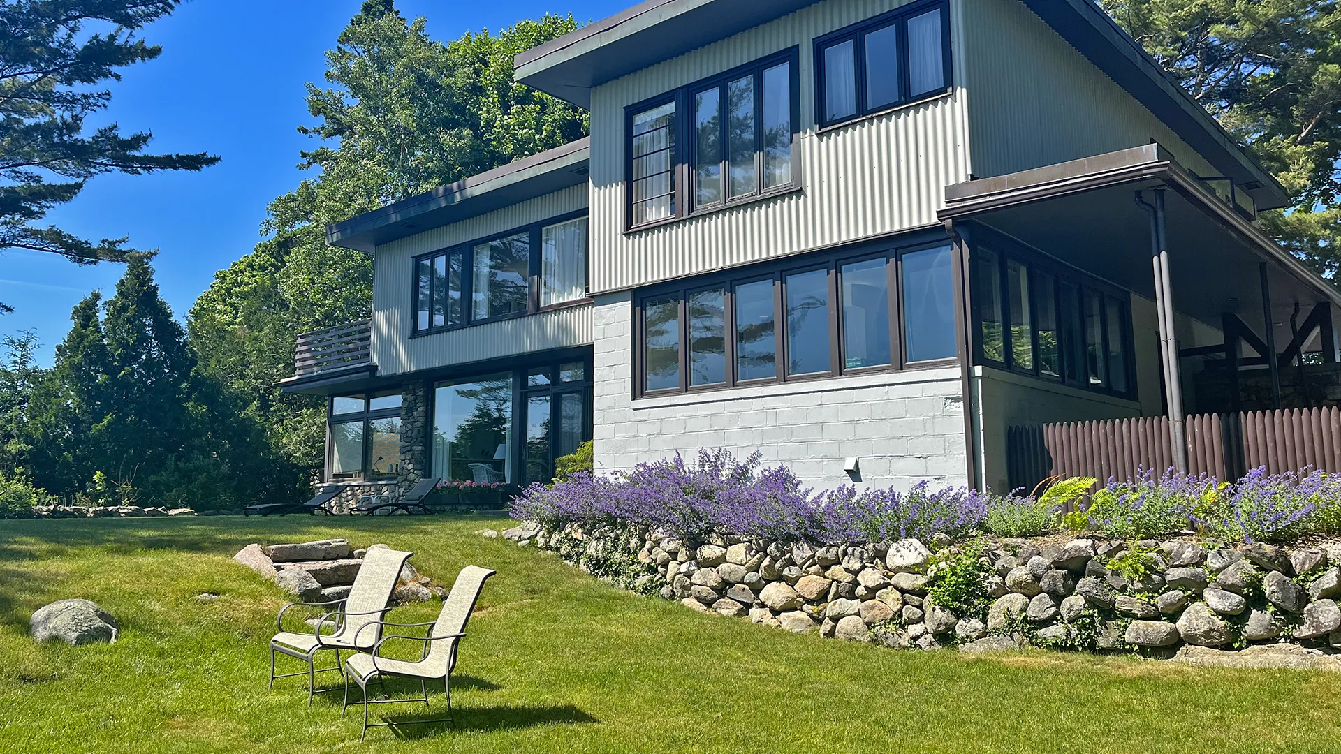 OUTDOOR SPACES: Informal outdoor seating and dining can be enjoyed on the spacious lawn, accessed from French doors in the Living Room.
