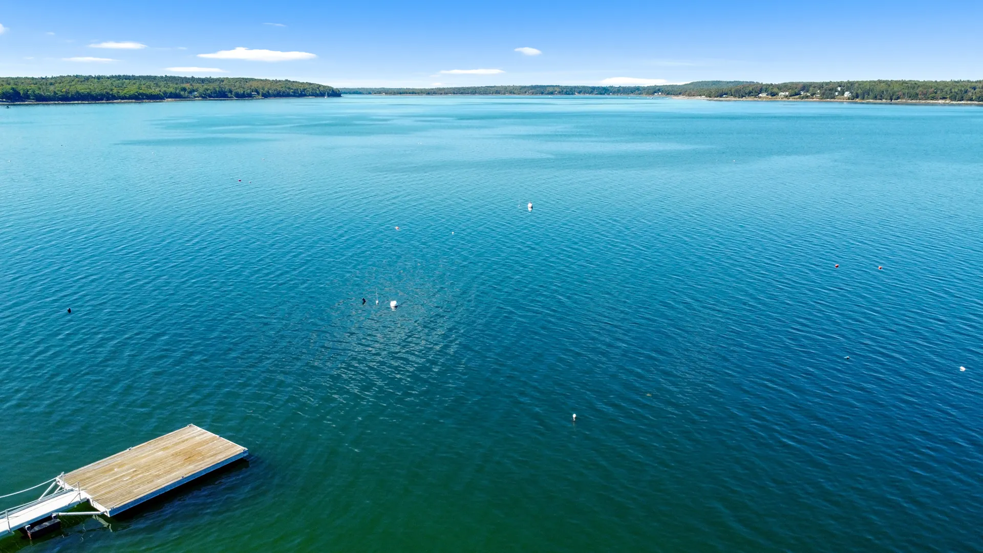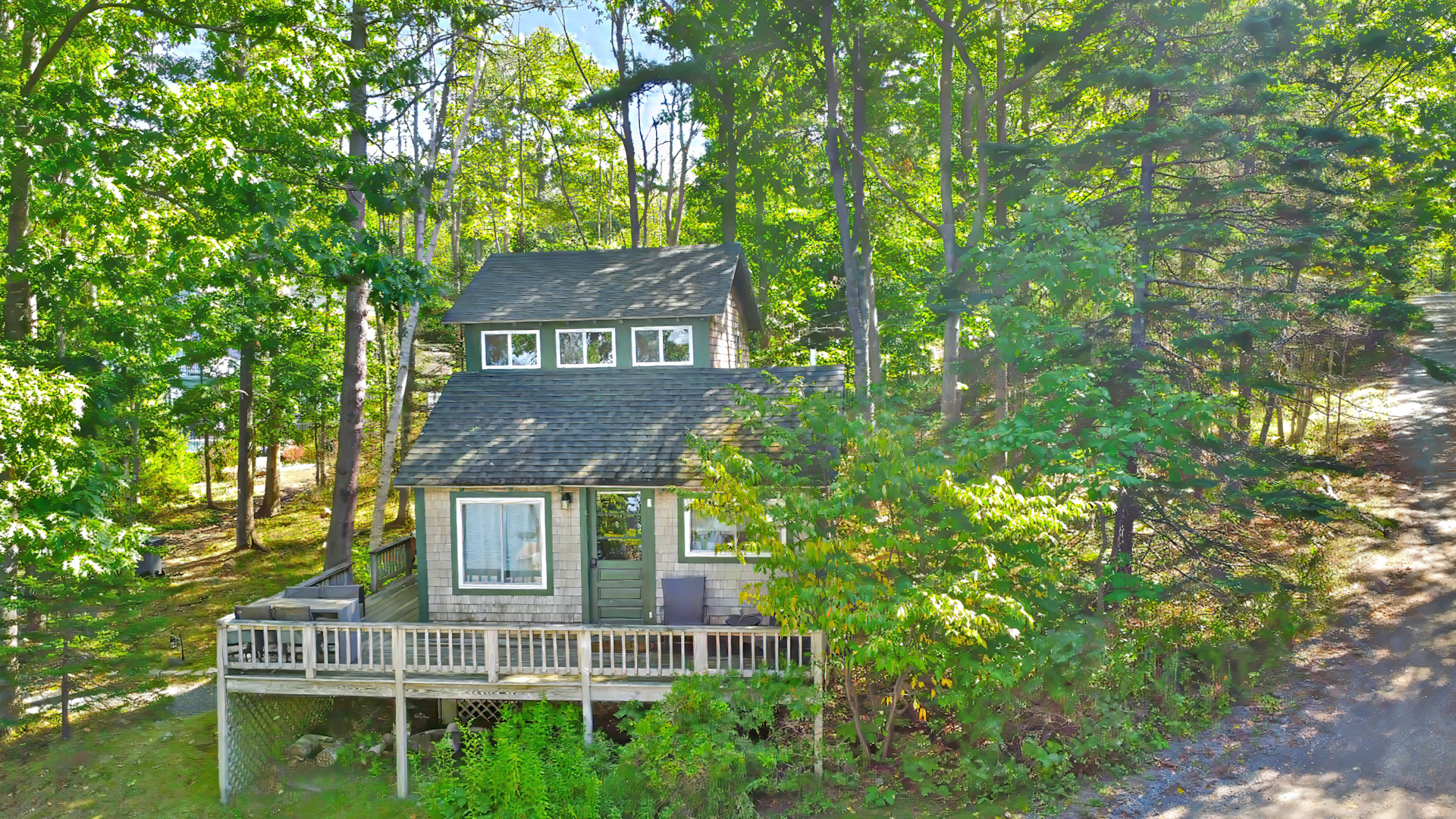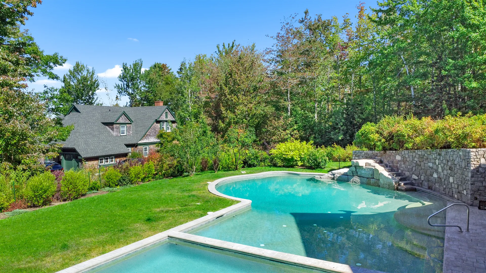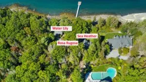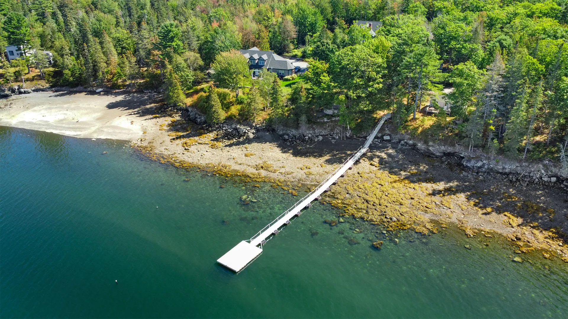 OUTDOOR SPACES: Small furnished deck across the front of the house offers pretty, filtered views to the water as a well as a comfortable spot to dine or relax outside. Nice yard space for safe play, and, best of all – just a short walk from the house a luxurious pool is available for guests’ use, shared with the other three residences on the property, one of which is the owner’s. The other two residences may or may not be occupied by tenants. A shared fire pit space is also available for tenants’ use. Stairs lead to the protected, kid friendly shorefront, mostly composed of shale, rocky sand, and some ledge.