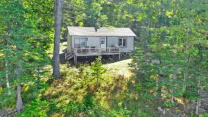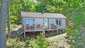 FIRST FLOOR: From its water facing entry, step into this sweet bungalow which proves that good things do come in small packages! Open interiors, studio-style, with a large propane fireplace dividing the sleeping area from the kitchen. A beautiful Asian screen provides privacy from the bathroom area. Wall mounted TV, with deluxe King sized Bed. Although lacking a full Kitchen, guests have sufficient counter appliances (apartment-sized fridge, convection toaster oven, microwave, and coffee maker) to prepare simple meals or morning coffee. Full Bath with extra large walk-in shower and separate water closet for privacy.OUTDOOR SPACES: Furnished deck with pretty views across the water to the mainland beyond as a well as a comfortable spot to dine or relax outside. Nice yard space for safe play, and, best of all – just a short walk from the house a luxurious pool is available for guests’ use, shared with the other three residences on the property, one of which is the owner’s. The other two residences may or may not be occupied by tenants. A shared stonework fire pit is also available for tenants’ use. Stairs lead to the protected, kid friendly shorefront, mostly composed of shale, rocky sand, and some ledge.