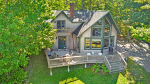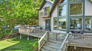 FIRST FLOOR: Entry from the non-water side of the house opens to a fabulous eat-in kitchen with large table that easily seated eight plus counter seating for two. The Kitchen opens to a spacious Living Room with cathedral ceilings, a wall of windows overlooking the lawn and shoreline below, TV, plenty of cozy seating, and doors to the front deck. A Bedroom with Queen bed is near the front entry, as is a shared Full Bath with stall shower and door leading to the front deck. Laundry is located in the basement.SECOND FLOOR: To the left of the stairs, a Primary Bedroom features a King Bed, doors to a balcony overlooking the water, and en suite Full Bath with spectacular walk-in shower. To the right of the stairs, a Bedroom with two Double Beds and unique window overlooking Living Area and out to the water views. Note that this bedroom would share the 1st floor full bath or the en suite bath in the Primary Bedroom.
