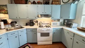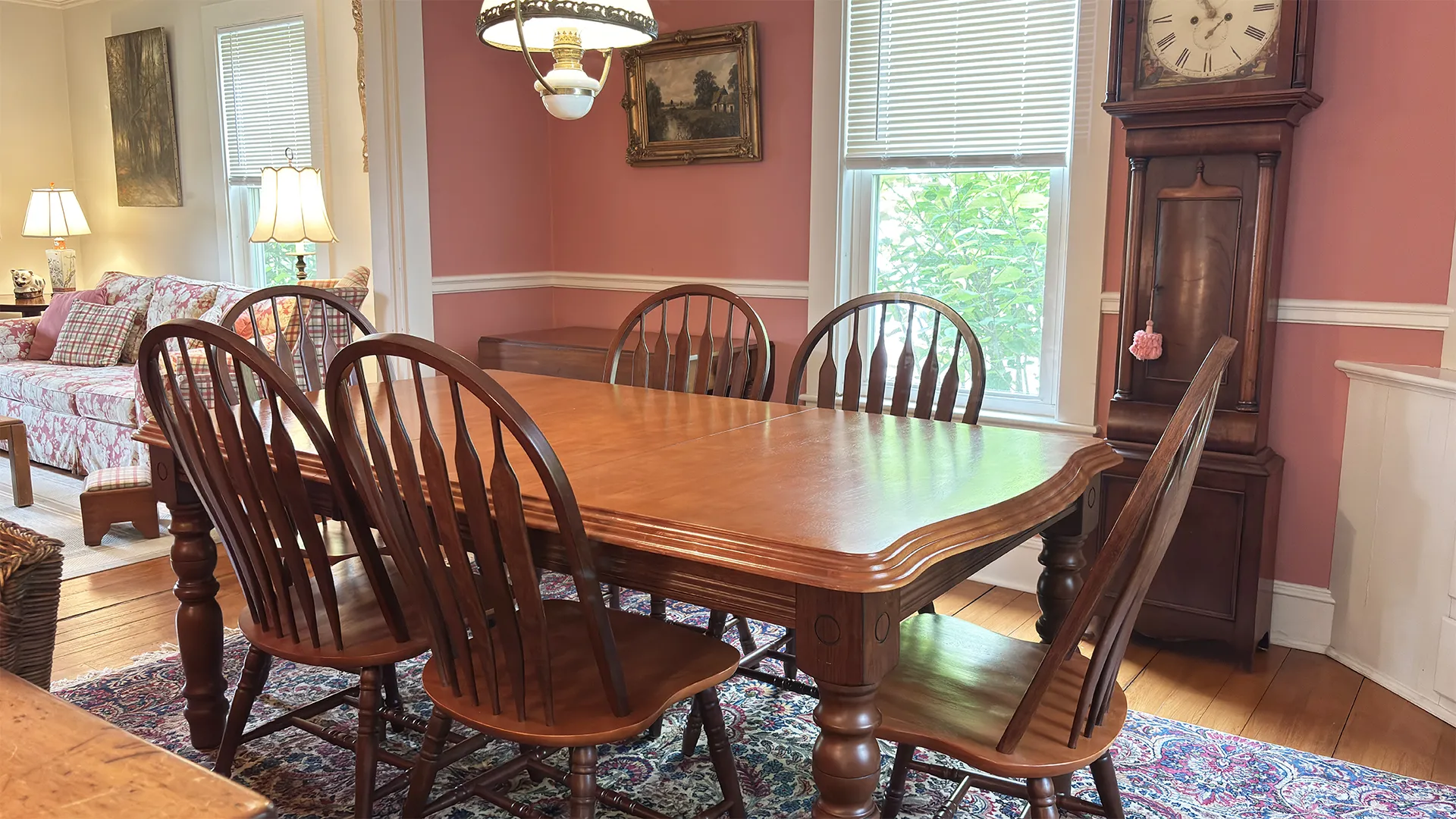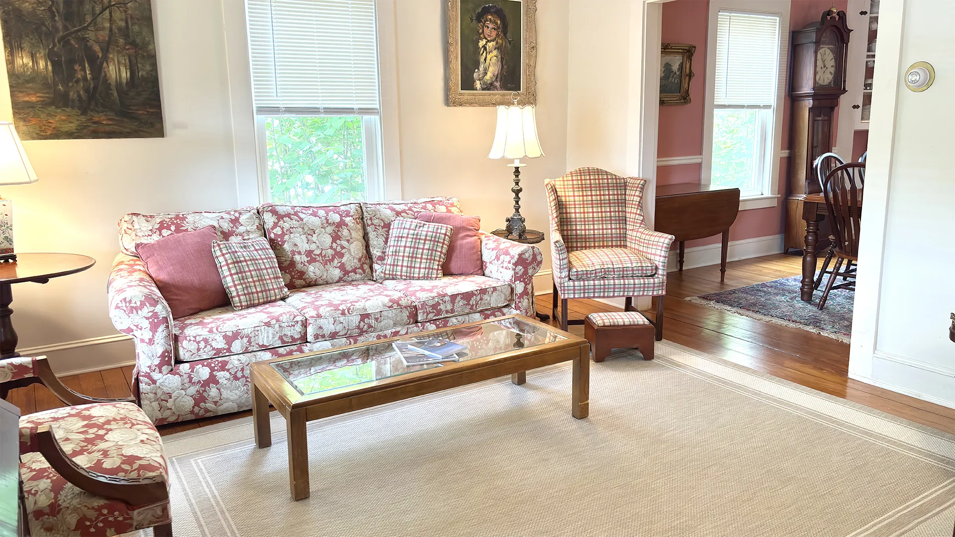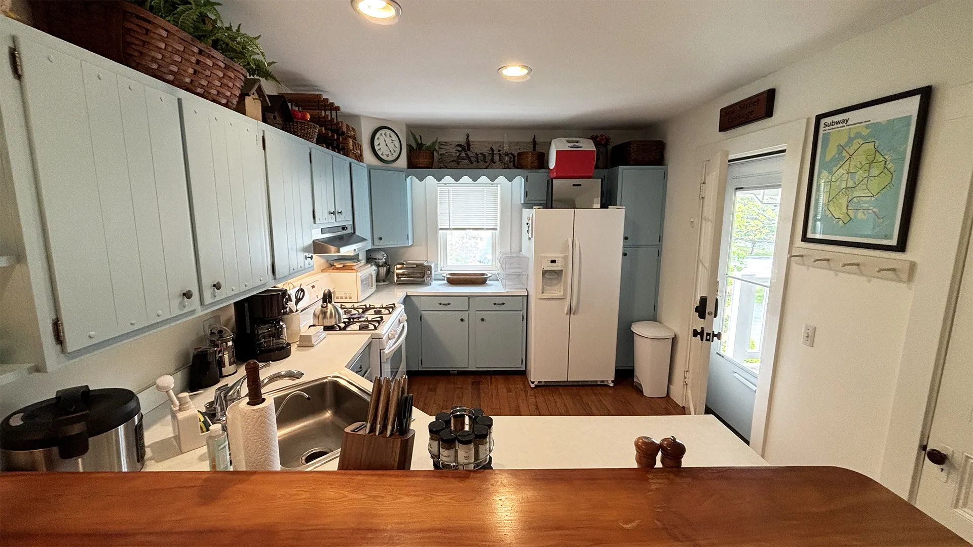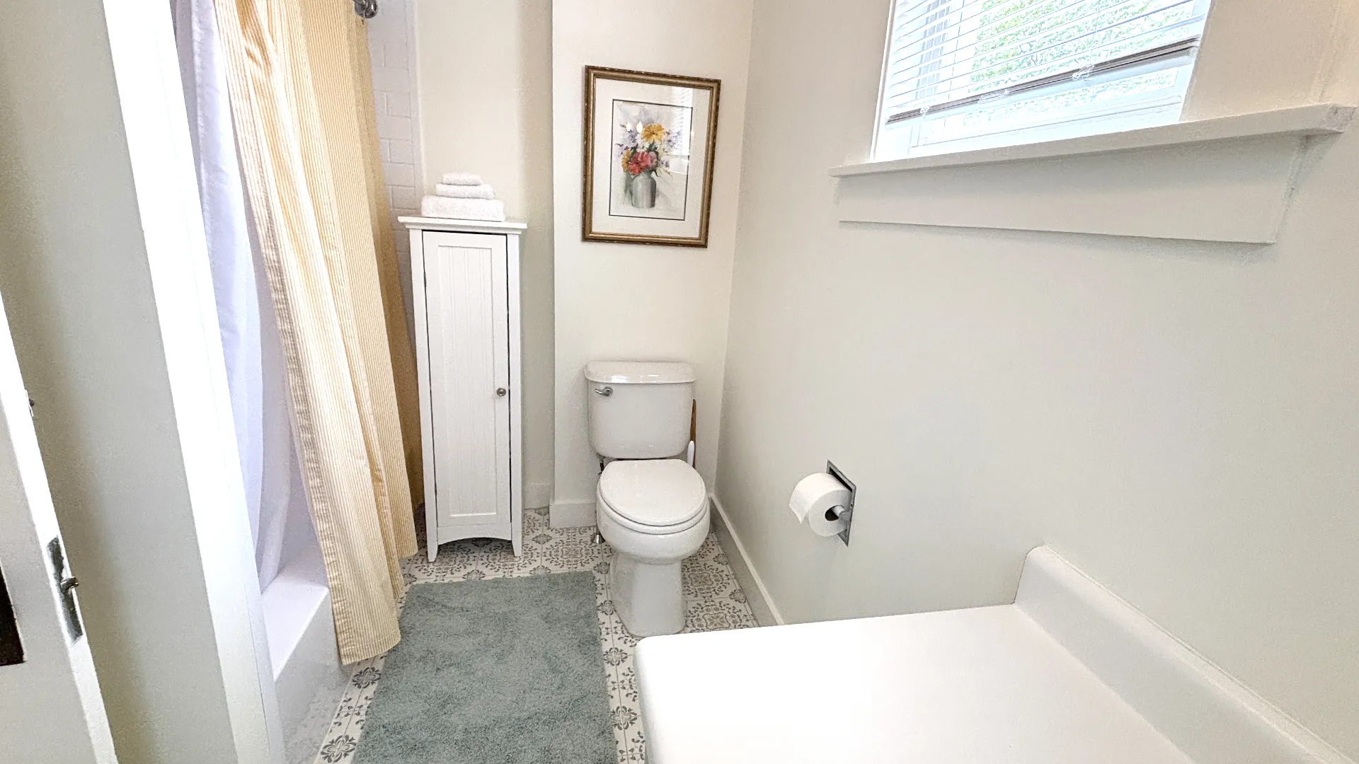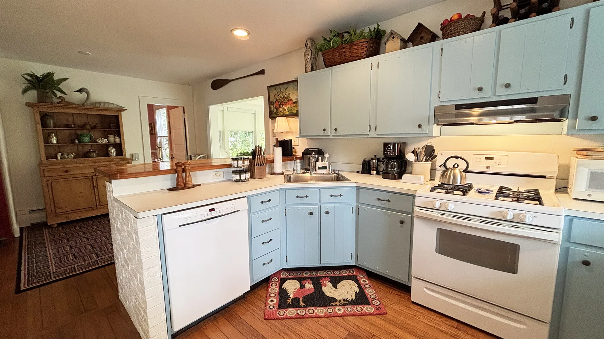 FIRST FLOOR: Stairs from the driveway lead to the side entry into a bright, roomy Kitchen with updated appliances, plenty of cookware, and counter seating for four people. A Half Bath is also located next to the Kitchen. Adjacent to the Kitchen and facing the spacious backyard is a lovely “Garden Room,” with three walls of windows and a sliding door to a small deck. At the street side of the house is a cozy Den with TV. A formal but comfortable Living Room, plus a semi-formal Dining Room with table that seats six rounds out the first floor.