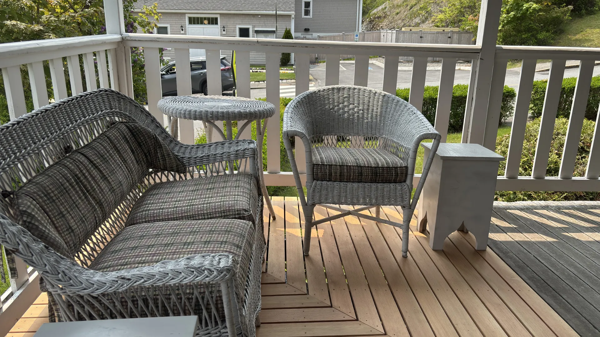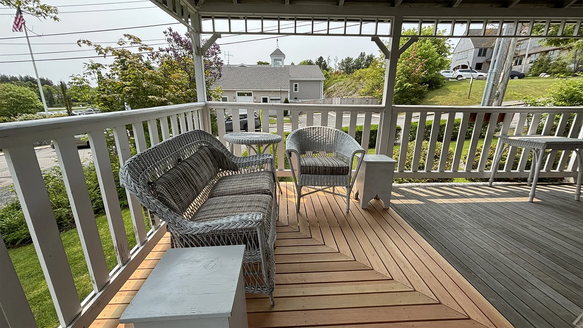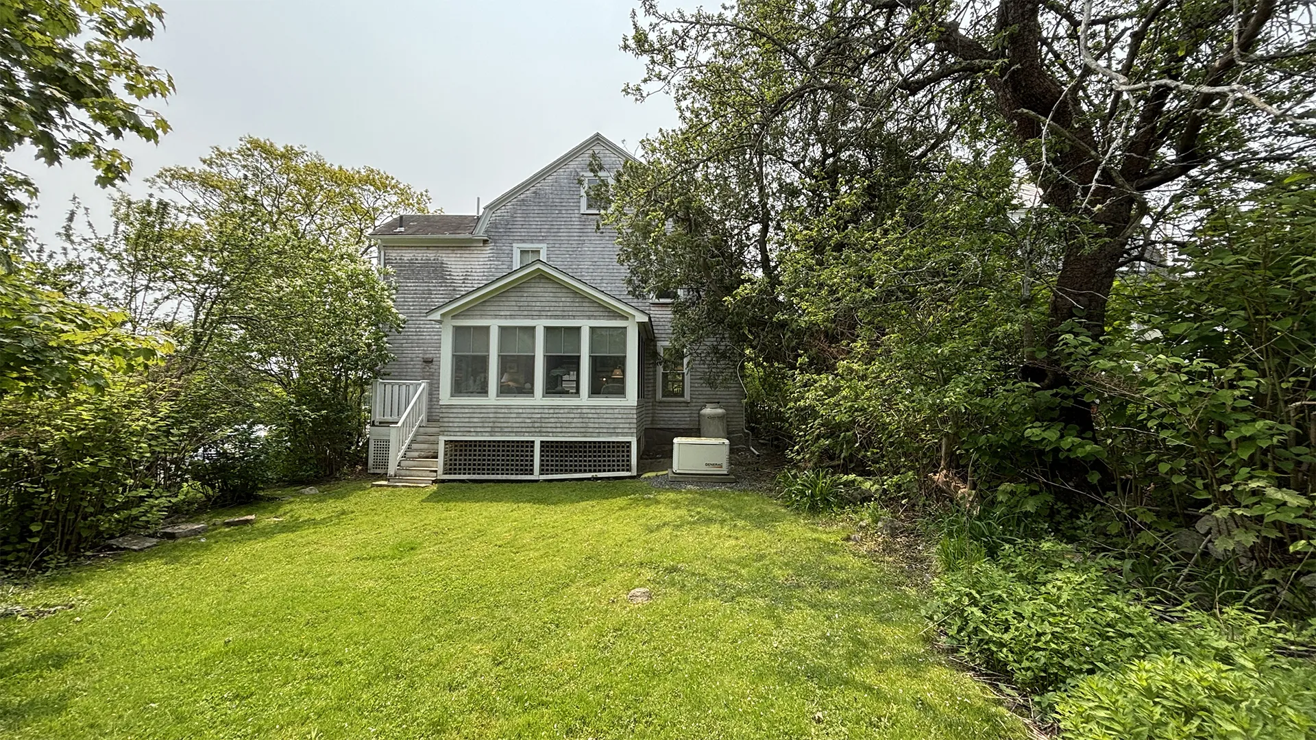 OUTDOOR SPACES: Accessed from the Kitchen or from the Living Room, a wrap-around covered porch provides ample sitting and dining areas overlooking the front and side yards. A smaller deck, accessed by sliders from the Garden Room, accommodates a propane grill and overlooks the roomy backyard, safe for play and private in feel. Off-street parking for up to three cars. Note that this road is relatively quiet, but will have pedestrian traffic during the day. While the town office and fire station are across the road, this part of town is generally considered very quiet at night.