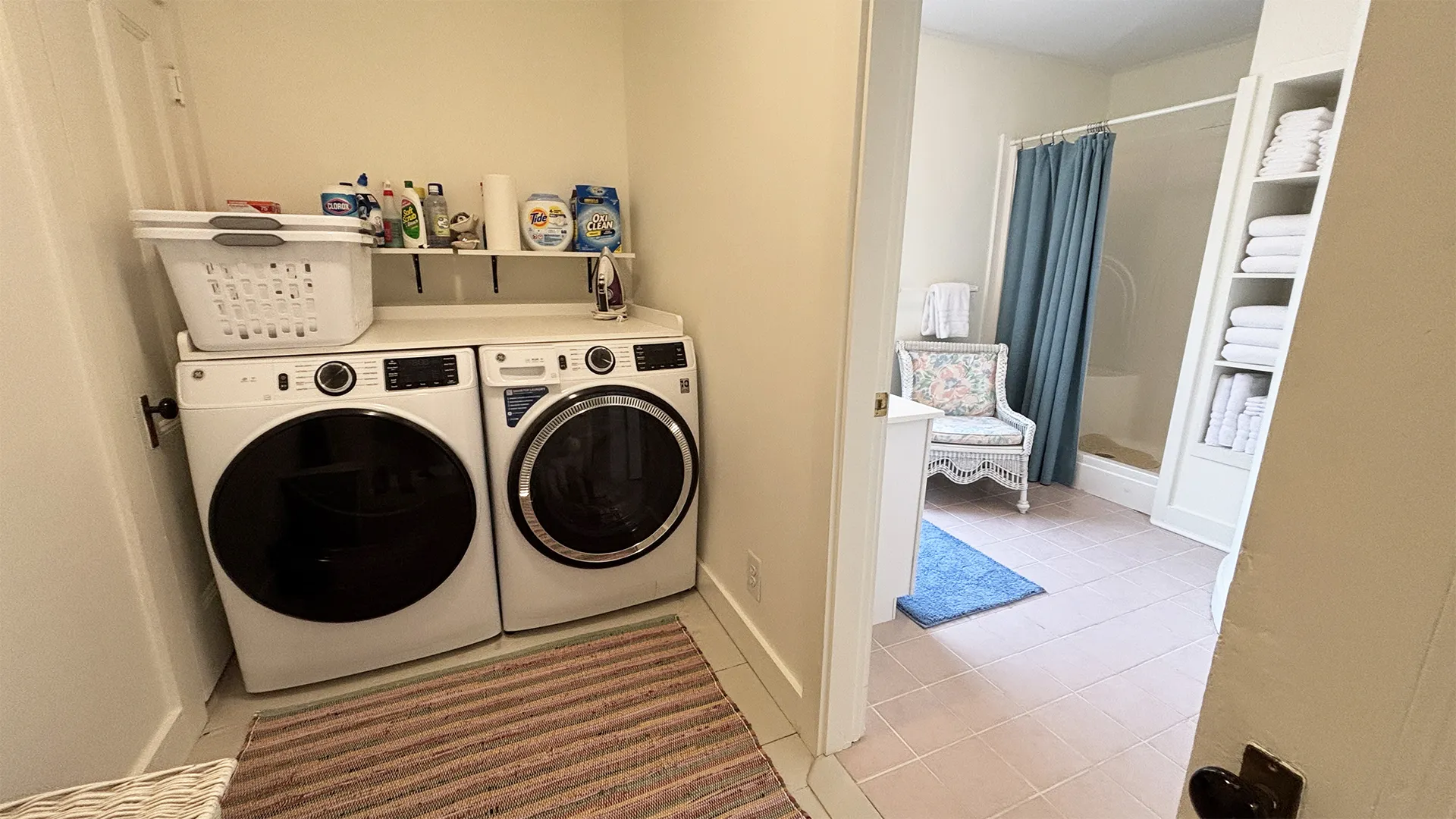 SECOND FLOOR: Stairs from the Living Room lead to three bedrooms and two full baths. Bedroom 1 features a King Bed. Bedroom 2 offers a Double Bed. These two bedrooms share a Full Bath with walk-through Laundry area and walk-in shower stall. Bedroom 3 has Twin Beds. Situated at the end of the hall is a sweet nook with desk that leads to a Full Bath with combined tub and shower.
