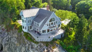FIRST FLOOR: From the tiled entryway one is immediately drawn through the foyer and into the Sunroom with stunning views across the Bay to Egg Rock Lighthouse and the Schoodic Peninsula, where a built in window seat invite one to sit and enjoy. Designed to catch every aspect of Frenchman Bay, the first floor features a very open, airy style – perfect for entertaining or quiet relaxation. To the left of the Sunroom is the huge, light filled Great Room with access to the deck with amazing views north along the coast, past the Thrumcap to the Porcupine Islands and the mountains of the mainland, unobstructed from every perspective. To the right of the Sunroom is the Dining Room with seating for 8, views to the lighthouse, and access to the south deck with propane grill. Past the Dining Room is a fully equipped Kitchen with granite counters, maple cabinetry, Viking range, granite topped island, and many added conveniences such as wine refrigerator, trash compactor and customized built-in wine rack. The pocket doors can be left open for views of the water or closed adding more separation from the Dining Room. A half bathroom is located just off the main entry.
