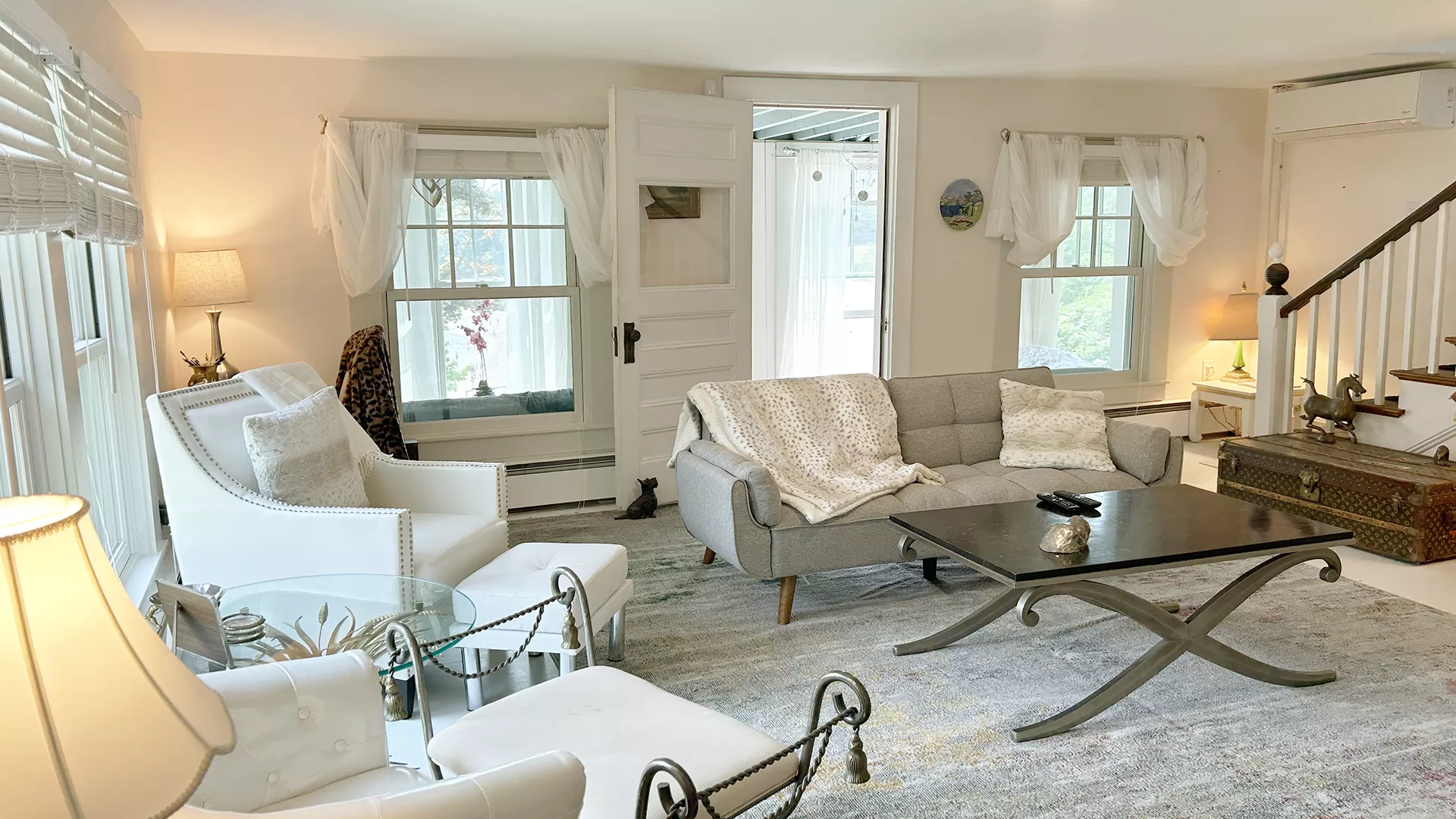 FIRST FLOOR: Entry from the driveway leads through a “mudroom” for stowing outdoor gear to a well-stocked Kitchen with breakfast table that seats two. Adjacent to the Kitchen are two rooms: a comfortable and splashy Living Room with mini-split AC unit, TV, gas-powered fireplace, and a Dining Room with table that seats five, six in a pinch. At the front of the house, a three-season porch with wonderful views across the harbor is a great spot to enjoy your favorite beverage and a good book or conversation! Stackable washer/dryer is located in kitchen area.