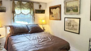 SECOND FLOOR: Primary Bedroom with King Bed, water views. The “Seaglass Room” features a Queen bed. The “Horse Room” features a Double bed and mini-split AC unit. Bathroom with combined tub and shower.