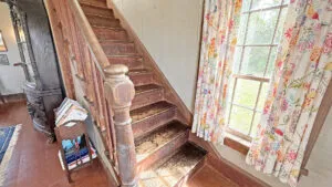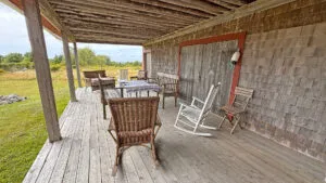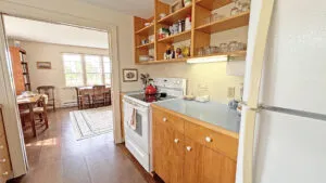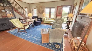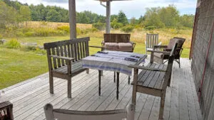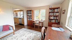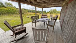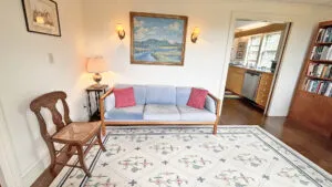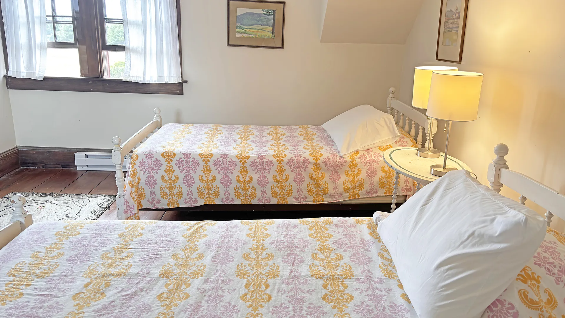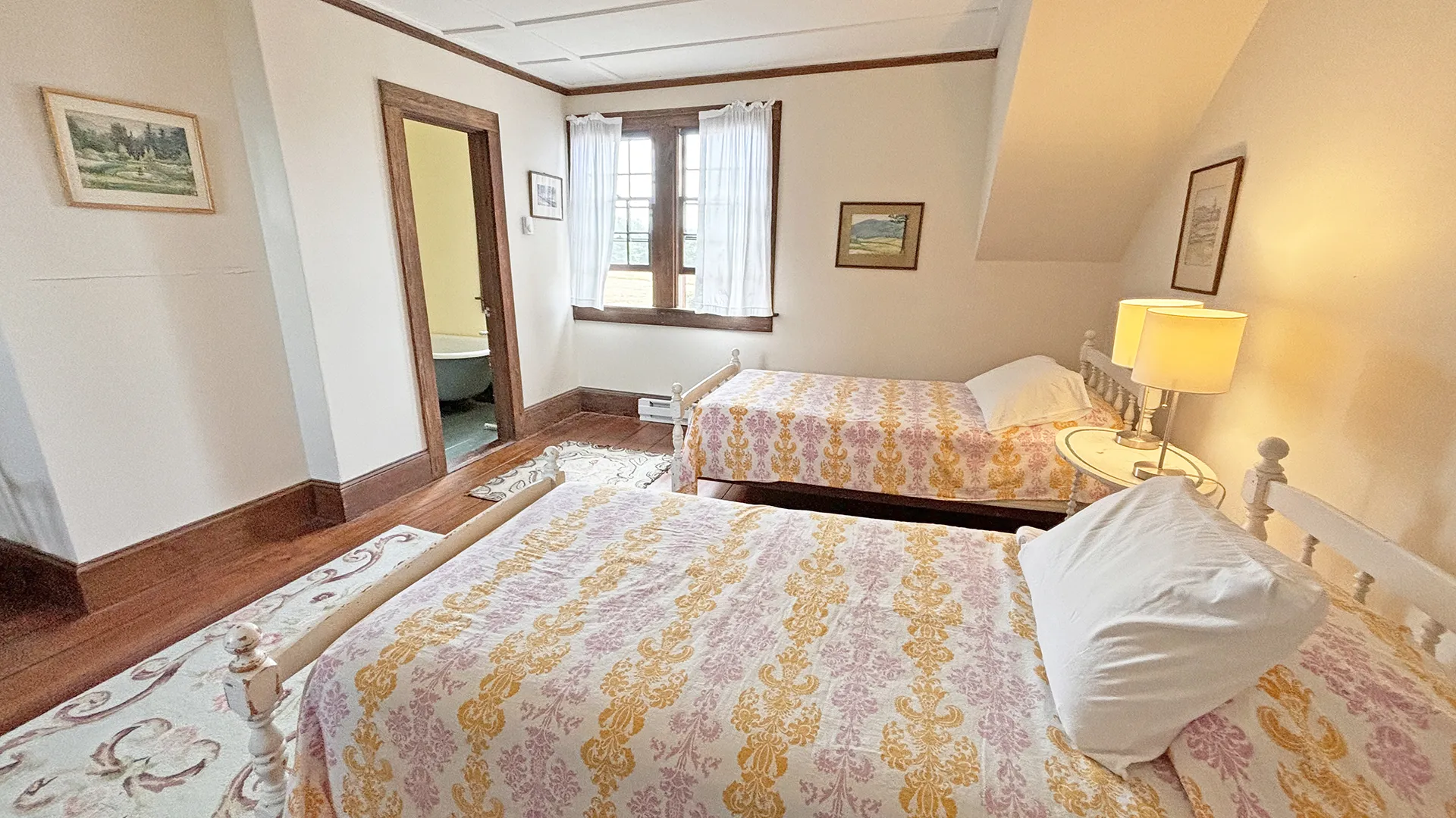 FIRST FLOOR: Entrance leads to a Living Room with fireplace and beautiful landscape and seascape murals of Mt. Desert Island. From this room, a door leads to the covered porch. To the right of the Living area is a Bedroom with Twin Beds and door to the porch. Just beyond the Living area is an updated Full Bath with combined tub and shower. Next is a combined Sitting and Dining Area with small table overlooking the hills which can expand easily to seat 8 people. Well-equipped Kitchen leads to the aforementioned shared Laundry area.SECOND FLOOR: Stairs from the Living Room lead to two Bedrooms, one with a Queen Bed and one with Twin Beds. These bedrooms share a “jack and jill” Full Bath between them with a tub only. Both bedrooms have distant mountain and rural views. (Note: there are no connecting doors to the second floor of Sunset Farm East.)