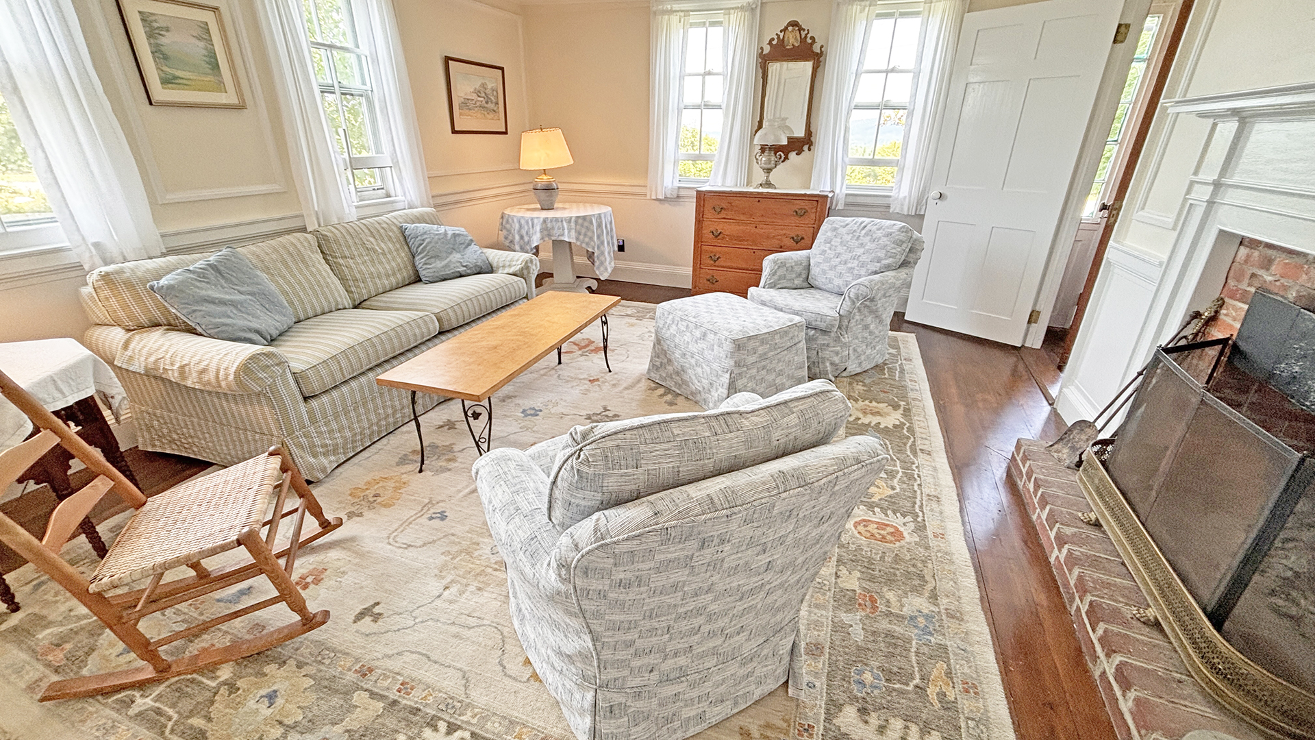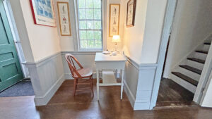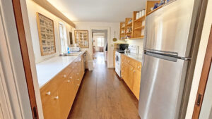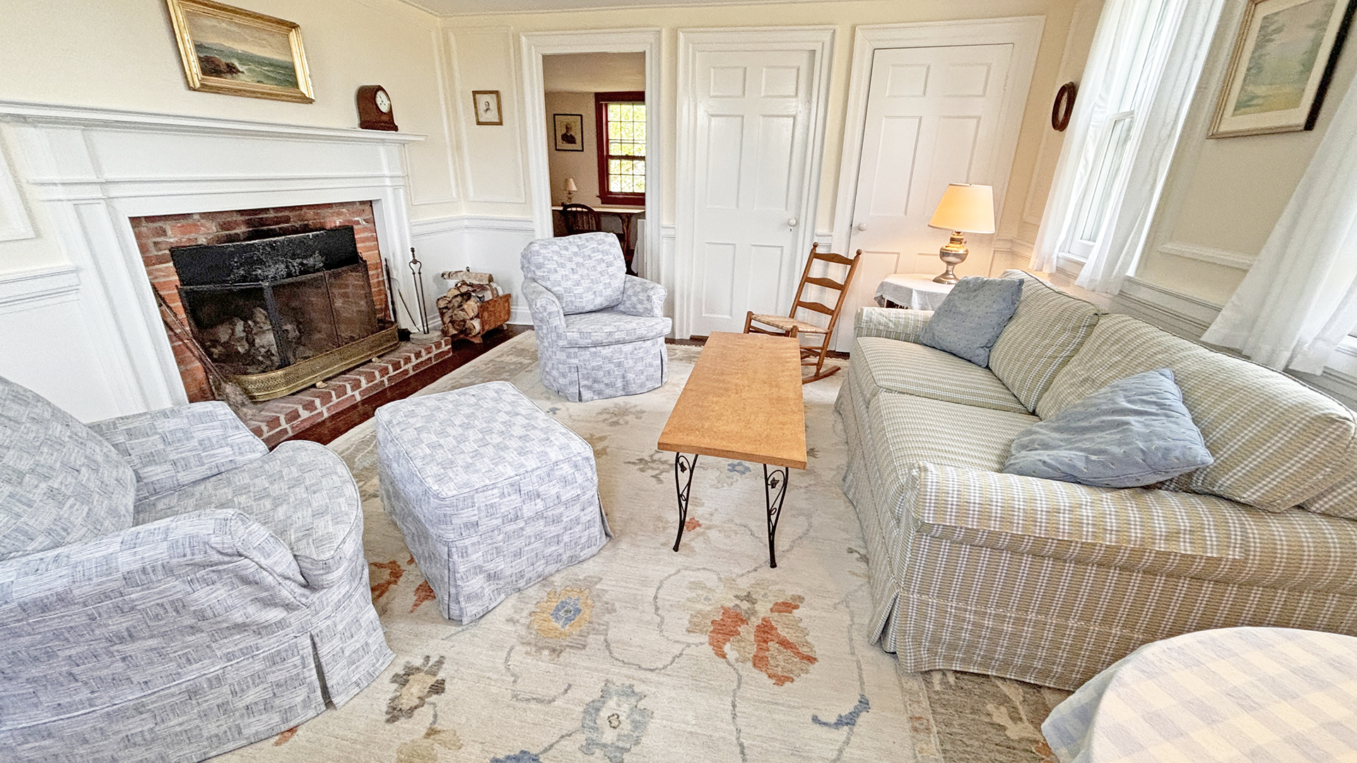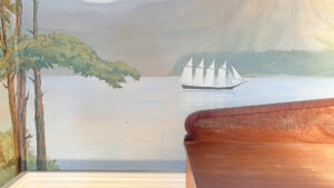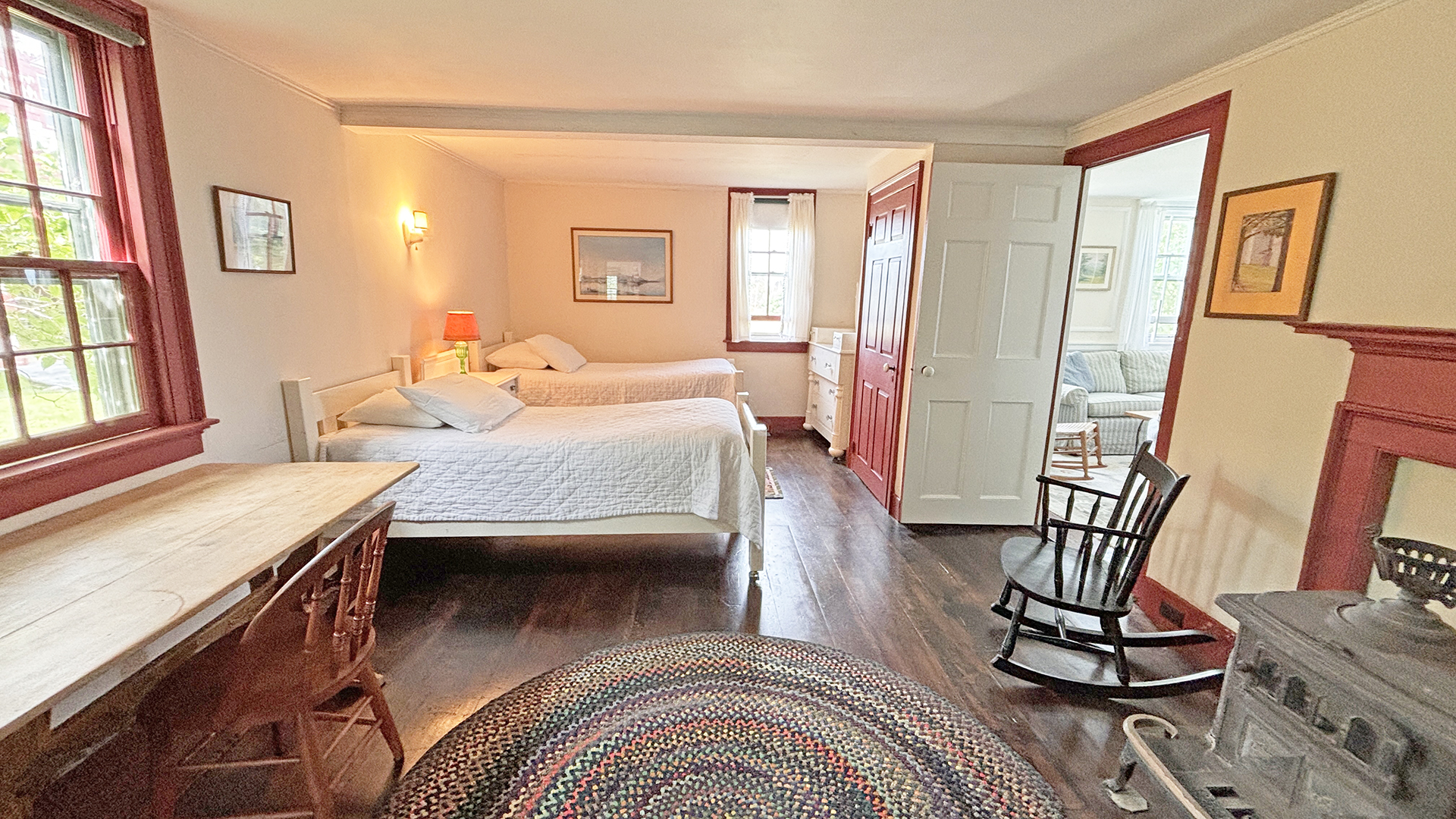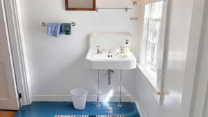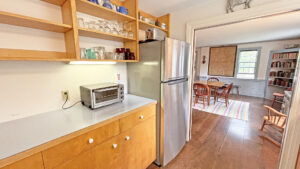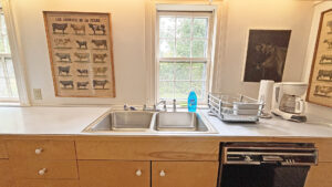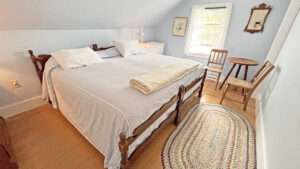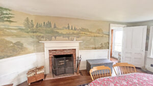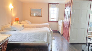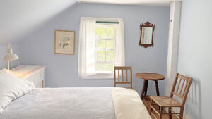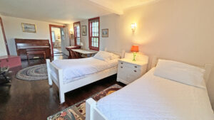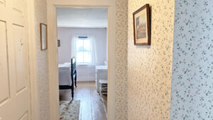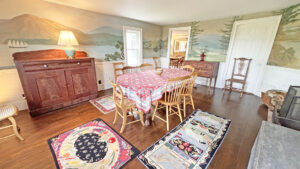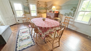 FIRST FLOOR: Living room with mountain views and comfortable seating for six leads to a semi-formal Dining Room with stunning hand-painted, historic mural depicting rural life on Mt. Desert Island. Steps further, a breakfast room serves as a more intimate spot for dining or game play around its small table. Adjacent to the Living Room is a Bedroom with Twin Beds. Off the back entry hall is an updated Full Bath with combined tub and shower. Beyond the Breakfast Room is an updated Kitchen, well-stocked for meal prep. A Laundry room, shared with Sunset Farm West, is also found near the Kitchen and serves as the “buffer” space between the two residences.