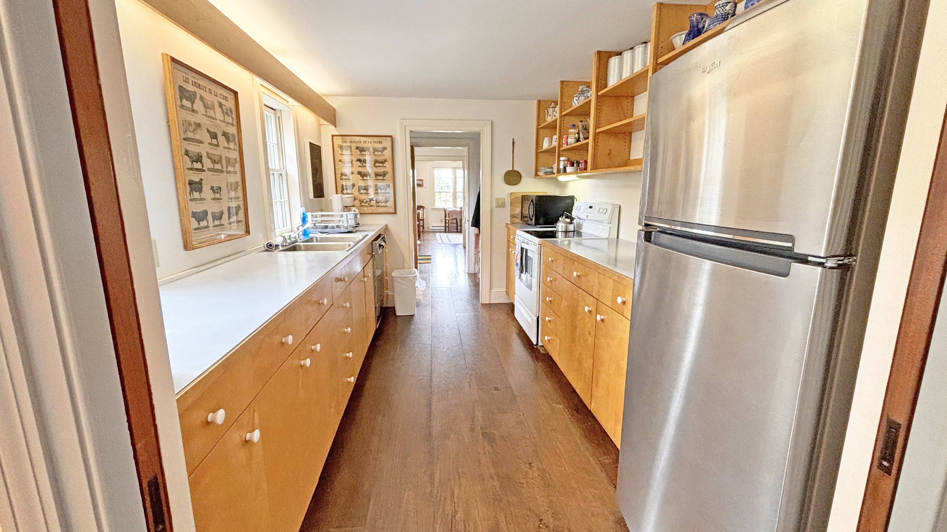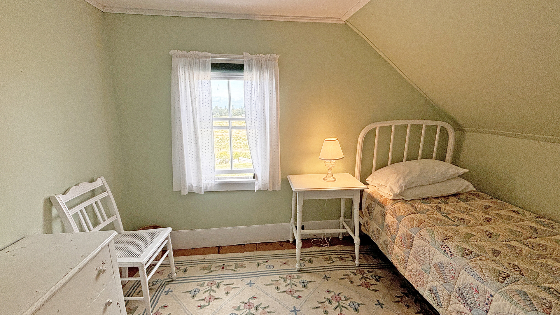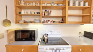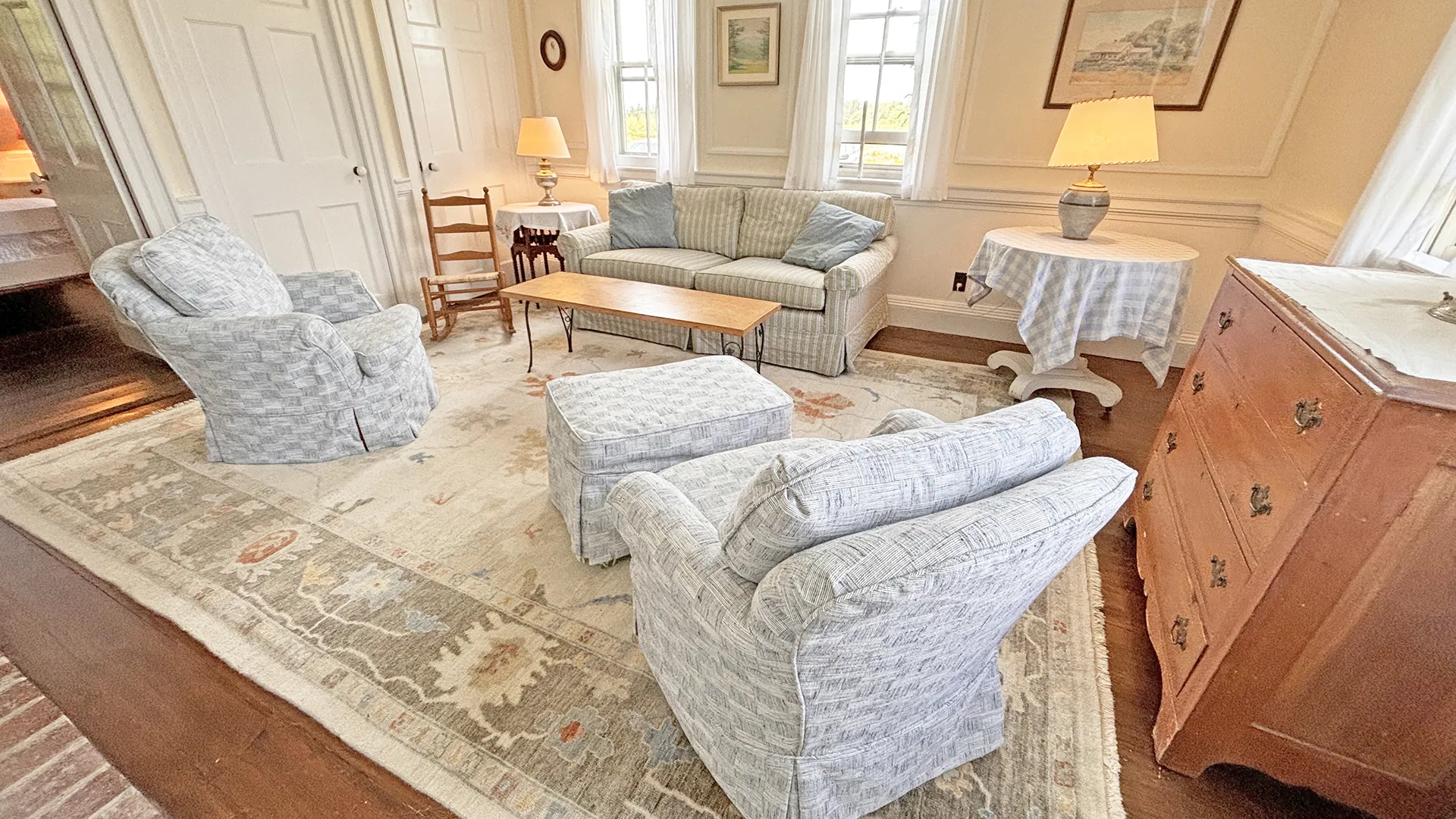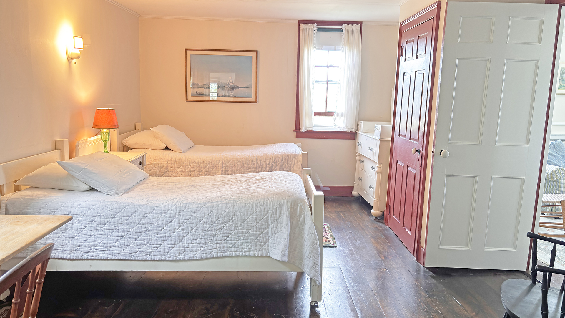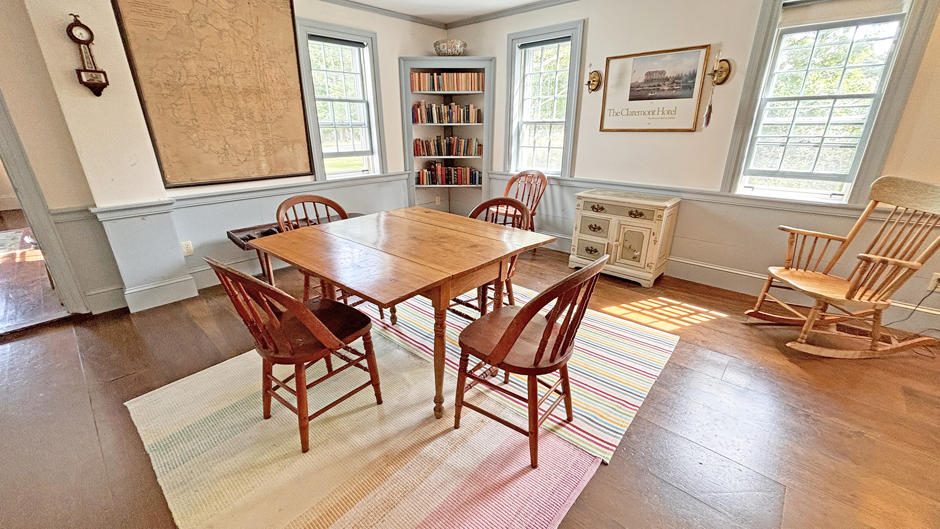 FIRST FLOOR: Living room with mountain views and comfortable seating for six leads to a semi-formal Dining Room with stunning hand-painted, historic mural depicting rural life on Mt. Desert Island. Steps further, a breakfast room serves as a more intimate spot for dining or game play around its small table. Adjacent to the Living Room is a Bedroom with Twin Beds. Off the back entry hall is an updated Full Bath with combined tub and shower. Beyond the Breakfast Room is an updated Kitchen, well-stocked for meal prep. A Laundry room, shared with Sunset Farm West, is also found near the Kitchen and serves as the “buffer” space between the two residences.