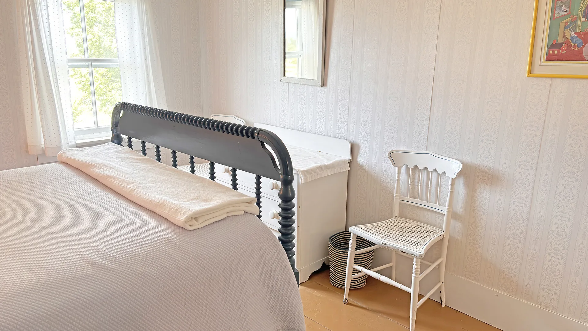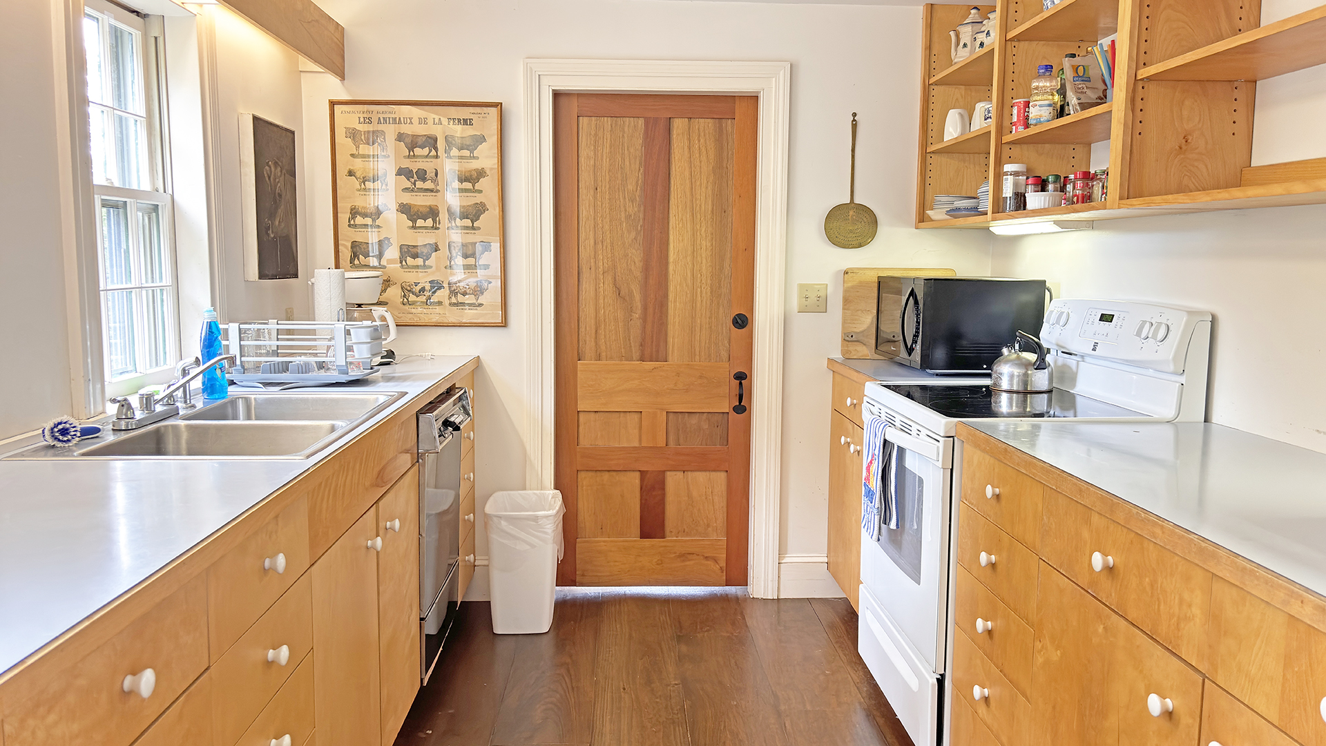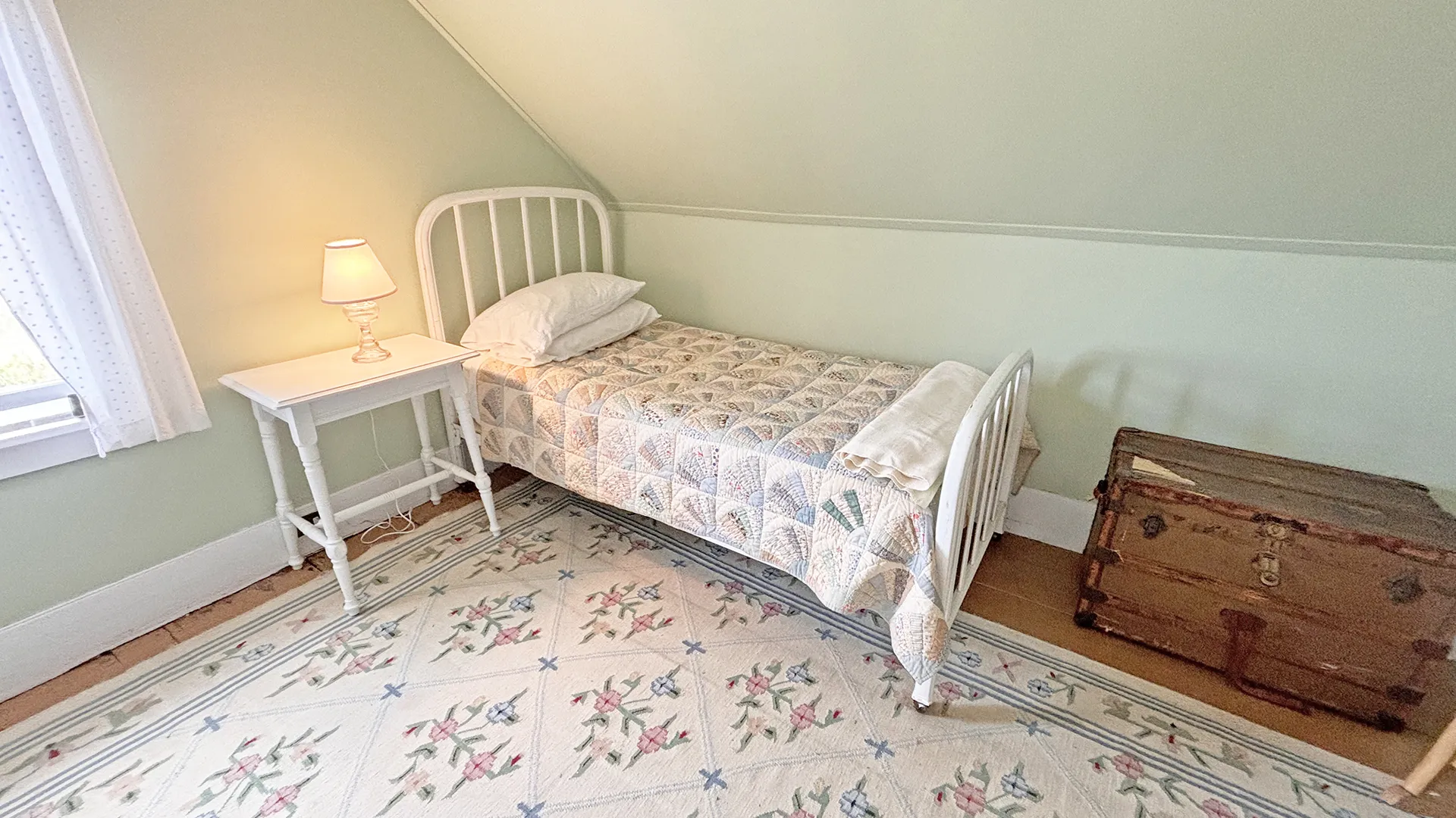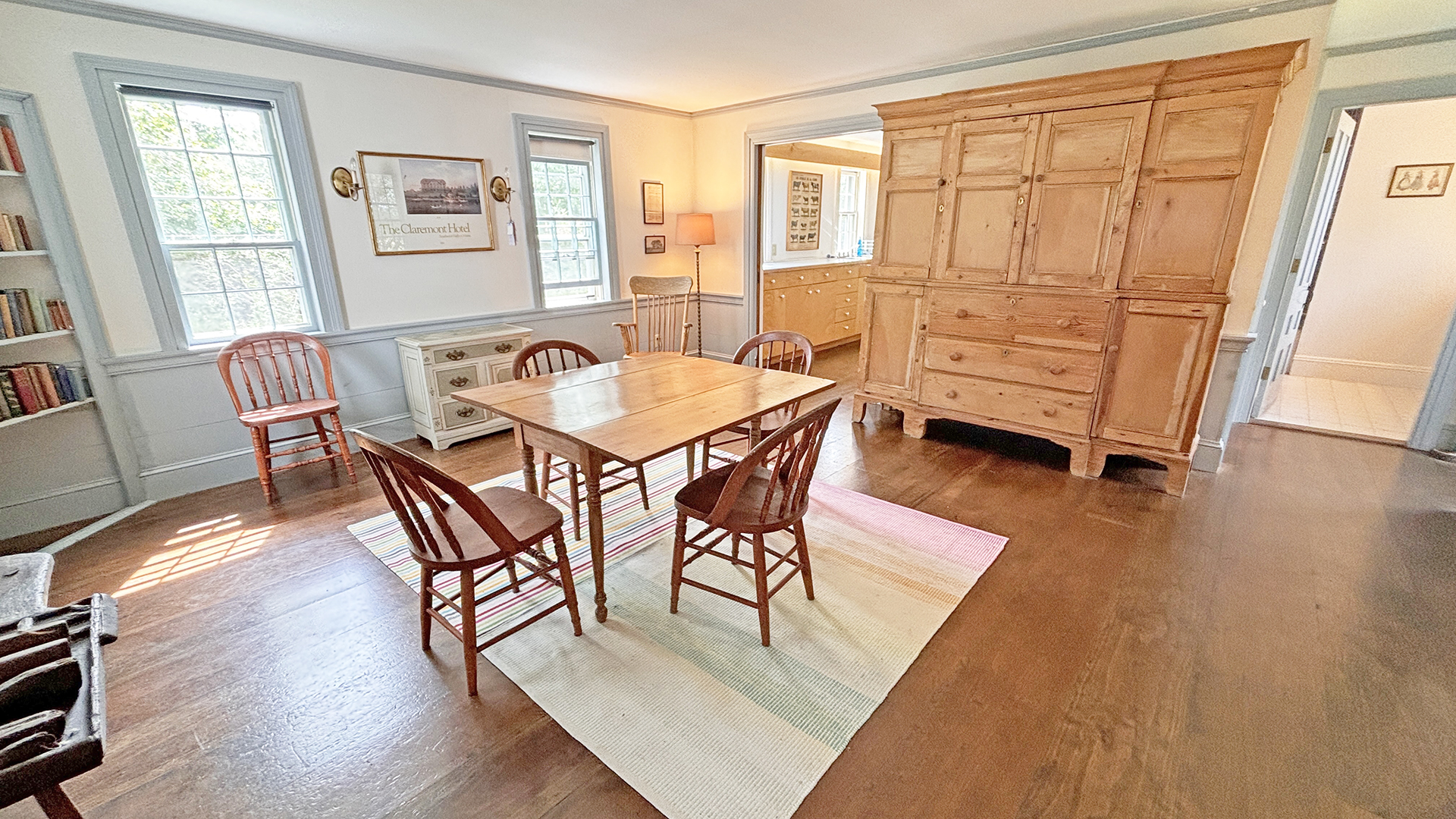 FIRST FLOOR: Living room with mountain views and comfortable seating for six leads to a semi-formal Dining Room with stunning hand-painted, historic mural depicting rural life on Mt. Desert Island. Steps further, a breakfast room serves as a more intimate spot for dining or game play around its small table. Adjacent to the Living Room is a Bedroom with Twin Beds. Off the back entry hall is an updated Full Bath with combined tub and shower. Beyond the Breakfast Room is an updated Kitchen, well-stocked for meal prep. A Laundry room, shared with Sunset Farm West, is also found near the Kitchen and serves as the “buffer” space between the two residences.