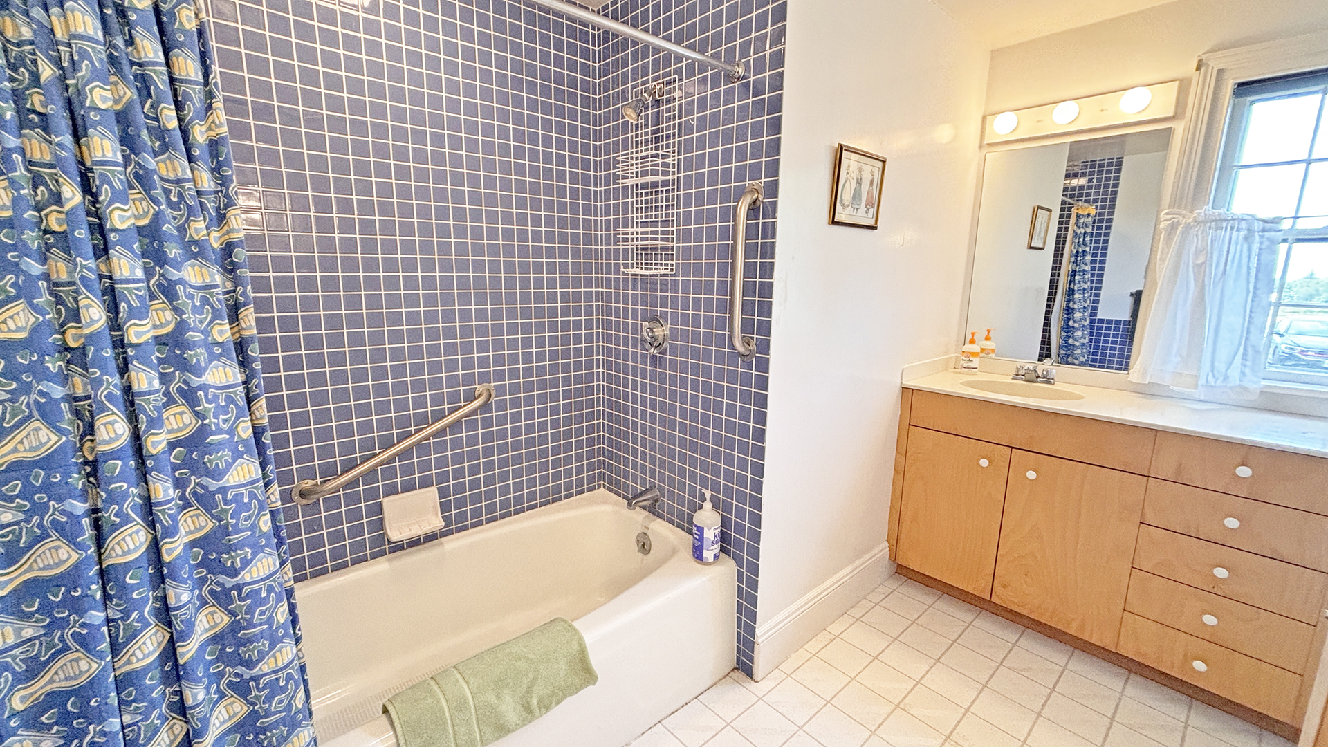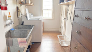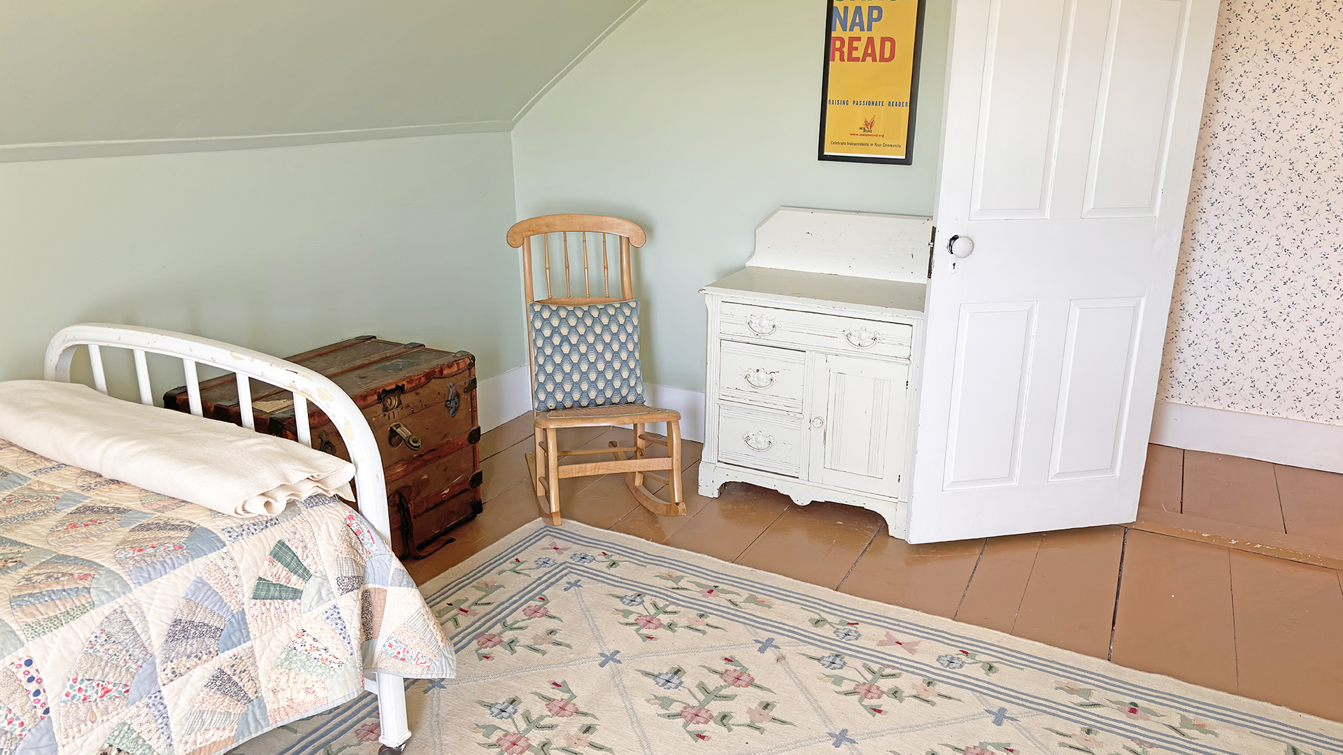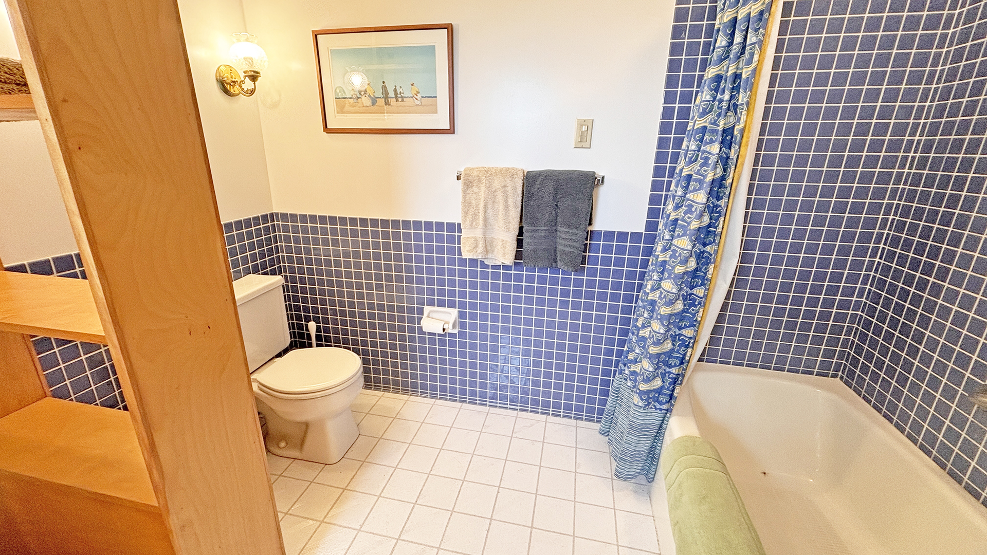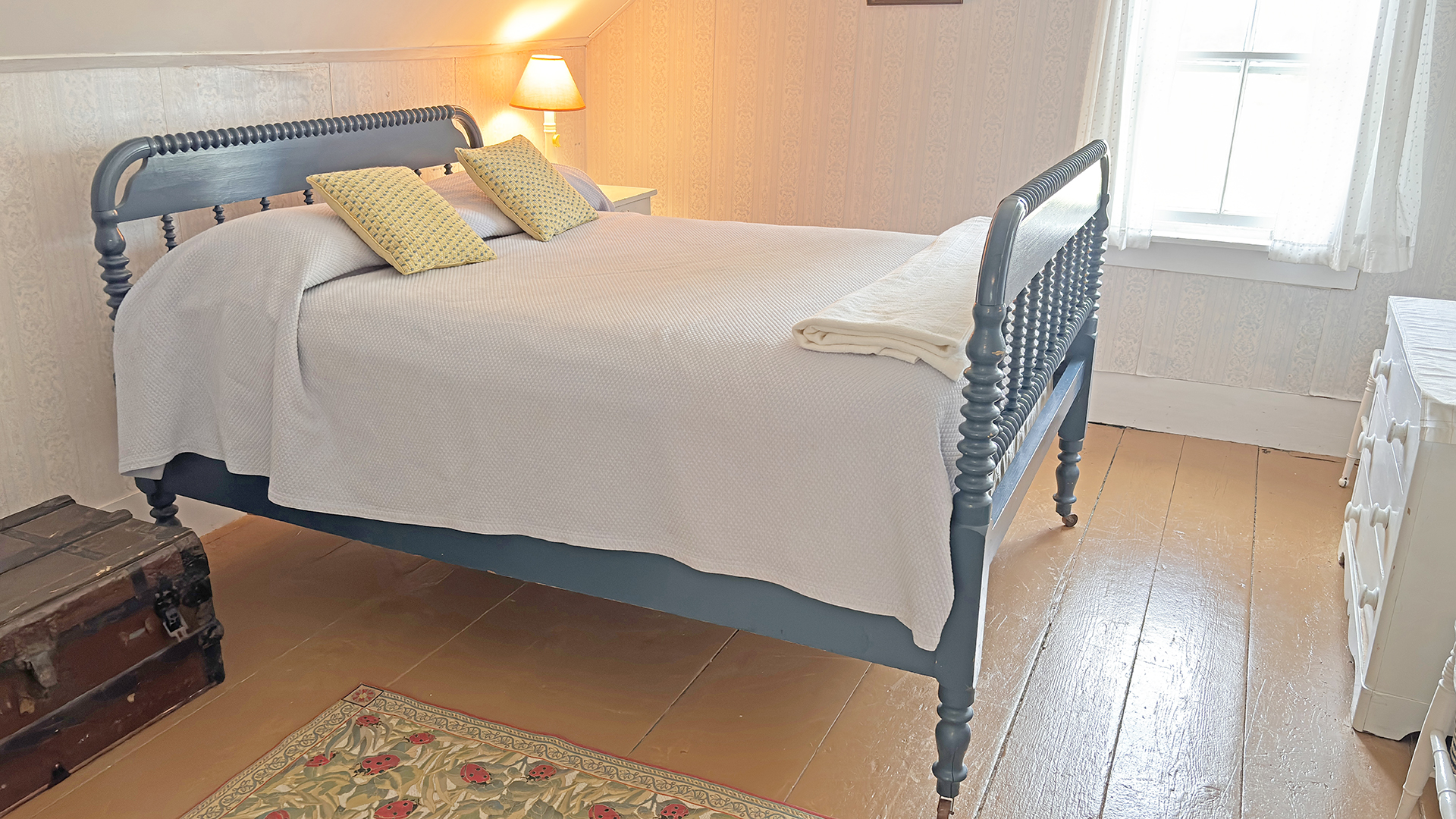 FIRST FLOOR: Living room with mountain views and comfortable seating for six leads to a semi-formal Dining Room with stunning hand-painted, historic mural depicting rural life on Mt. Desert Island. Steps further, a breakfast room serves as a more intimate spot for dining or game play around its small table. Adjacent to the Living Room is a Bedroom with Twin Beds. Off the back entry hall is an updated Full Bath with combined tub and shower. Beyond the Breakfast Room is an updated Kitchen, well-stocked for meal prep. A Laundry room, shared with Sunset Farm West, is also found near the Kitchen and serves as the “buffer” space between the two residences.